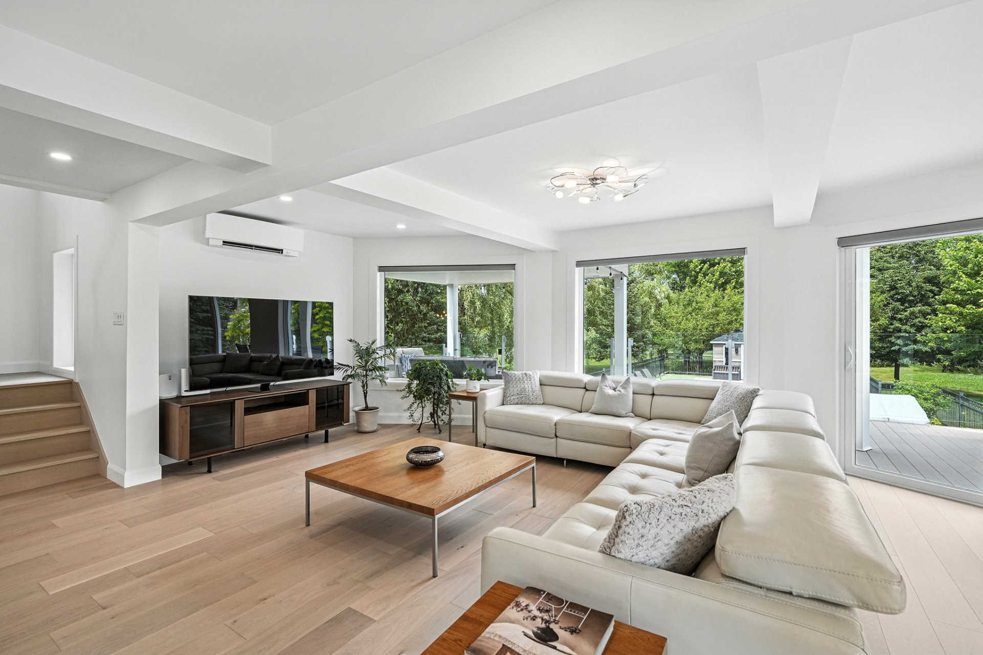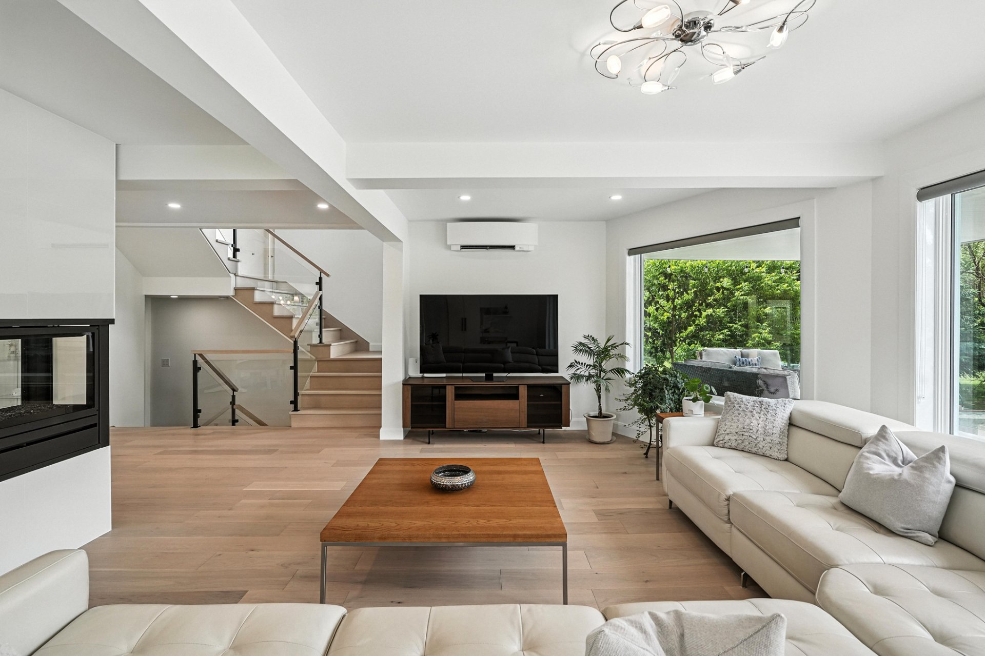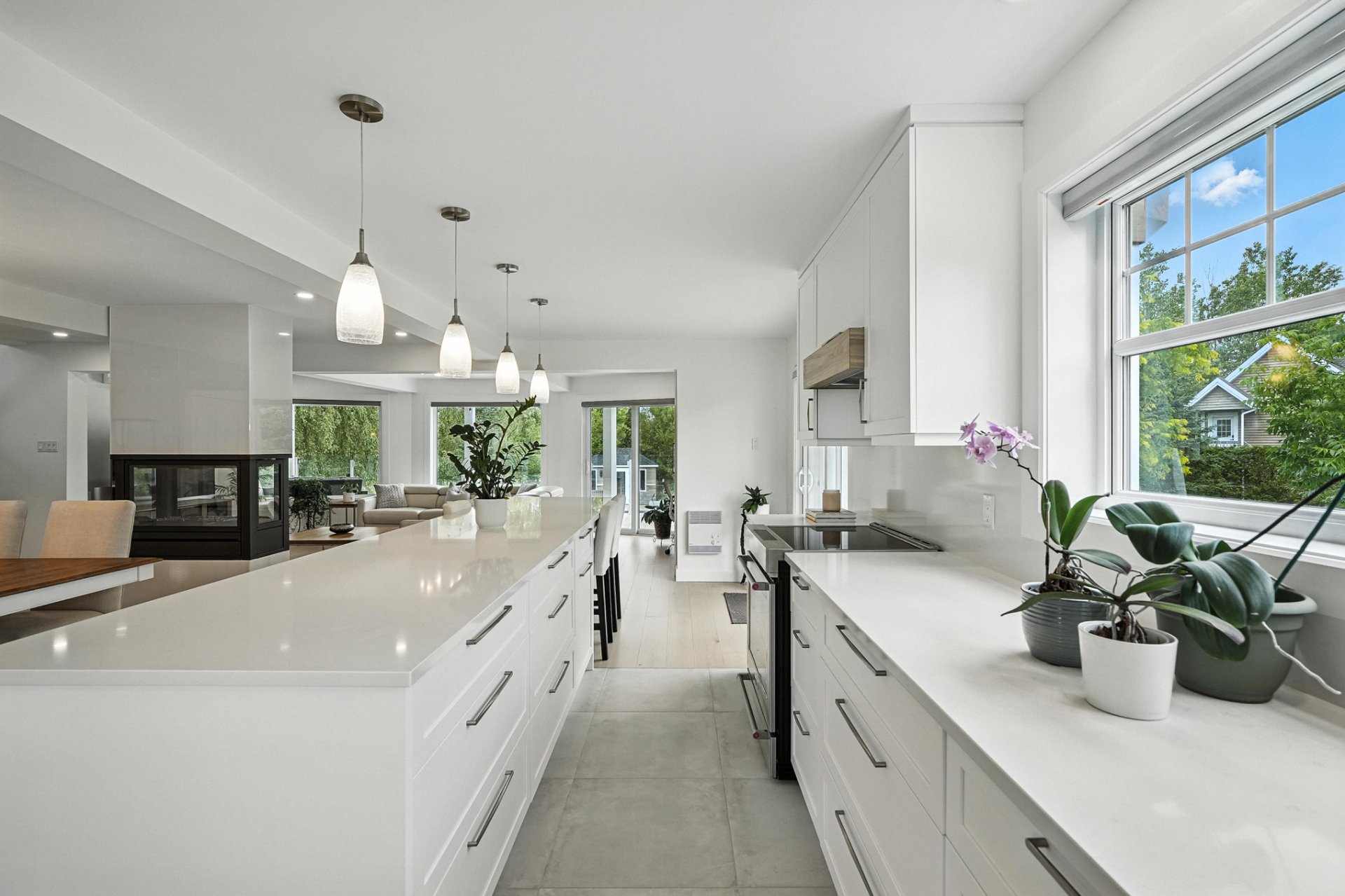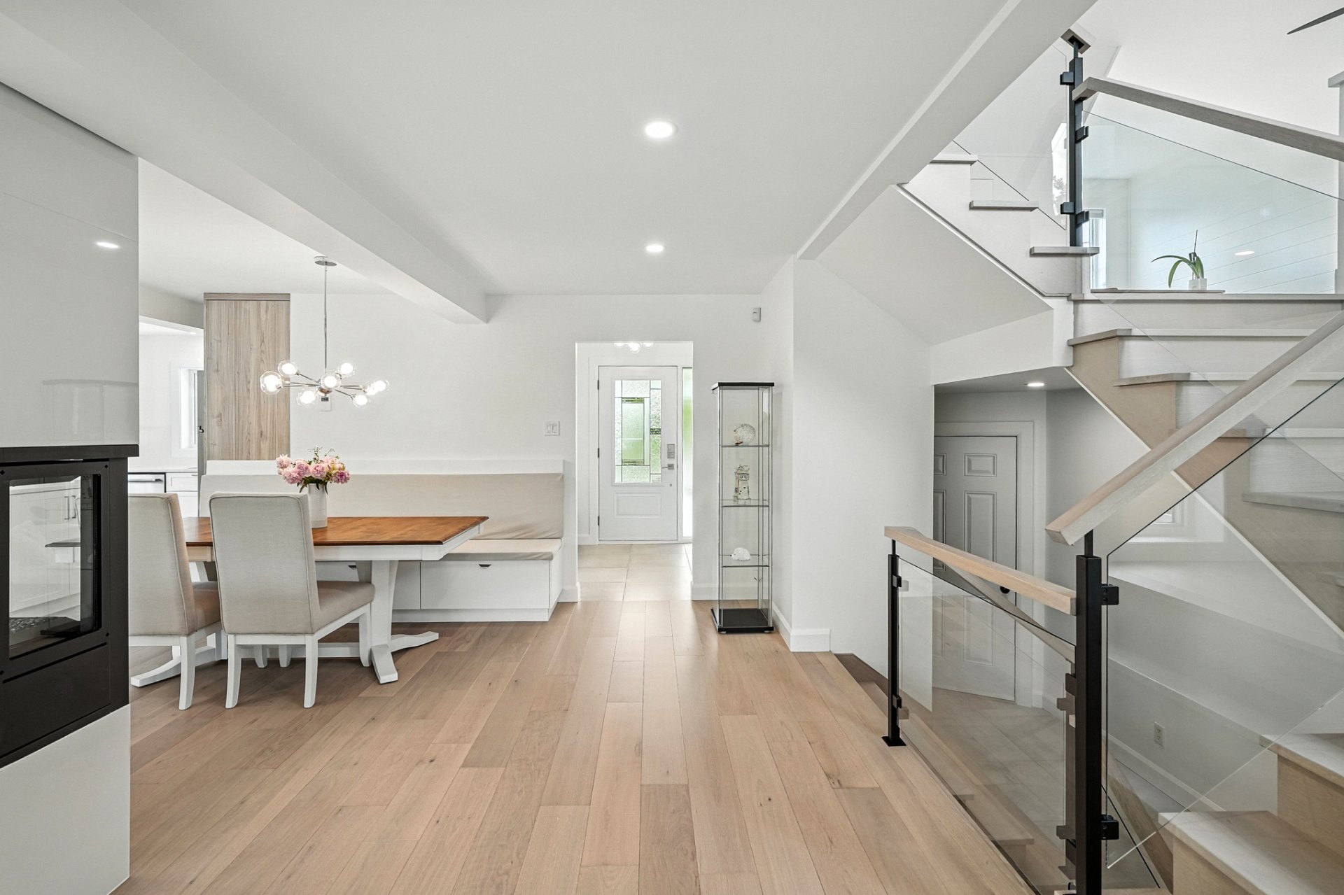 The interior design creates a calming atmosphere where light wood and clean lines combine with glass and natural light. The open-concept main floor exudes flow and warmth: a living room with a view of the pool, a four-sided gas fireplace, white oak engineered wood floors, and a thoughtfully designed kitchen featuring quartz countertops, a generous island, and ample Shaker-style cabinetry.