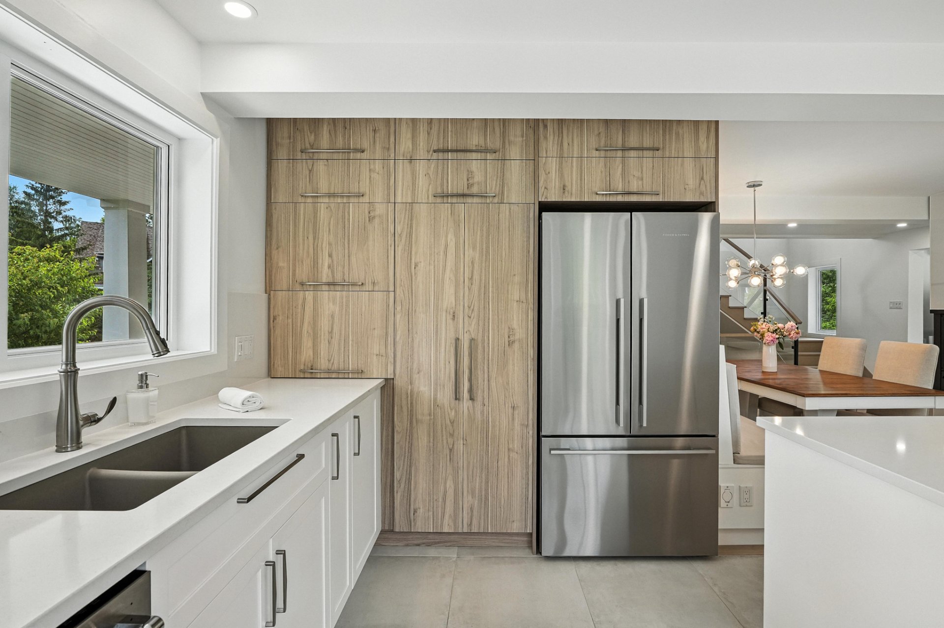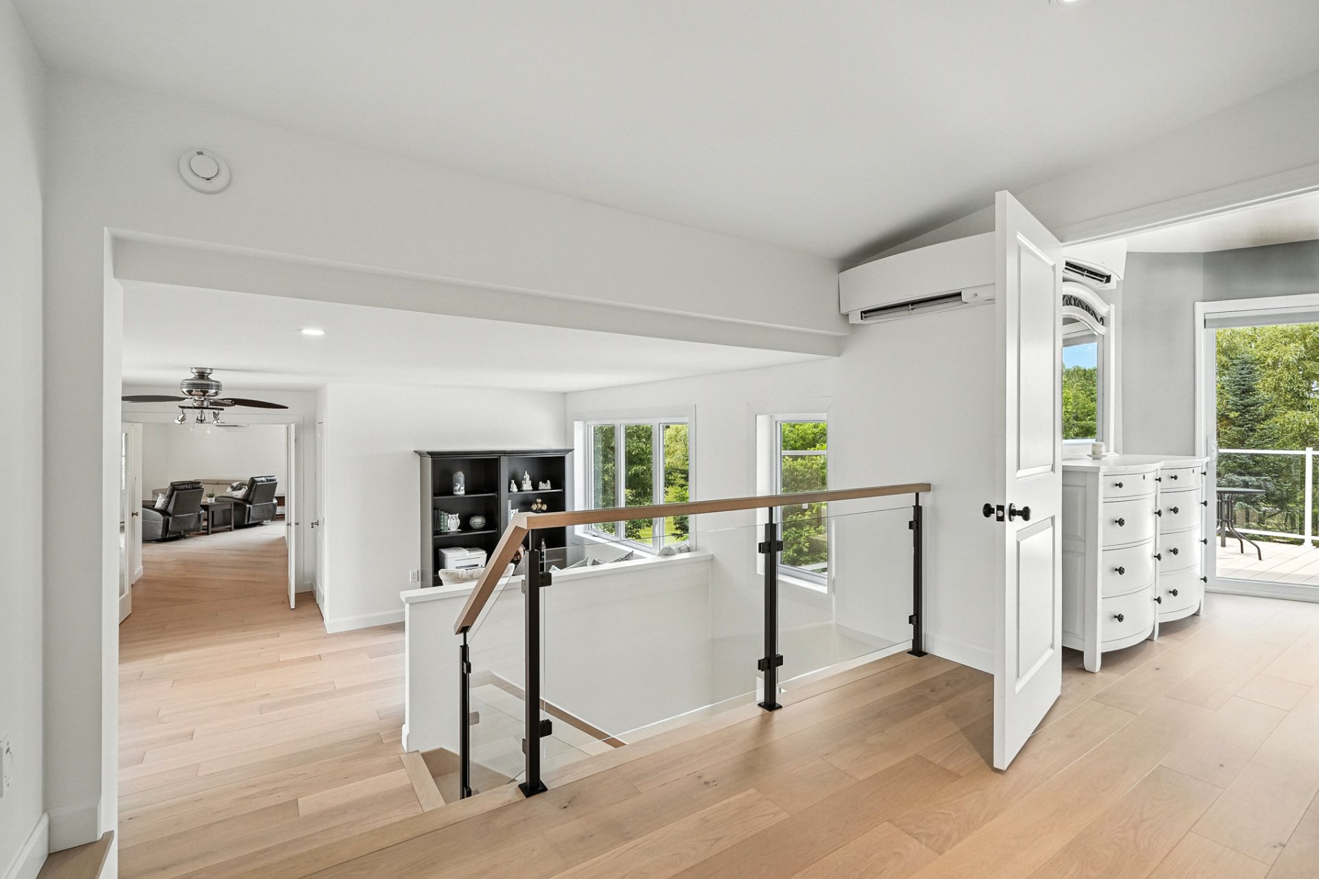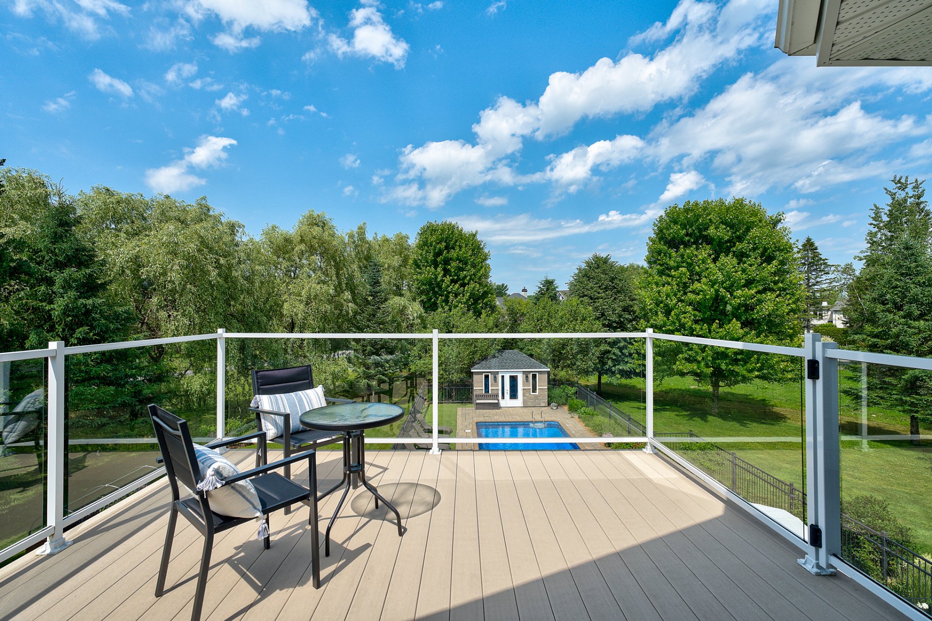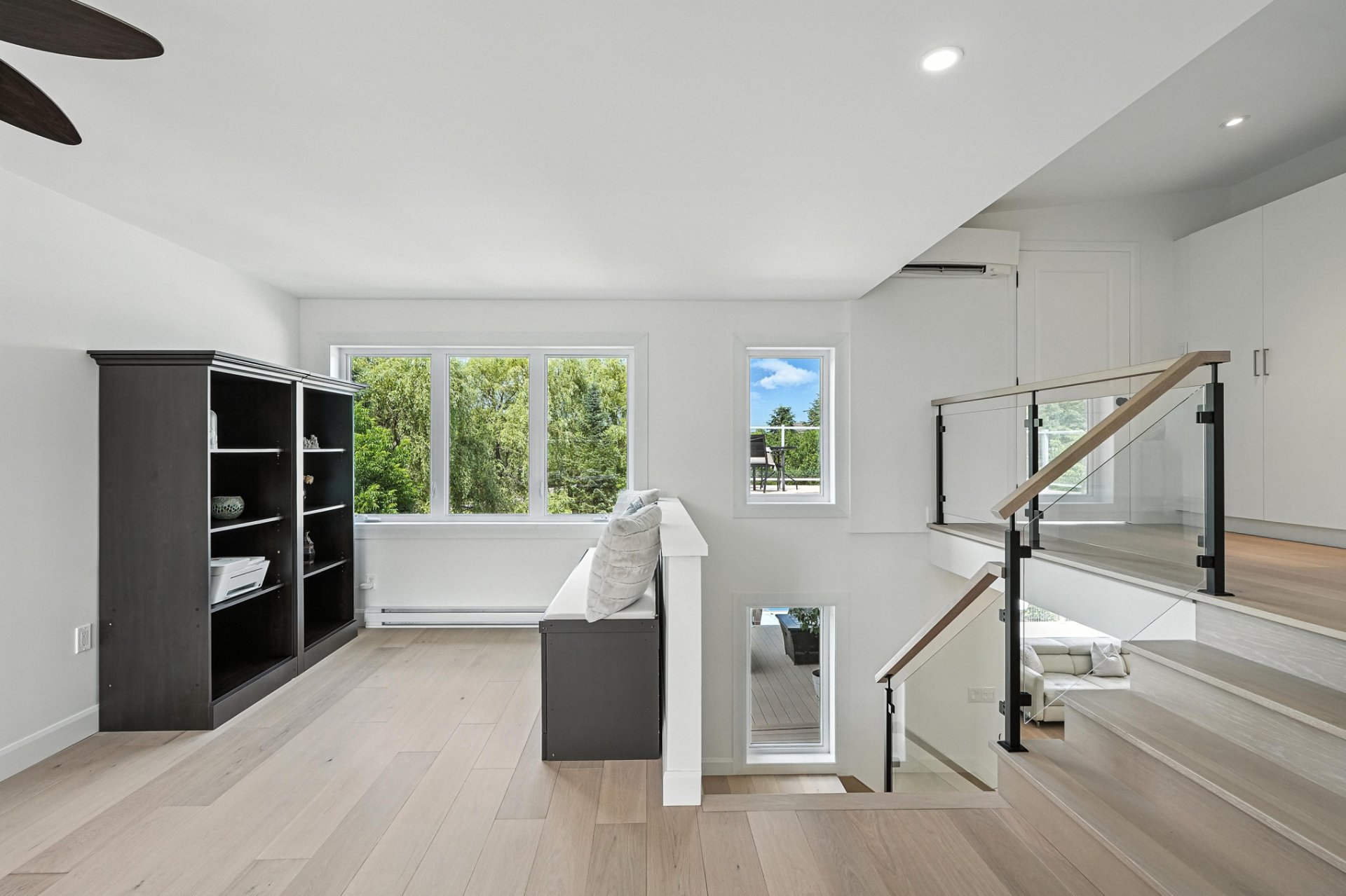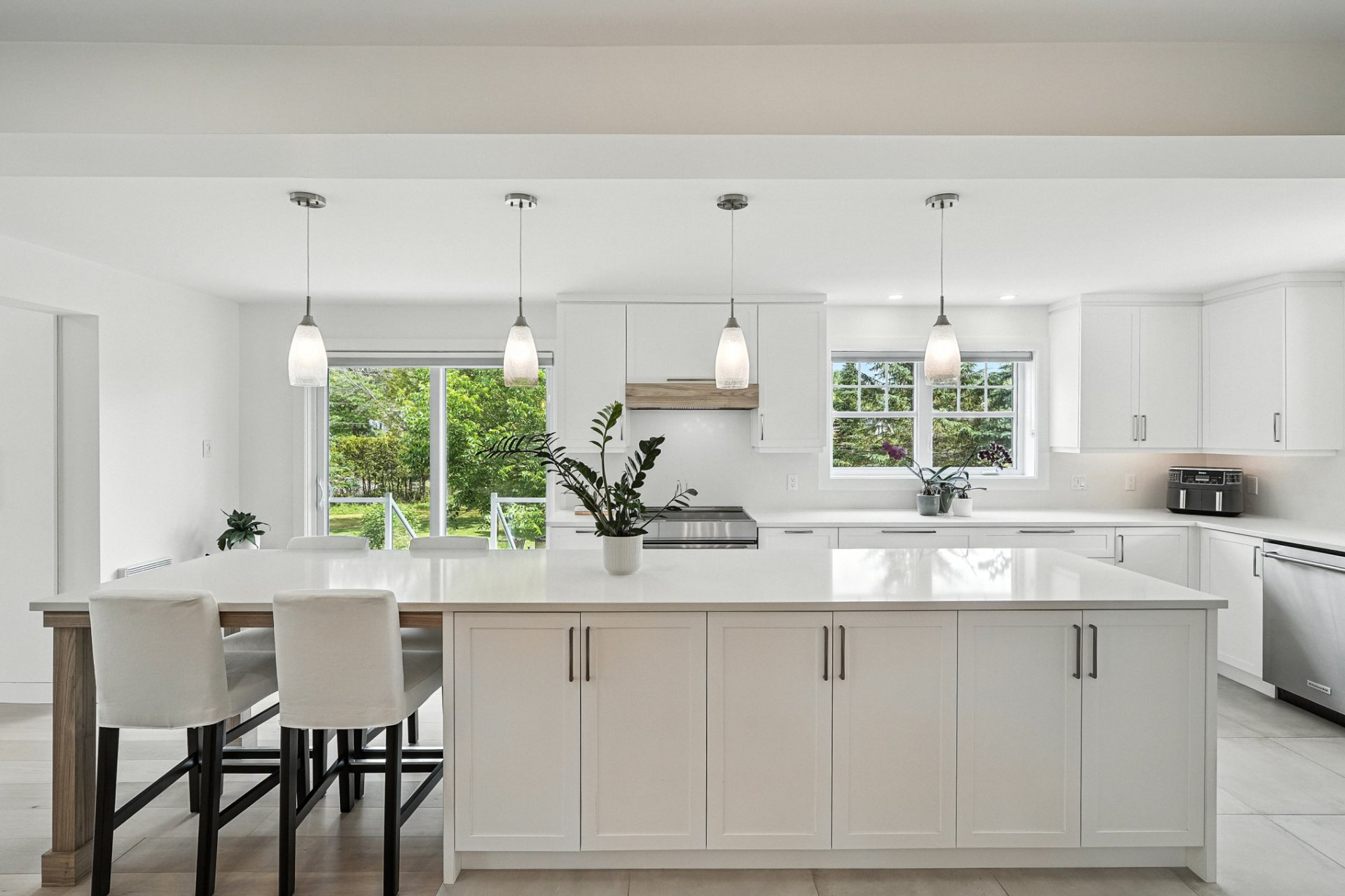 The interior design creates a calming atmosphere where light wood and clean lines combine with glass and natural light. The open-concept main floor exudes flow and warmth: a living room with a view of the pool, a four-sided gas fireplace, white oak engineered wood floors, and a thoughtfully designed kitchen featuring quartz countertops, a generous island, and ample Shaker-style cabinetry.