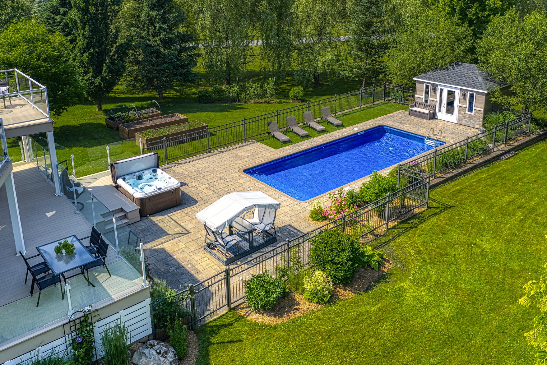The backyard offers a large, heated, saltwater 13x32 ft in-ground pool, fully fenced and surrounded by inviting lounging areas. The landscaping is meticulously maintained, featuring a variety of trees and beautiful flower gardens. With several terraces to choose from, you'll always have the perfect spot to relax or entertain outdoors!