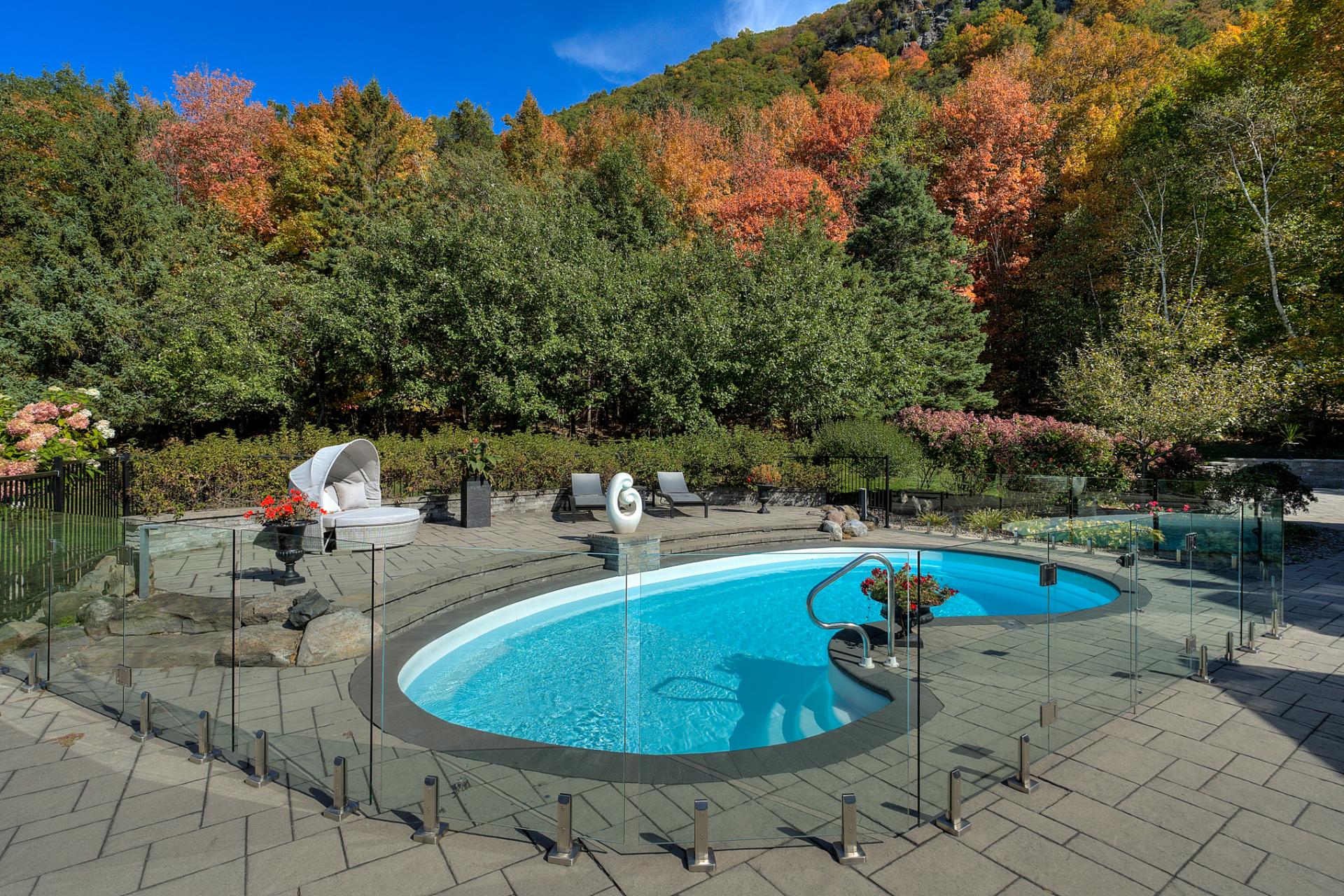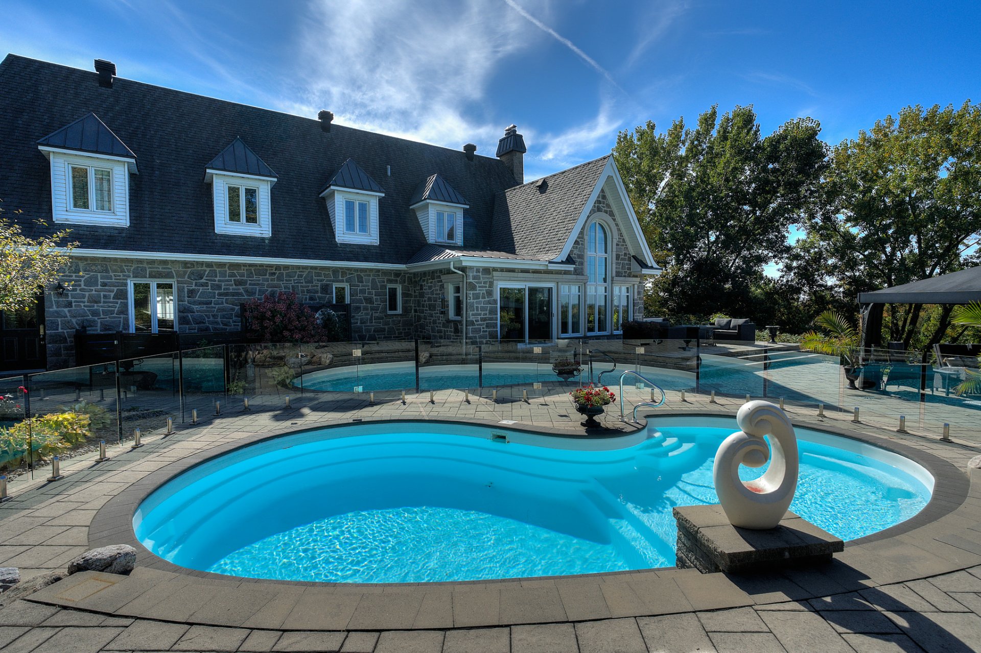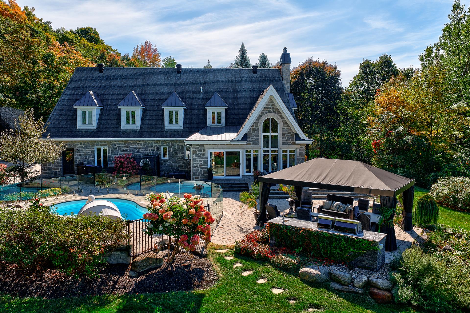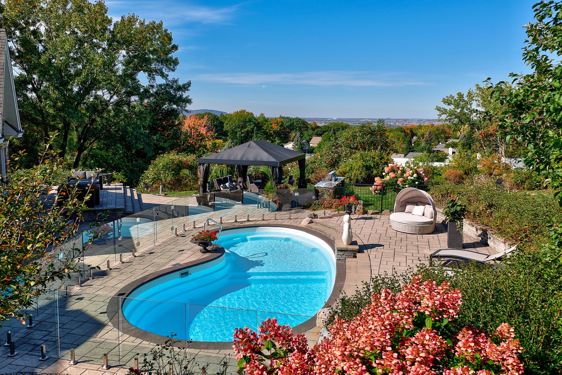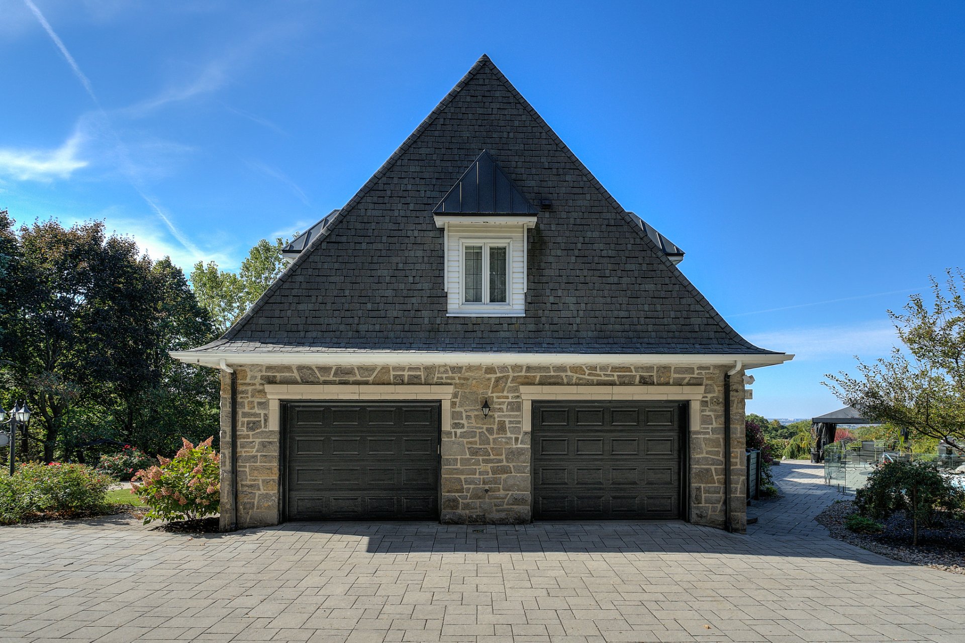 The backyard is a surefire favorite. Lined with mature trees and colorful throughout the seasons, it offers complete privacy and a breathtaking setting. The outdoor space has been designed to combine elegance and relaxation: an inviting pool, impeccable paving stones, a dining area under a gazebo for summer evenings, and several areas ideal for relaxing. In addition, there's a detached garage that can hold six cars on the ground floor, with the option of installing lifts for a possible nine-car capacity.