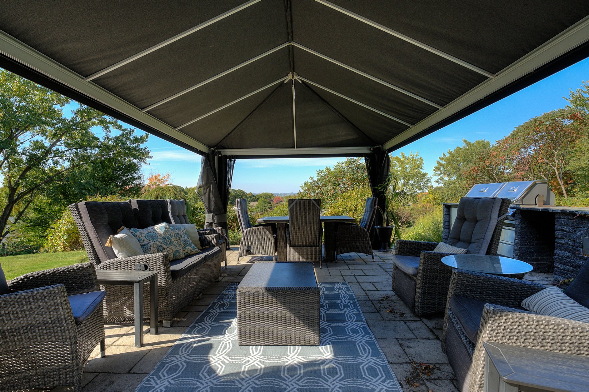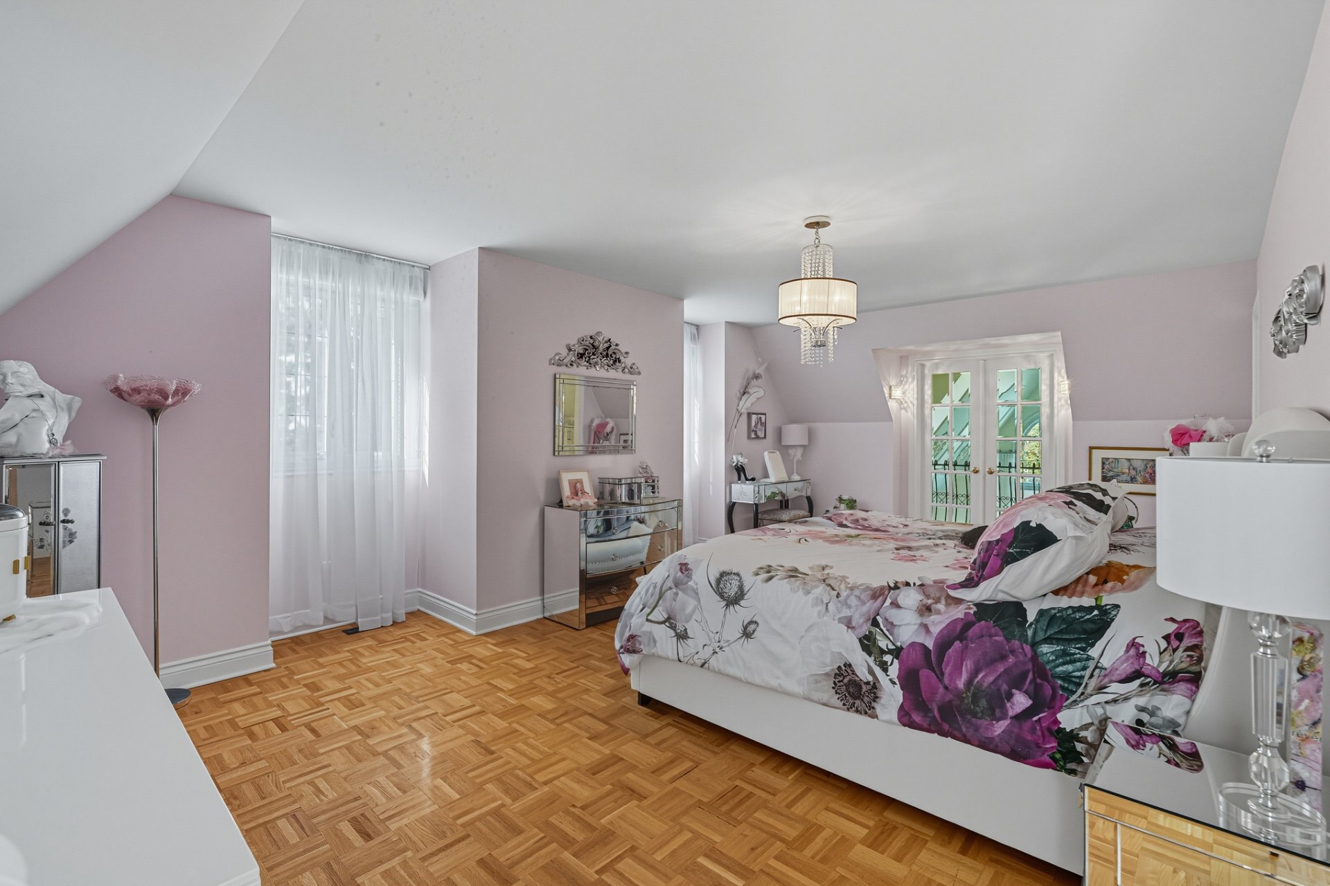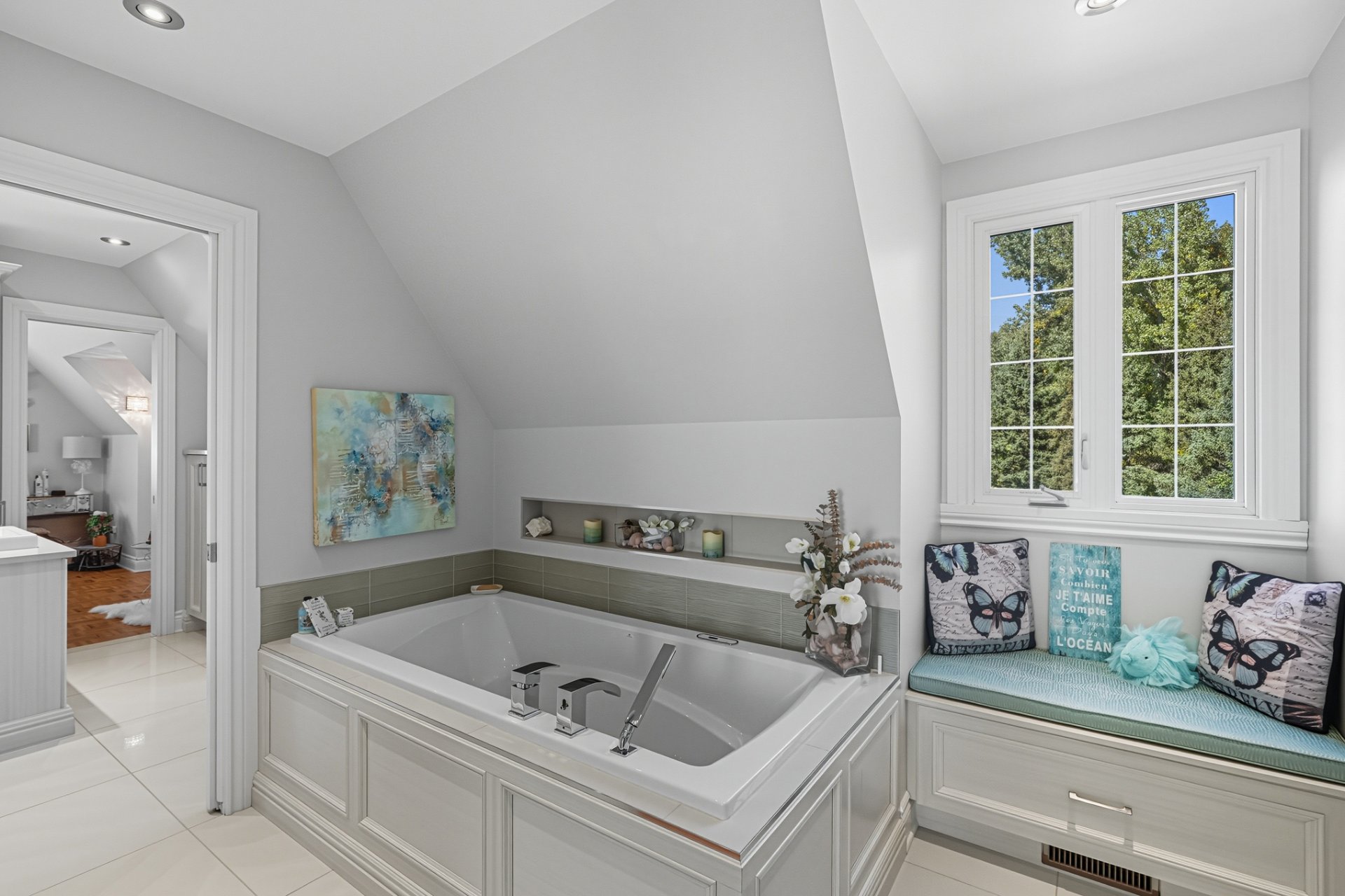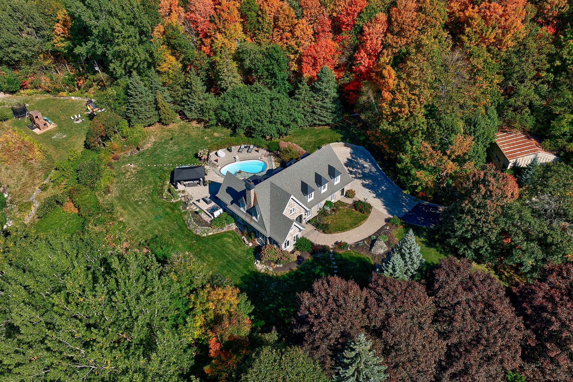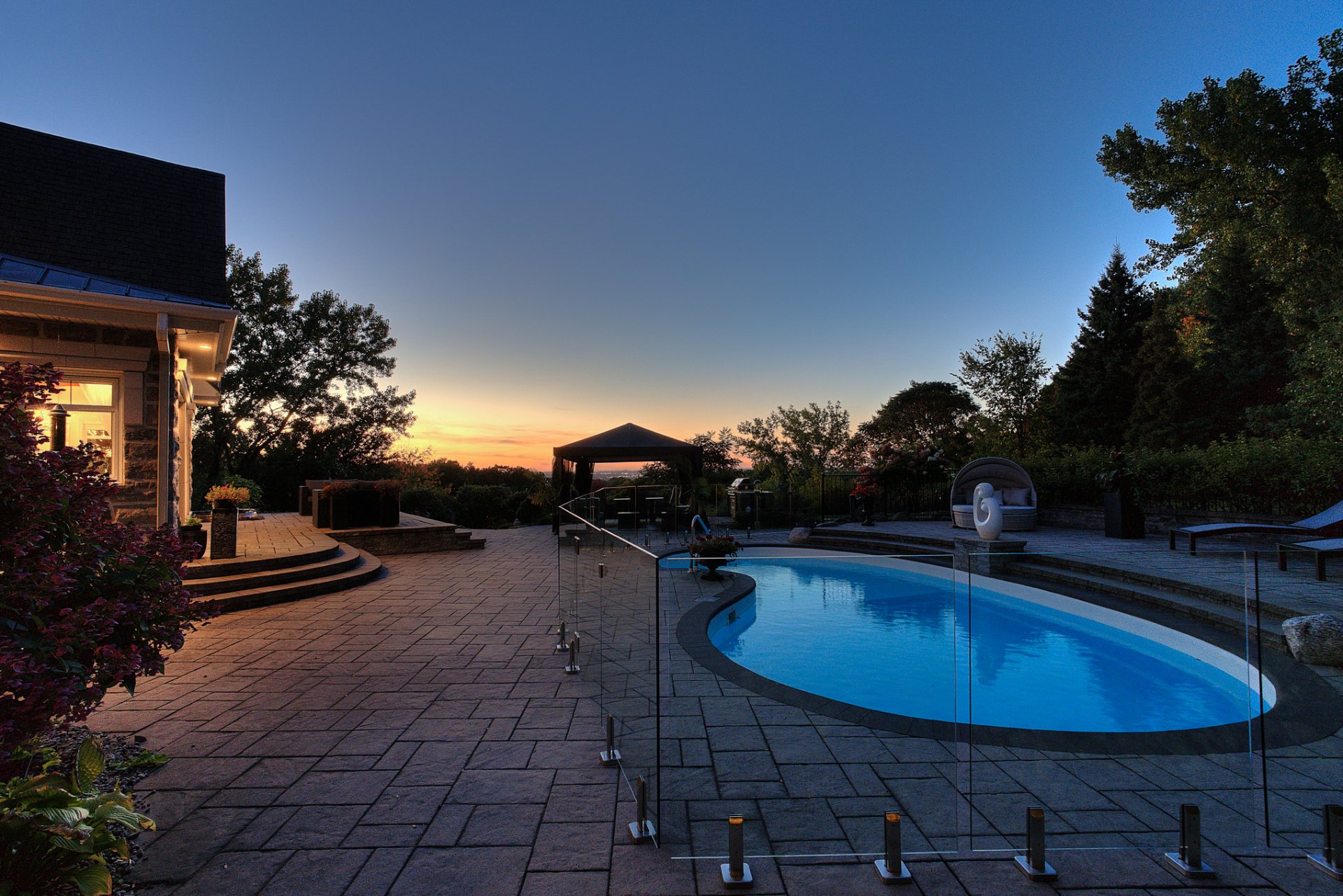 The backyard is a surefire favorite. Lined with mature trees and colorful throughout the seasons, it offers complete privacy and a breathtaking setting. The outdoor space has been designed to combine elegance and relaxation: an inviting pool, impeccable paving stones, a dining area under a gazebo for summer evenings, and several areas ideal for relaxing. In addition, there's a detached garage that can hold six cars on the ground floor, with the option of installing lifts for a possible nine-car capacity.