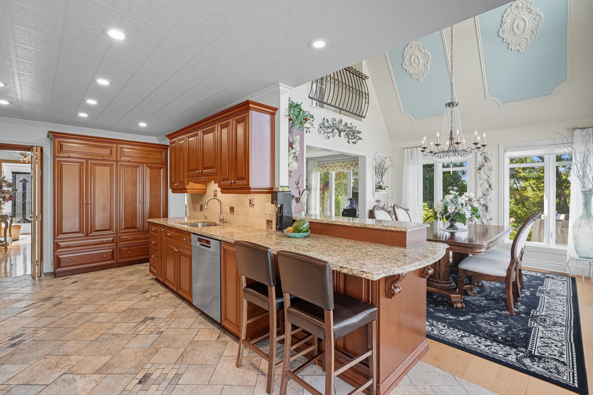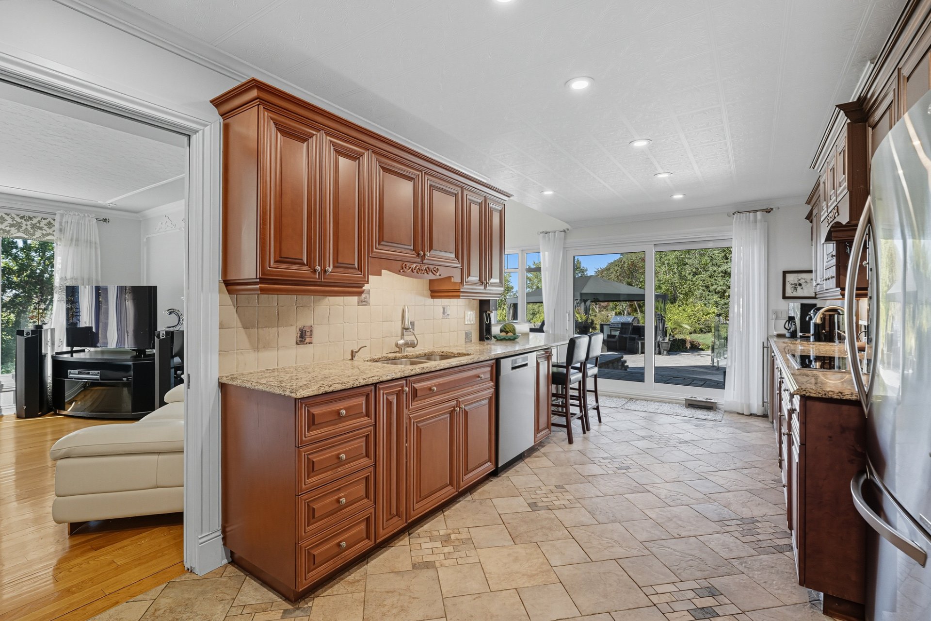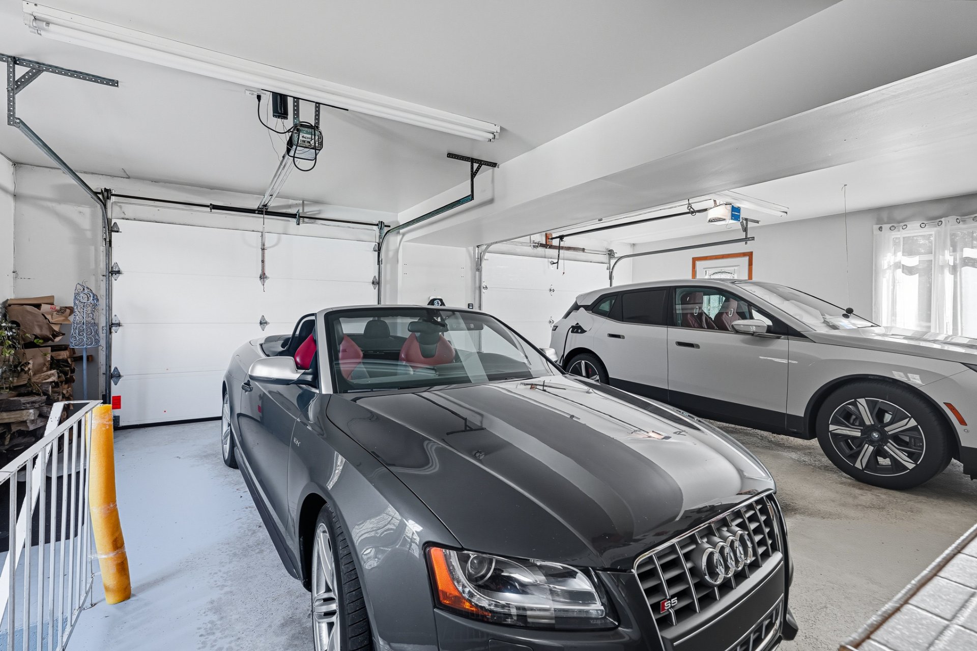 The main living room, featuring a wood-burning stove, is distinguished by its warm atmosphere and its openness to the cathedral-ceilinged dining room, where the abundant windows flood the room with light. The spacious and functional kitchen features granite countertops and direct access to the rear terrace, perfect for outdoor dining. The ground floor also includes a powder room, a separate laundry room, and interior access to the double garage.