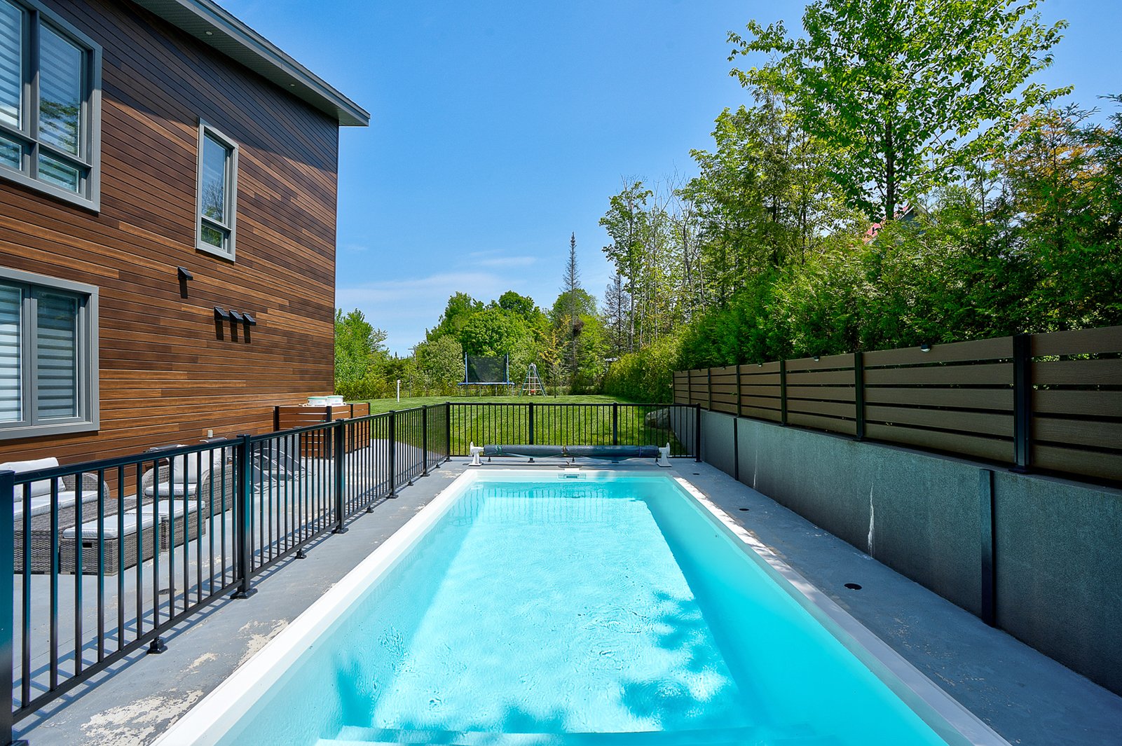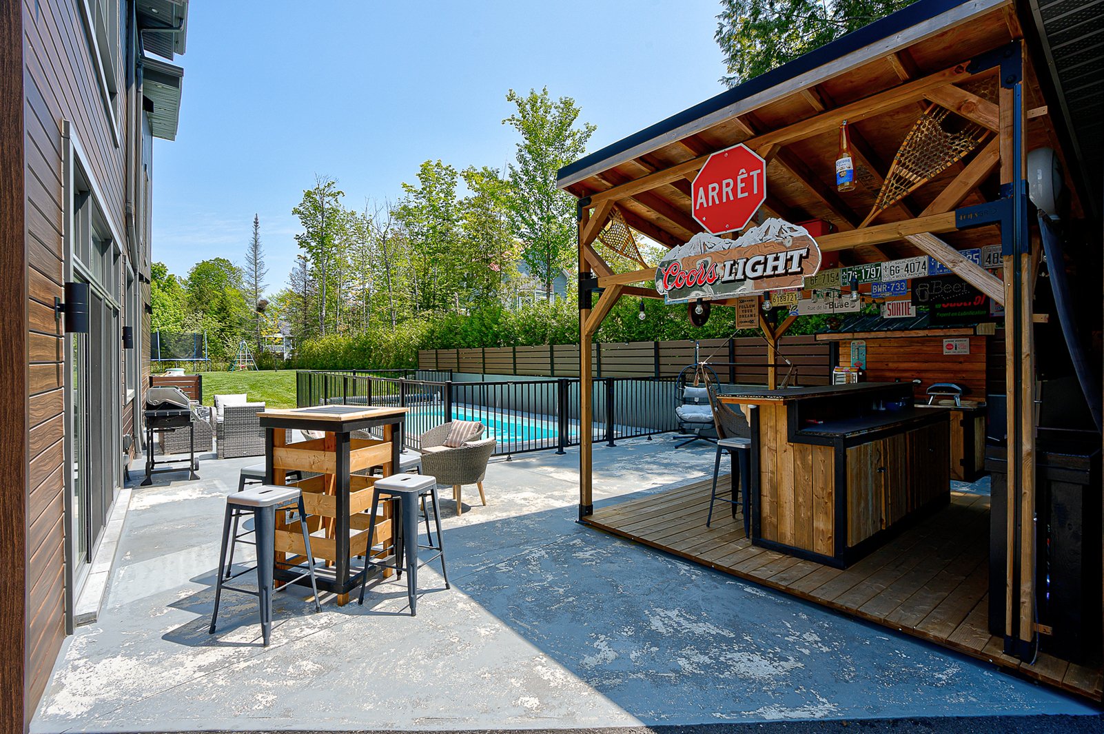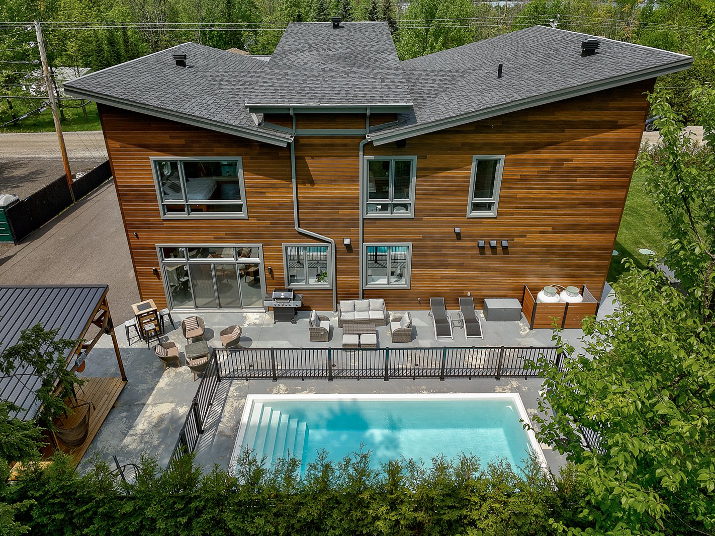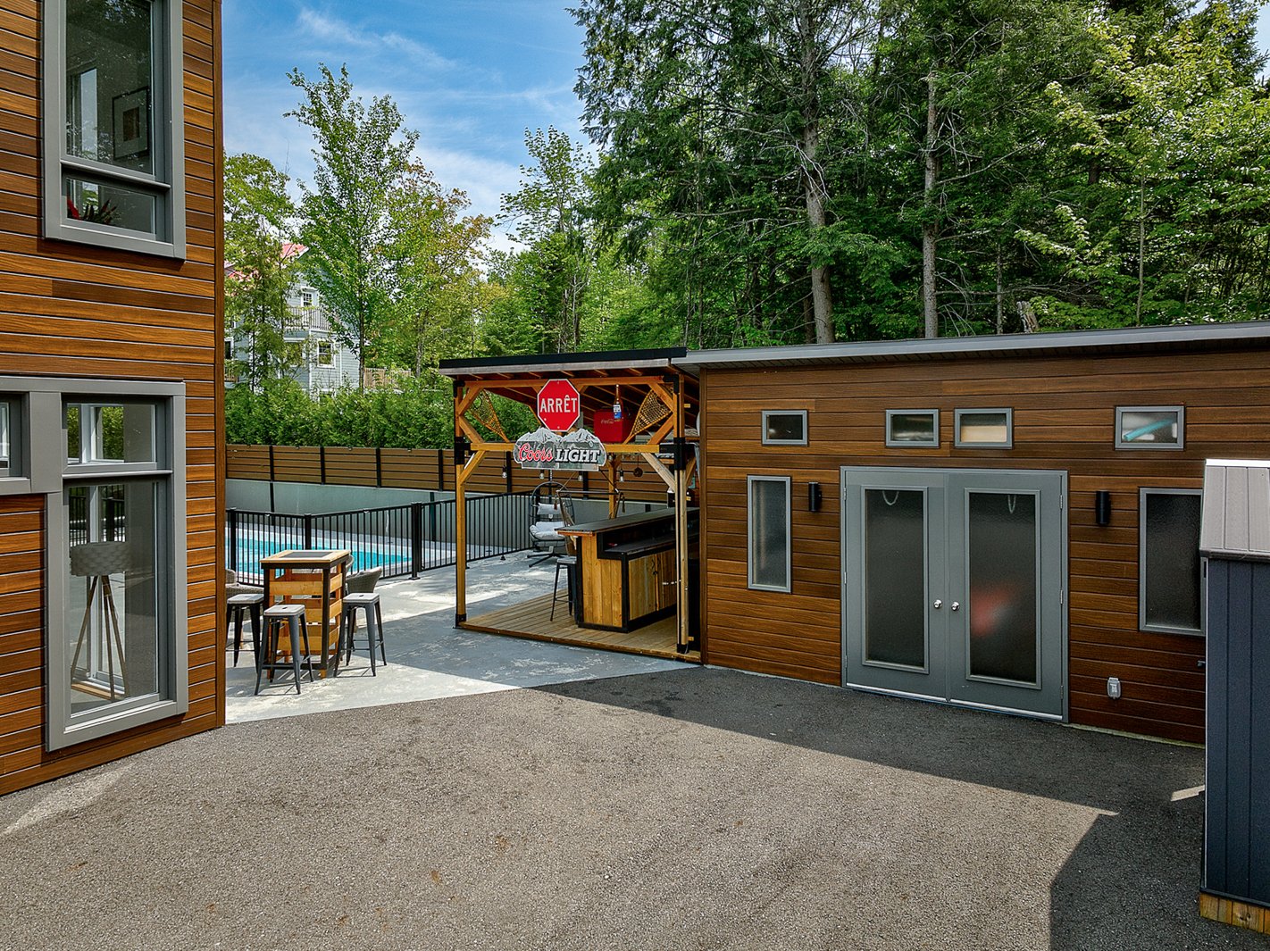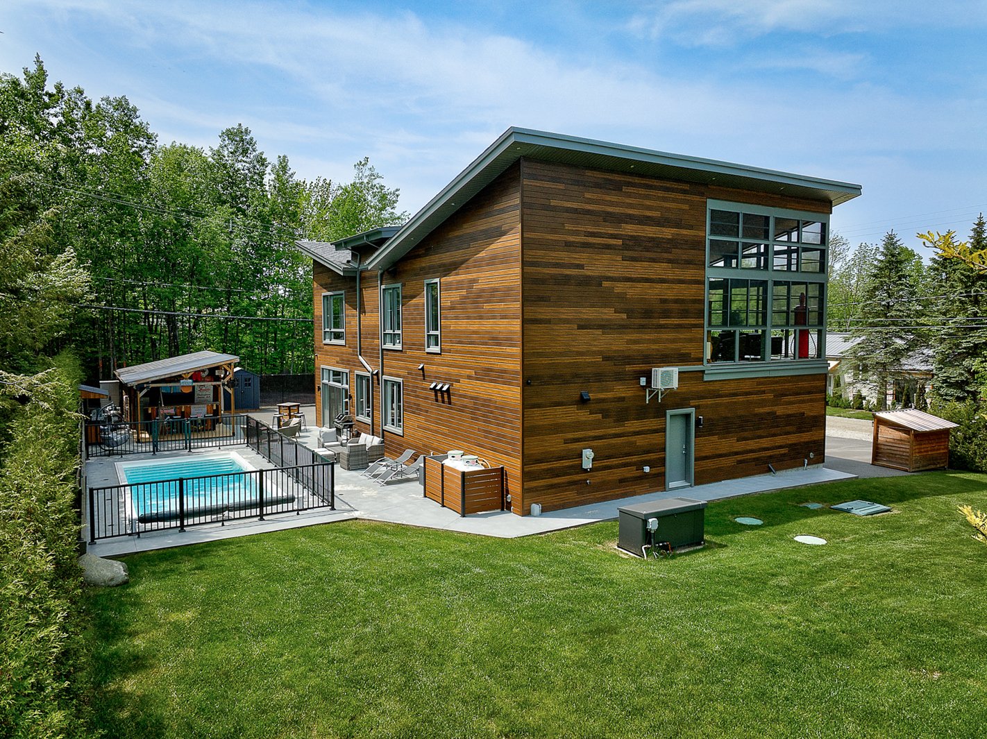 The exterior continues the experience with a fully private lot secured by a motorized gate at the entrance, a heated in-ground pool, a large concrete terrace, a covered wood outdoor bar, a discreet shed and an asphalt driveway that can accommodate over ten vehicles.