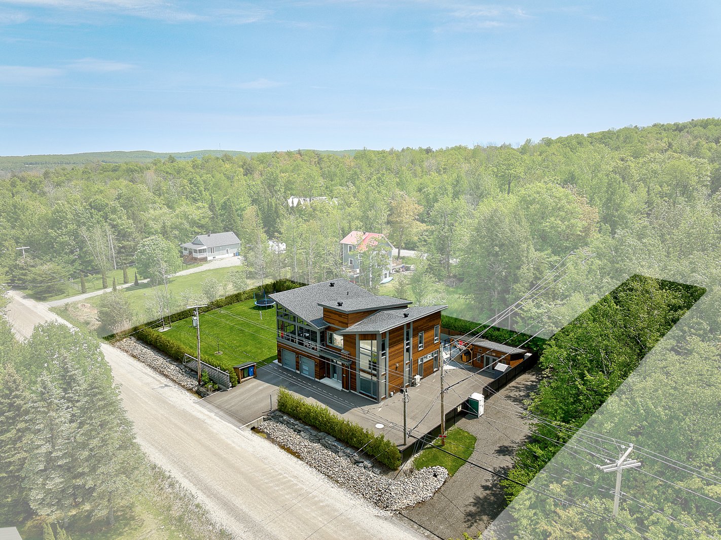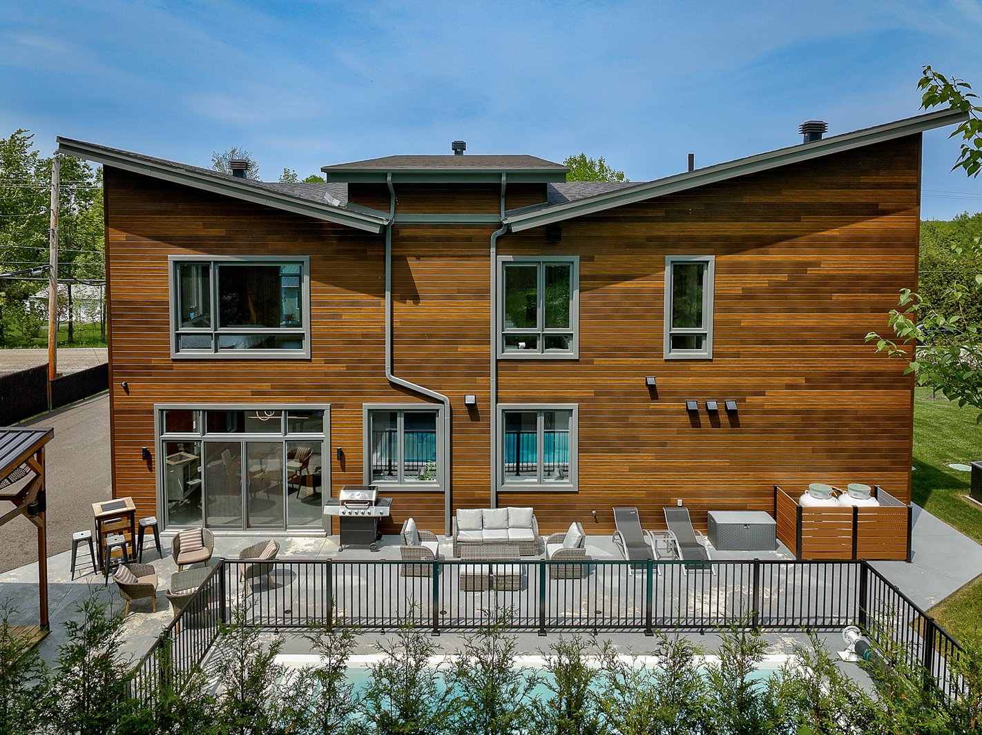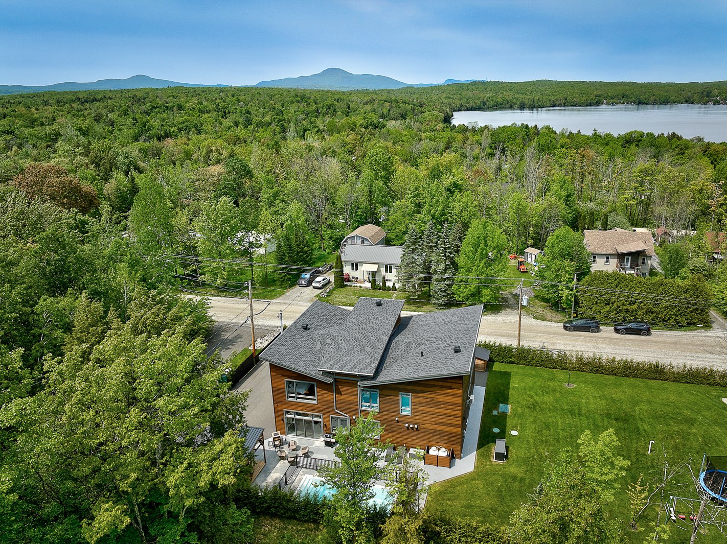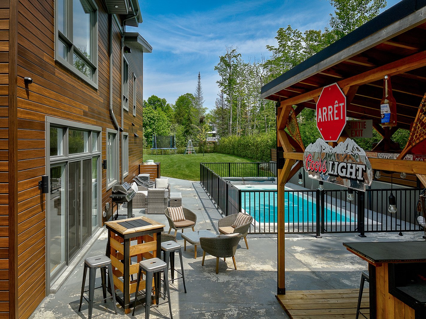 The exterior continues the experience with a fully private lot secured by a motorized gate at the entrance, a heated in-ground pool, a large concrete terrace, a covered wood outdoor bar, a discreet shed and an asphalt driveway that can accommodate over ten vehicles.