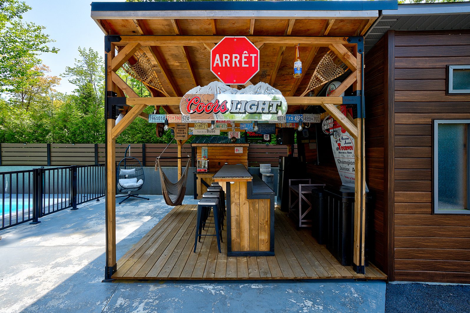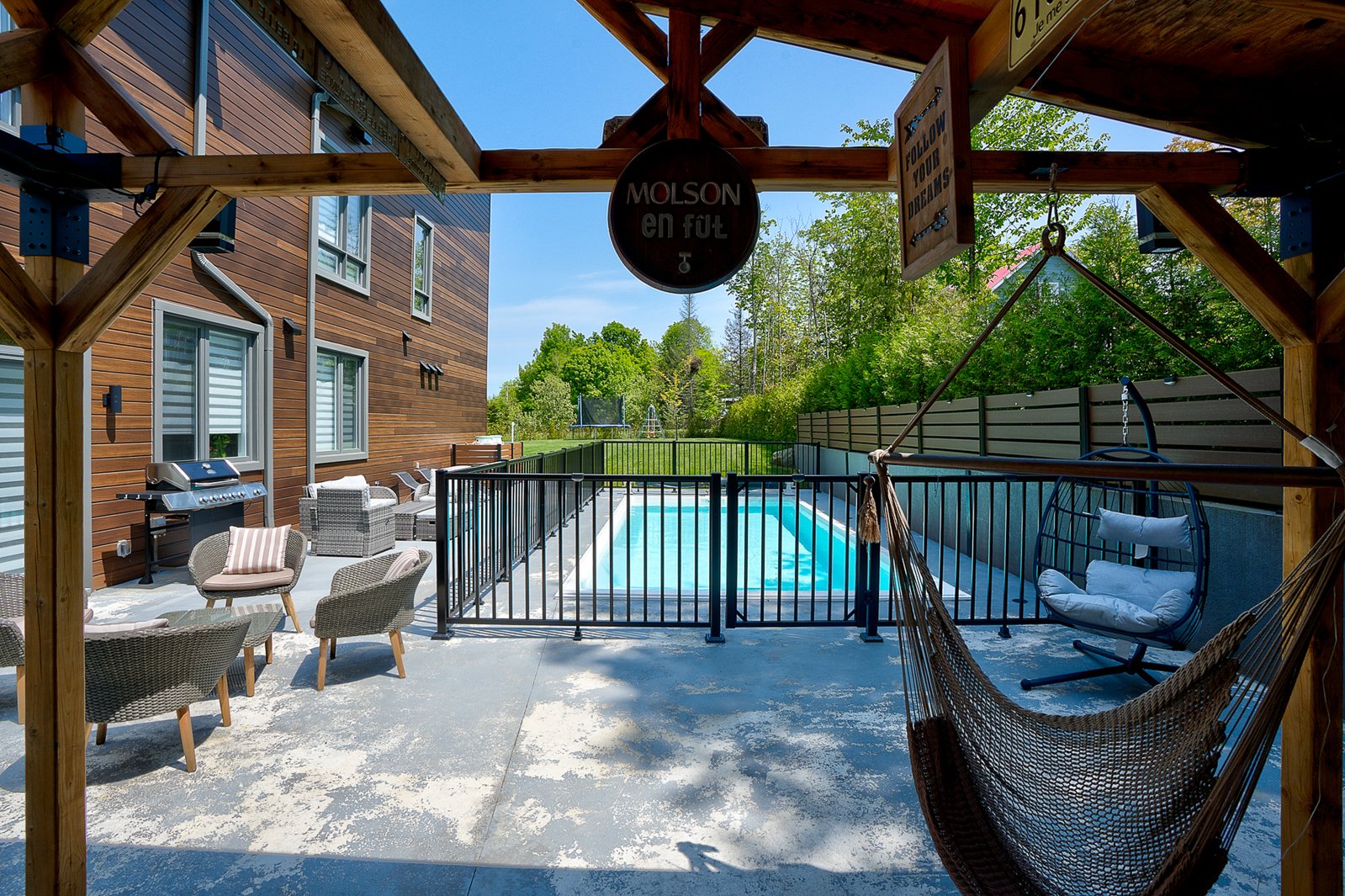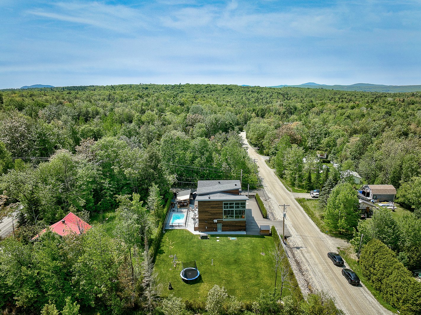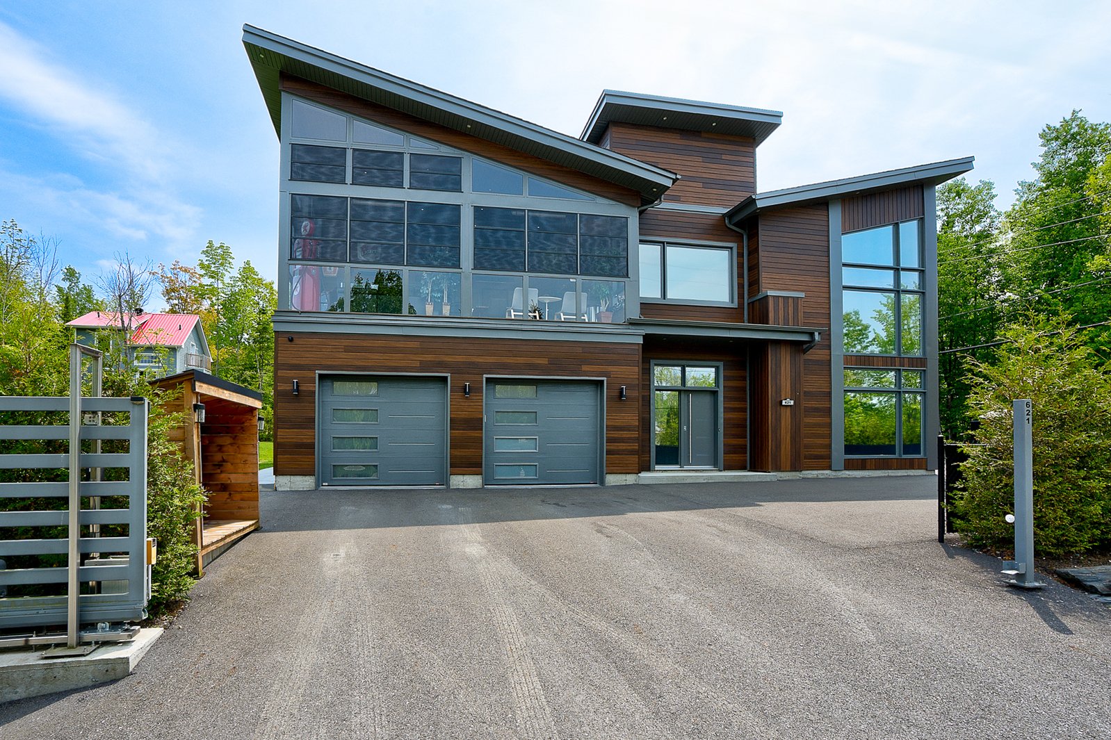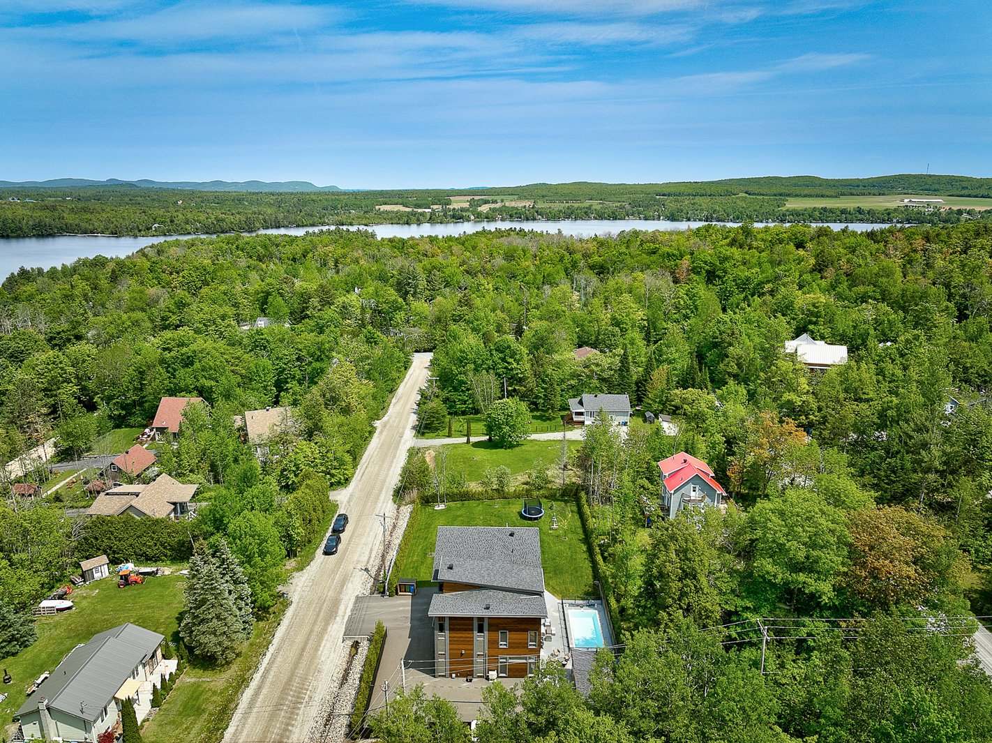 The exterior continues the experience with a fully private lot secured by a motorized gate at the entrance, a heated in-ground pool, a large concrete terrace, a covered wood outdoor bar, a discreet shed and an asphalt driveway that can accommodate over ten vehicles.