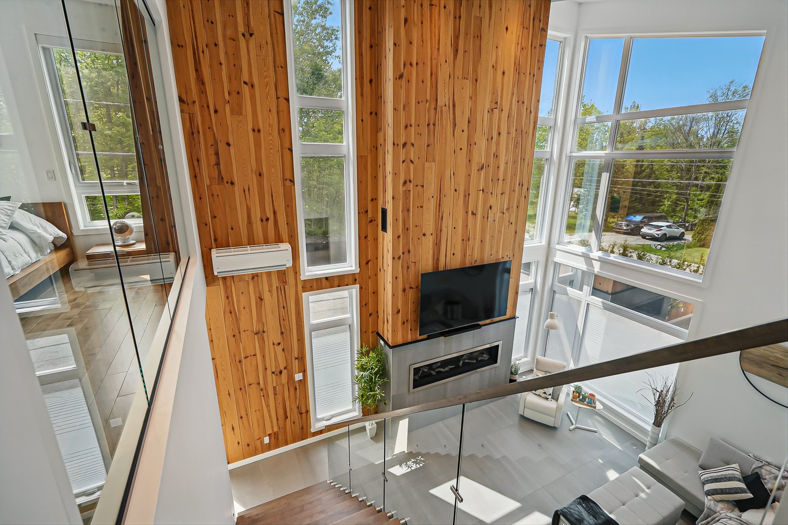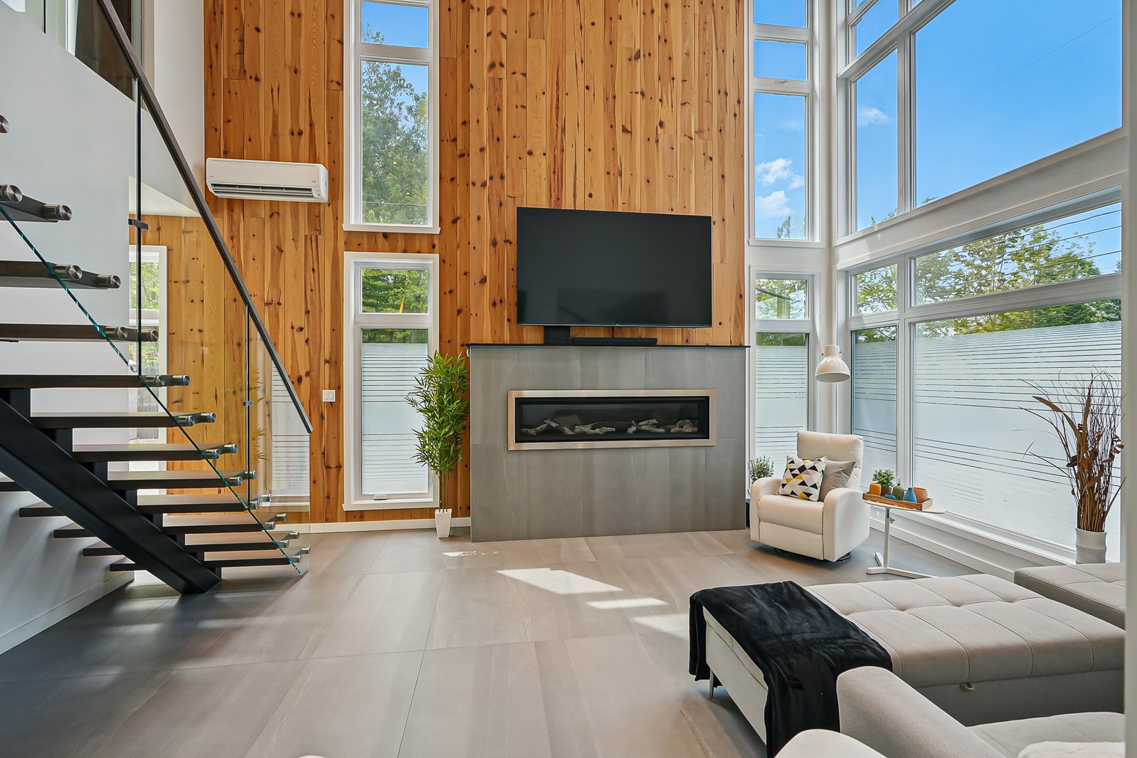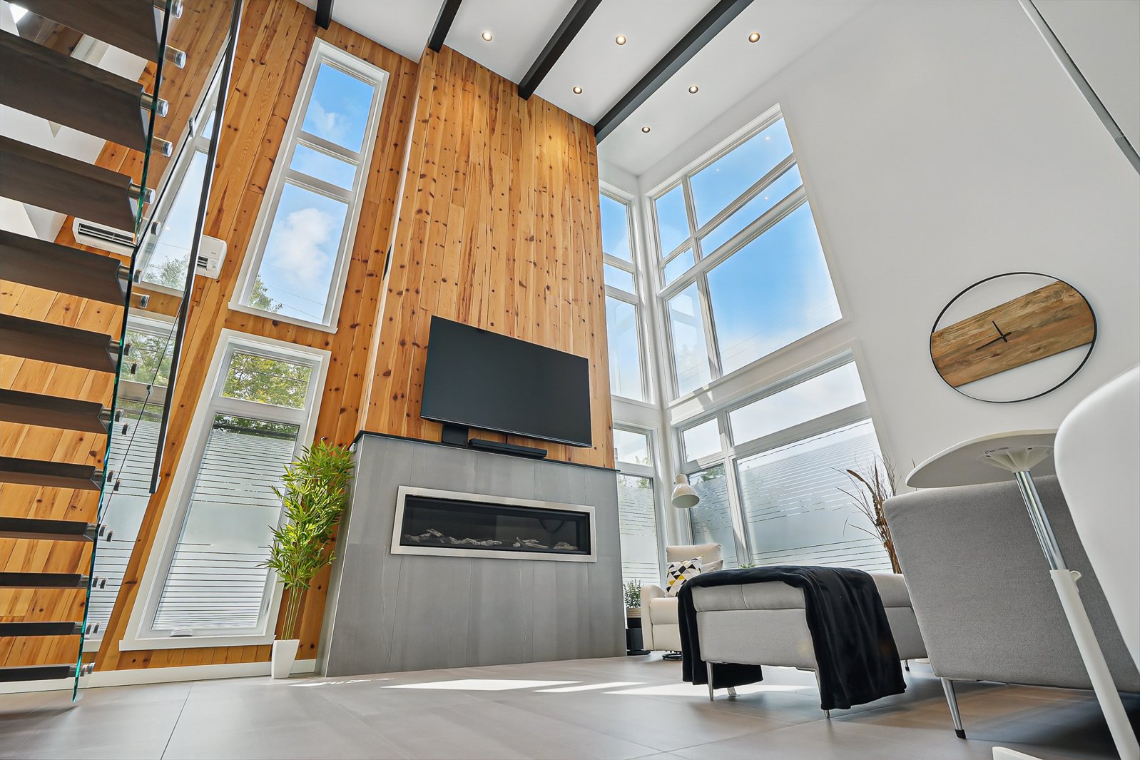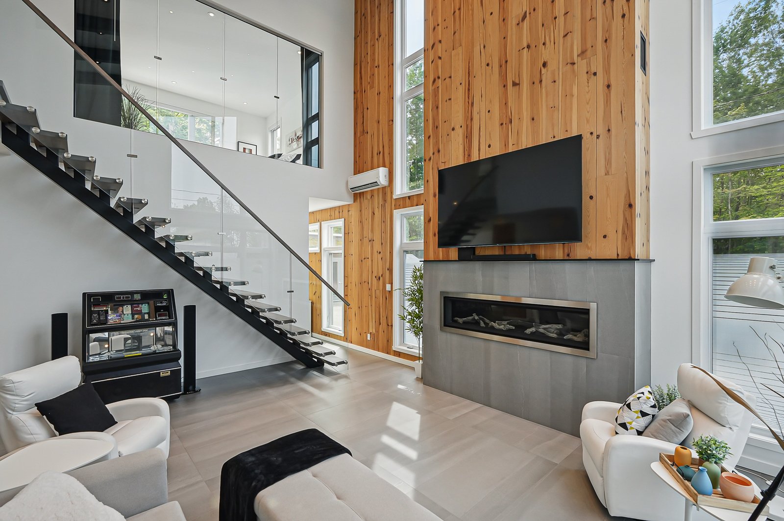 The dining room opens directly onto an intimate terrace and a beautifully landscaped in-ground pool. The living room stands out with its majestic 22-foot-plus ceilings, propane fireplace and a knotted pine accent wall that adds natural warmth to the space. The architectural wood staircase, mounted on a steel stringer with glass railings, leads to the upper level where 9-foot ceilings frame three bedrooms.