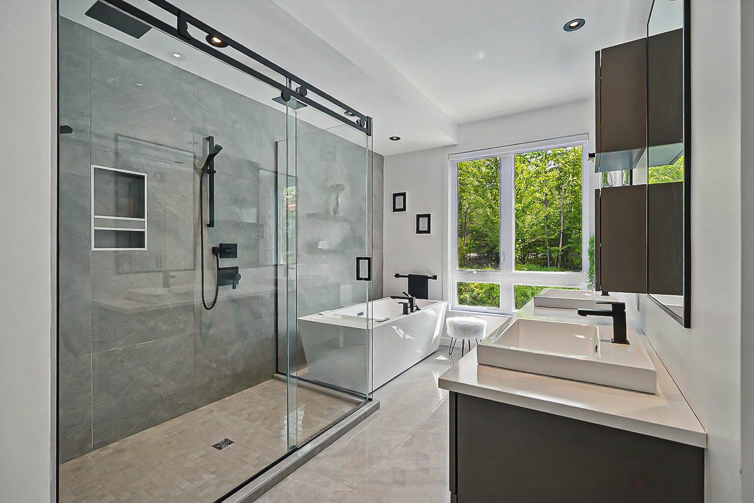 The spacious and light-filled primary suite features a tempered glass wall, a large walk-in closet (10'5" x 6'10") and a luxurious ensuite bathroom: double vanity, glass shower with black accents, freestanding tub and premium Bélanger fixtures.