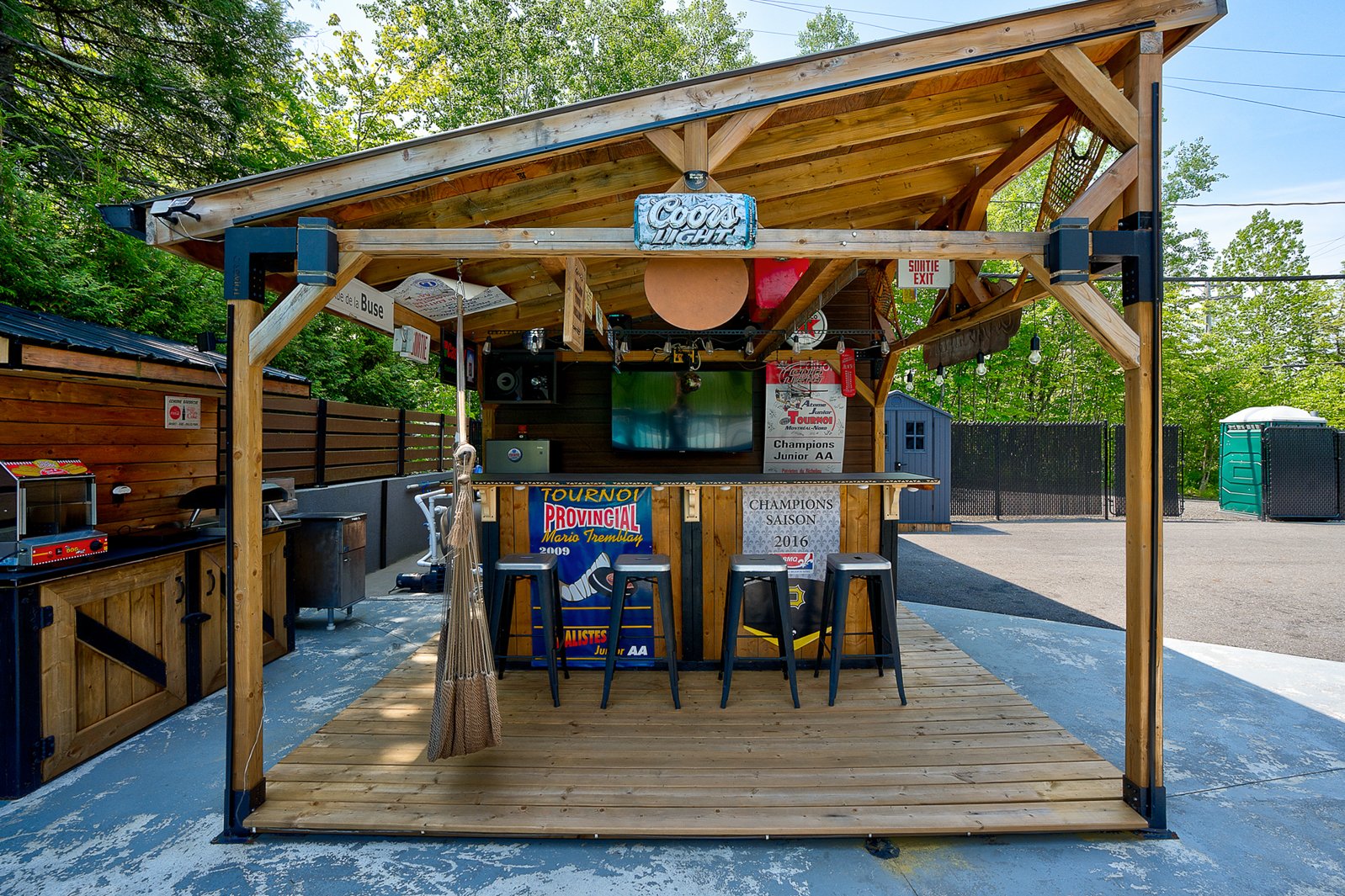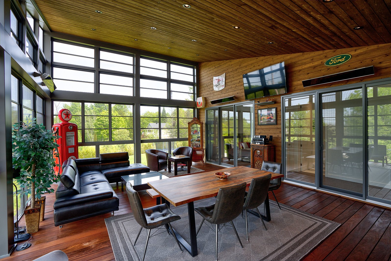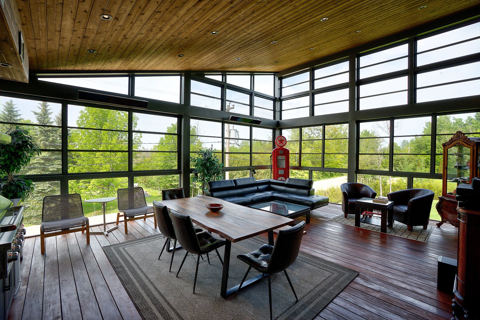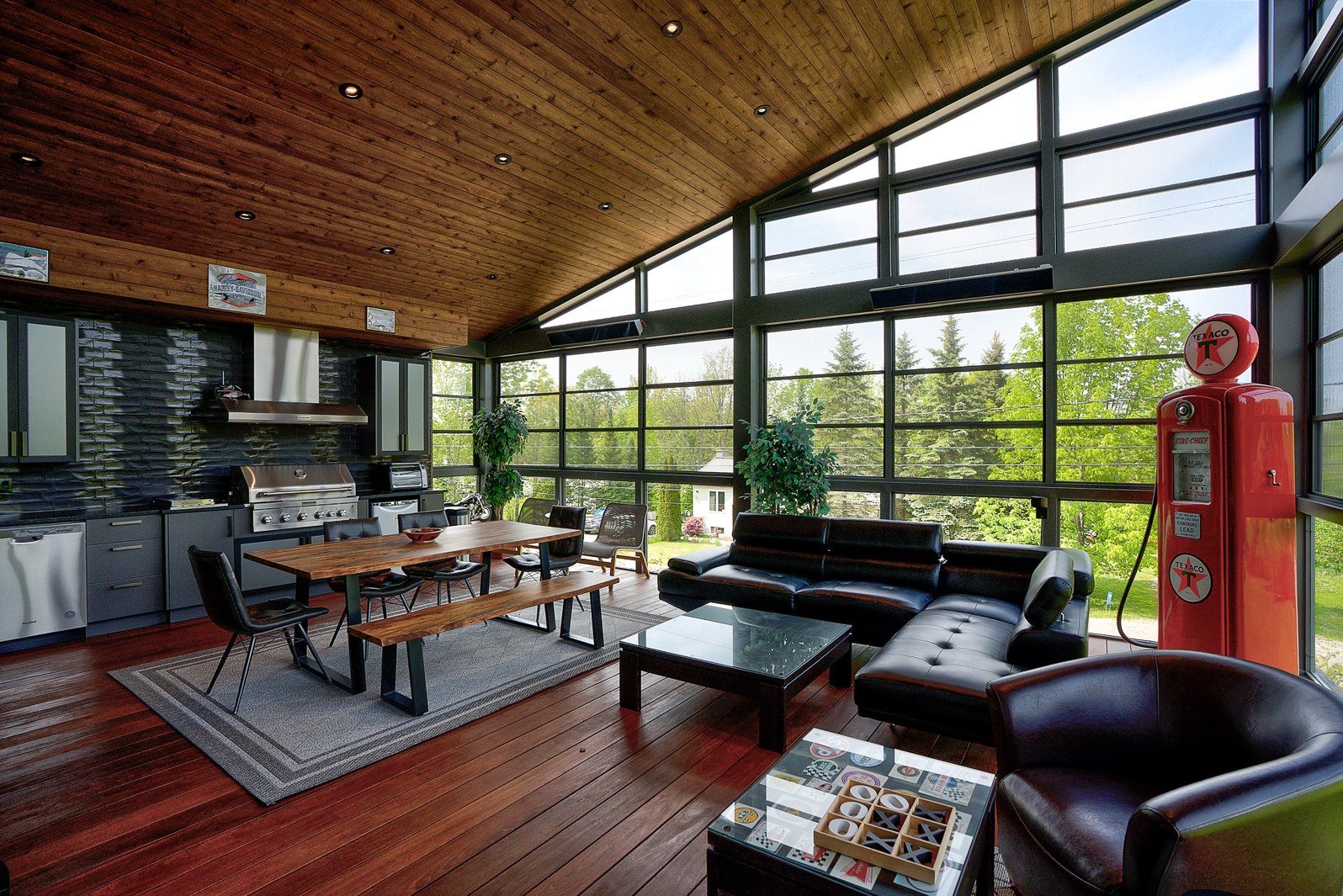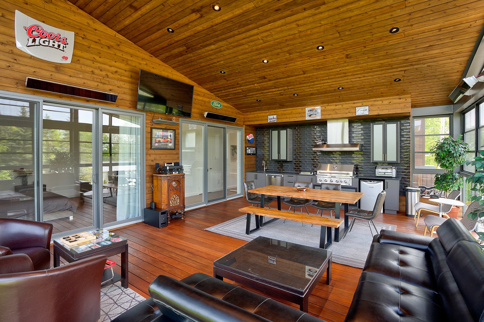 A three-season veranda with composite flooring offers a remarkable additional living space, complete with a second full kitchen and three patio heaters, ideal for entertaining year-round.