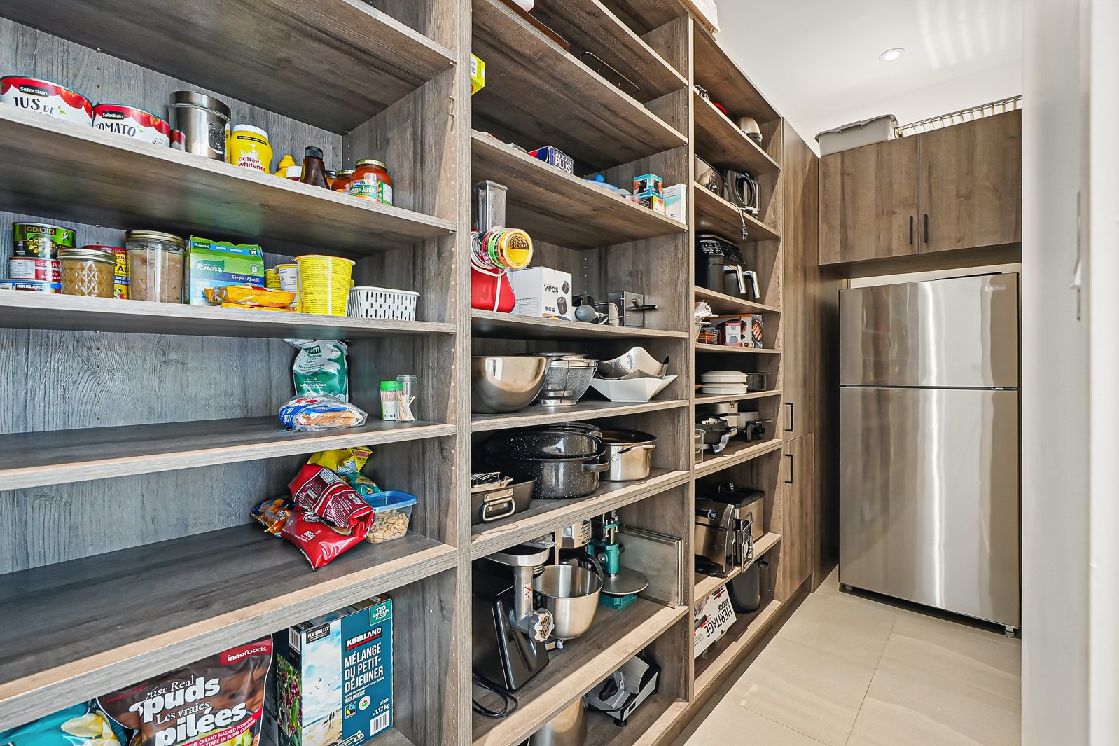 The main floor impresses with 10-foot ceilings, bright and expansive spaces and a layout that is both functional and refined. At the heart of the home, the kitchen features premium Jenn-Air and Bosch appliances, a 10-foot quartz island, a built-in dual wine fridge and elegant polyester cabinetry. A large pantry (5' x 11'4") includes a second fridge space.