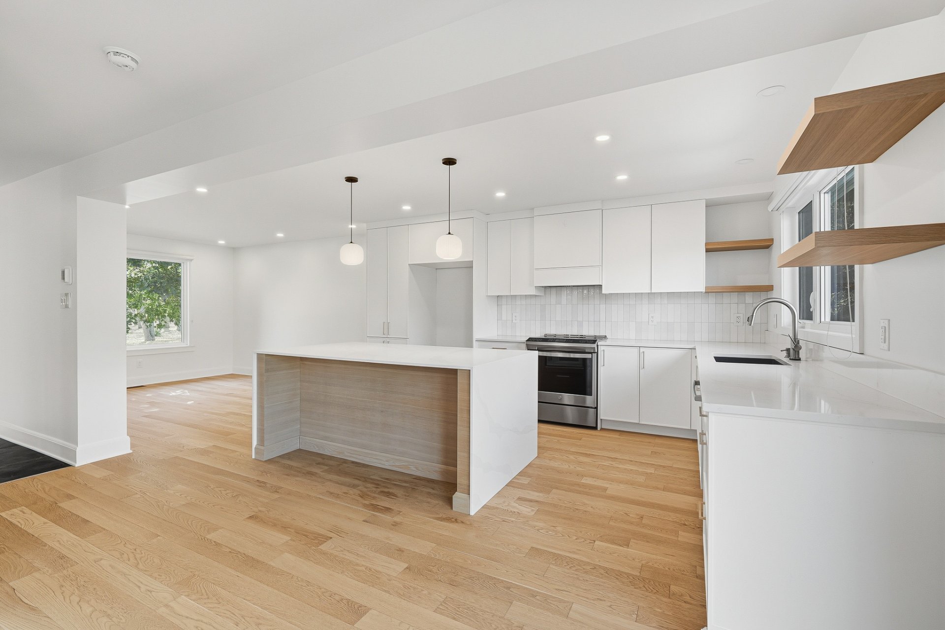 - The adjacent kitchen, equipped with a central island and quartz countertops, is the perfect place to prepare meals with ample counter space.