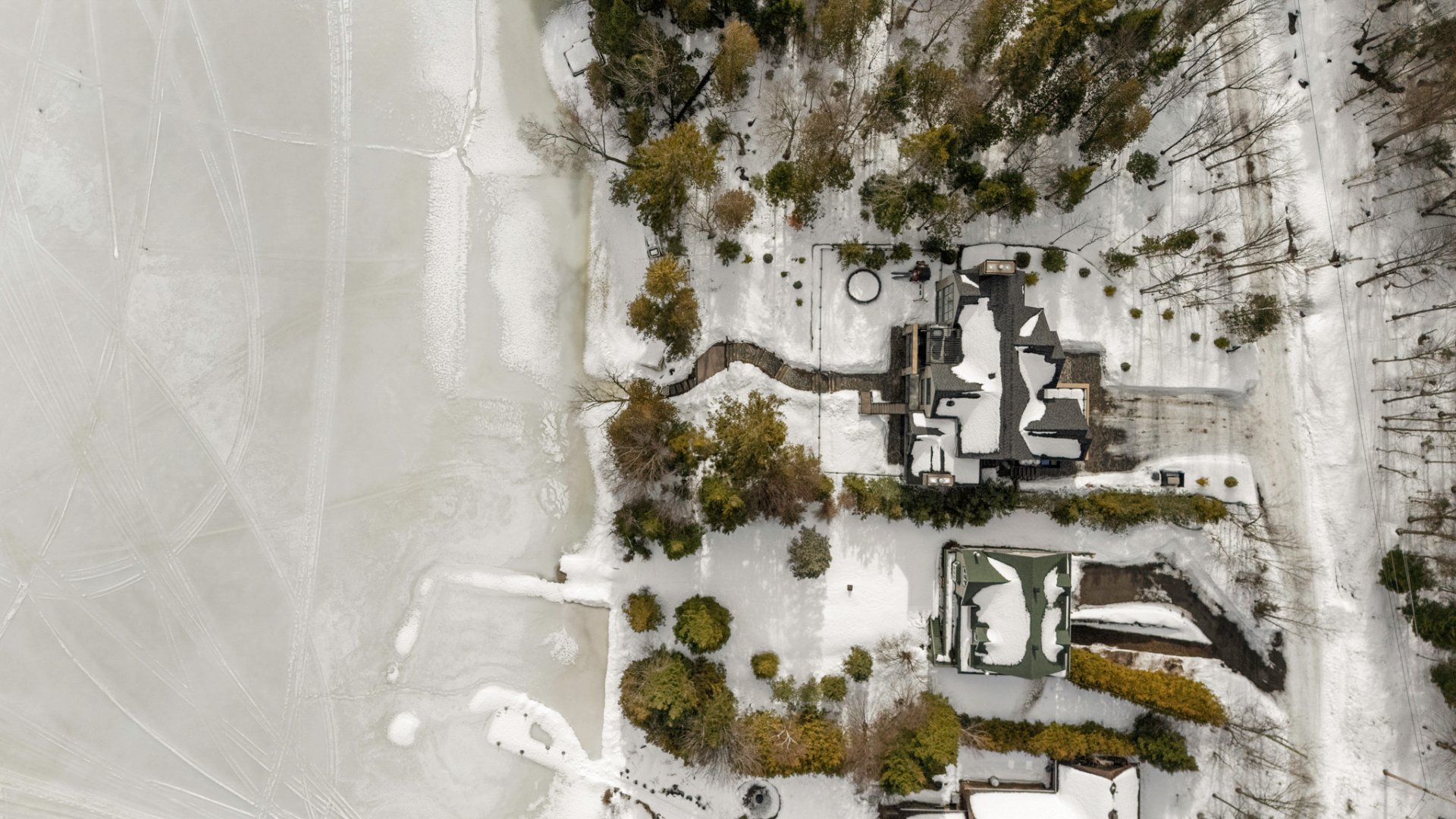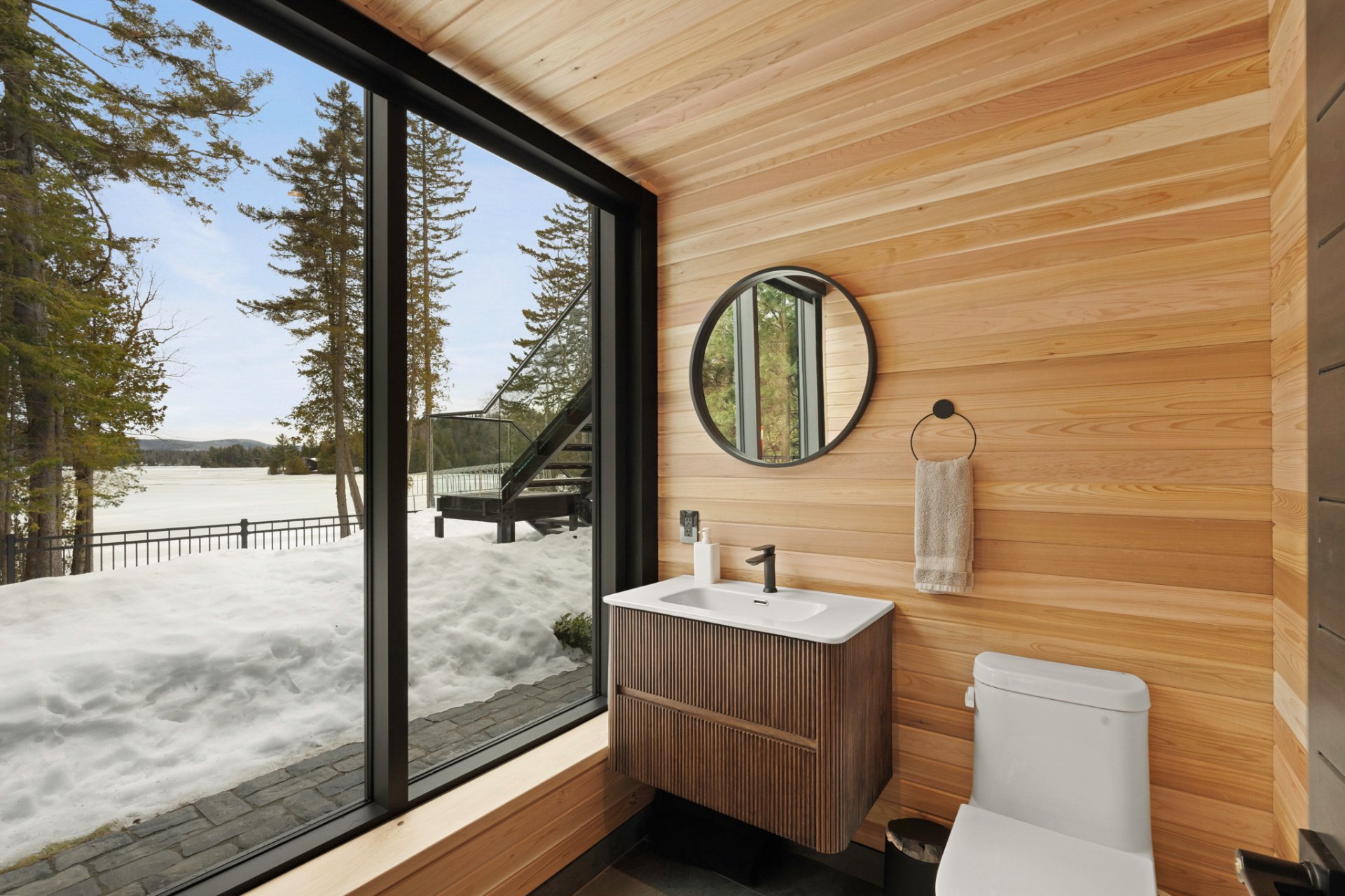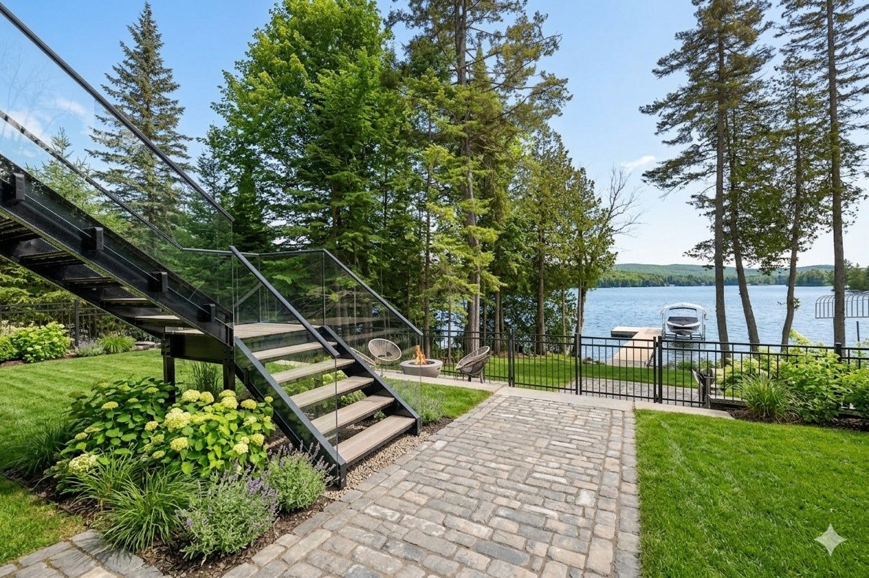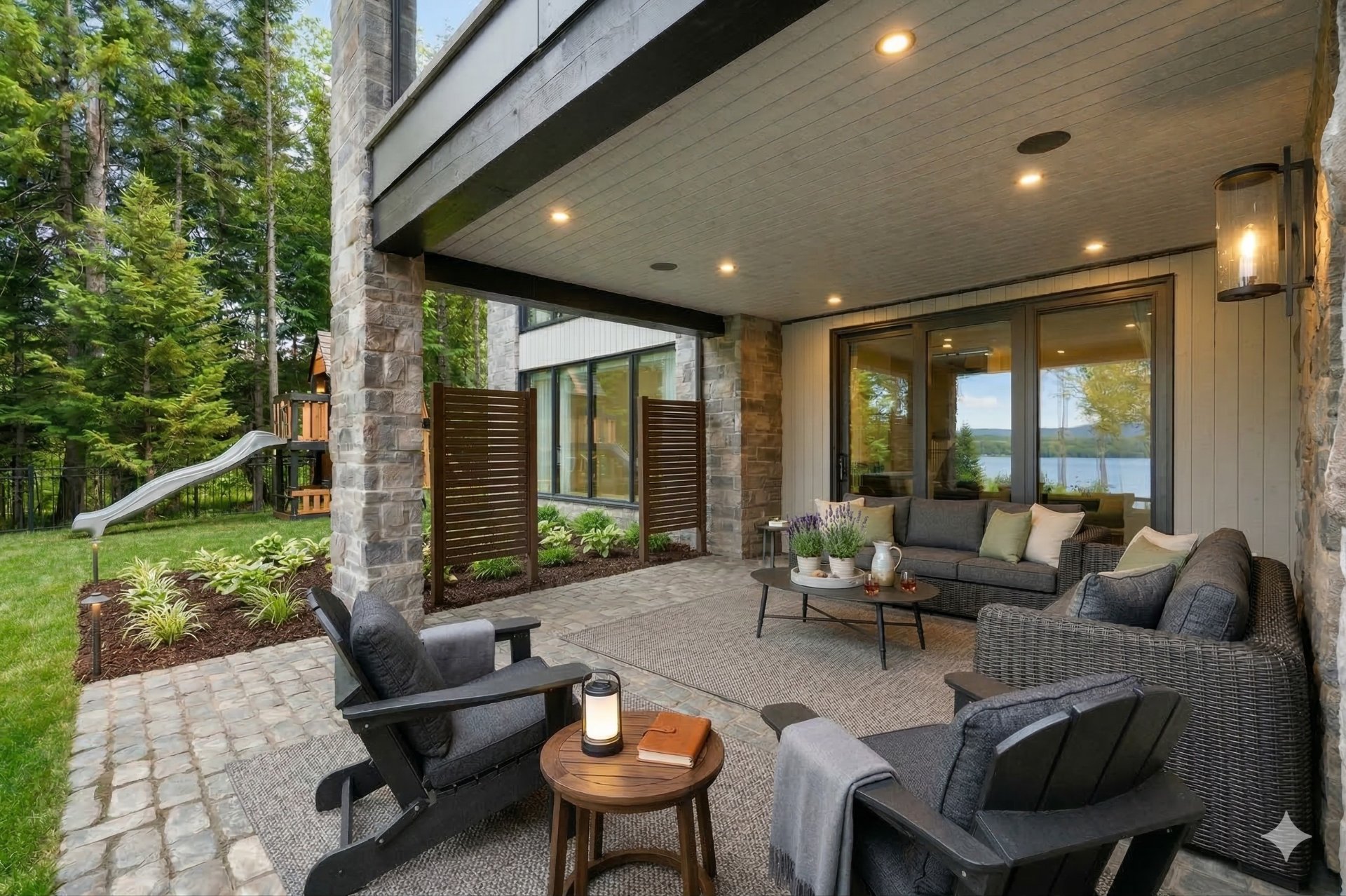 The thoughtfully designed landscaping creates multiple relaxation areas reminiscent of the finest Scandinavian spas. It features a covered terrace, a custom-built sauna overlooking the water, a firepit area, and a convenient storage space resembling a mini-warehouse.
