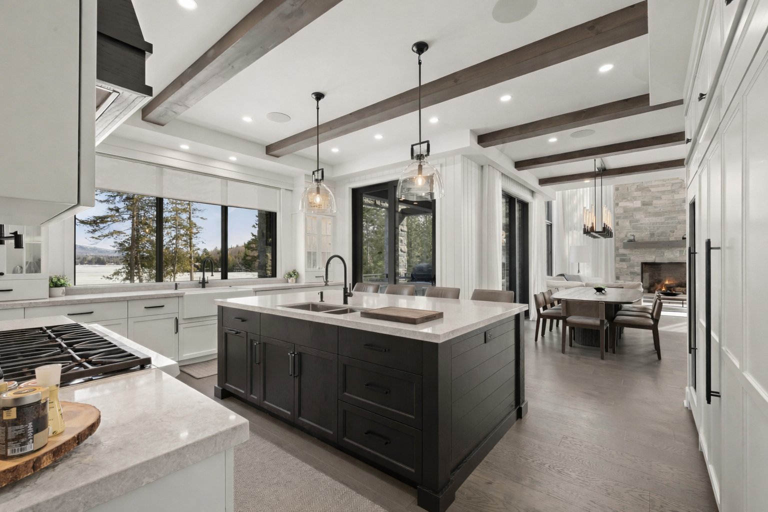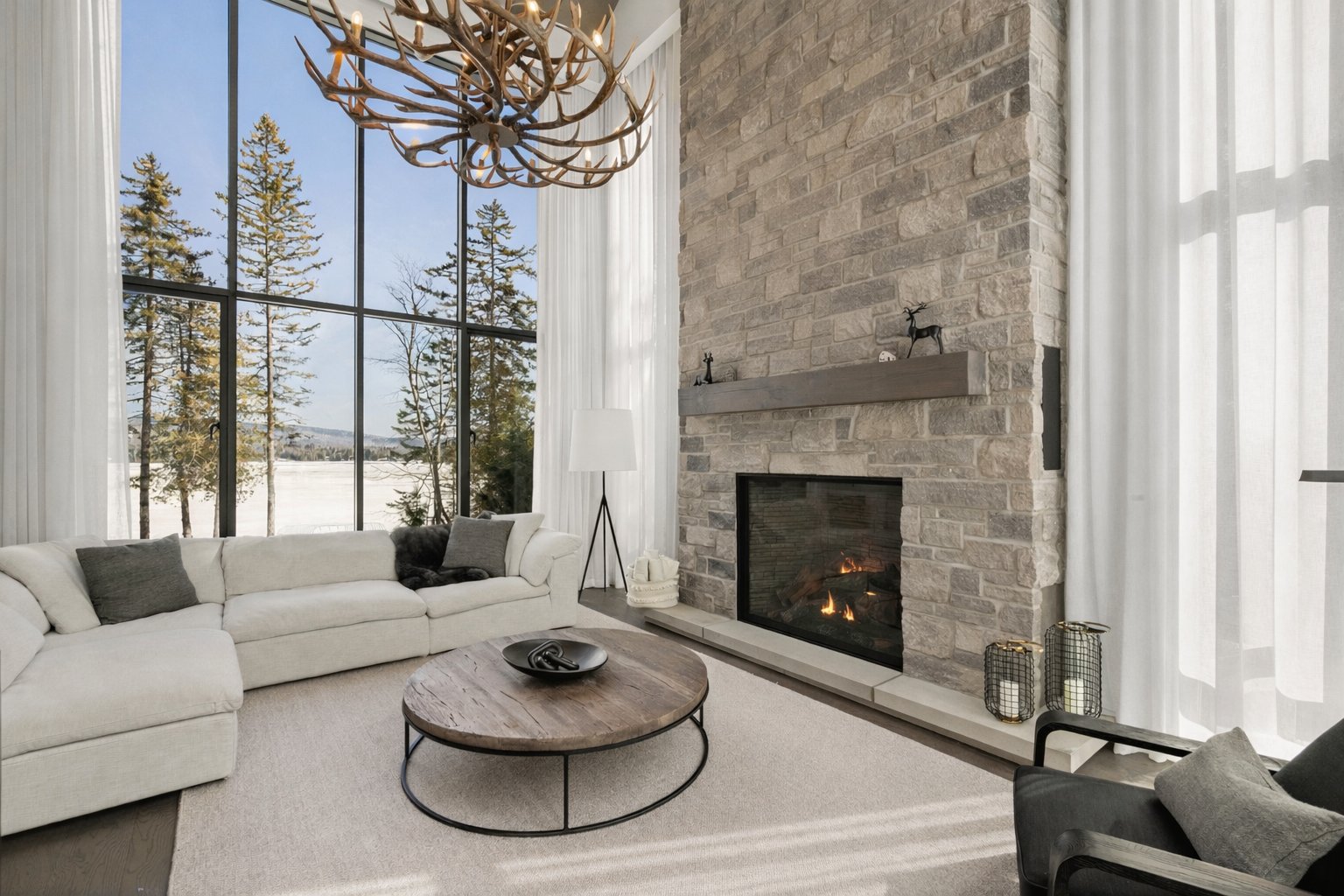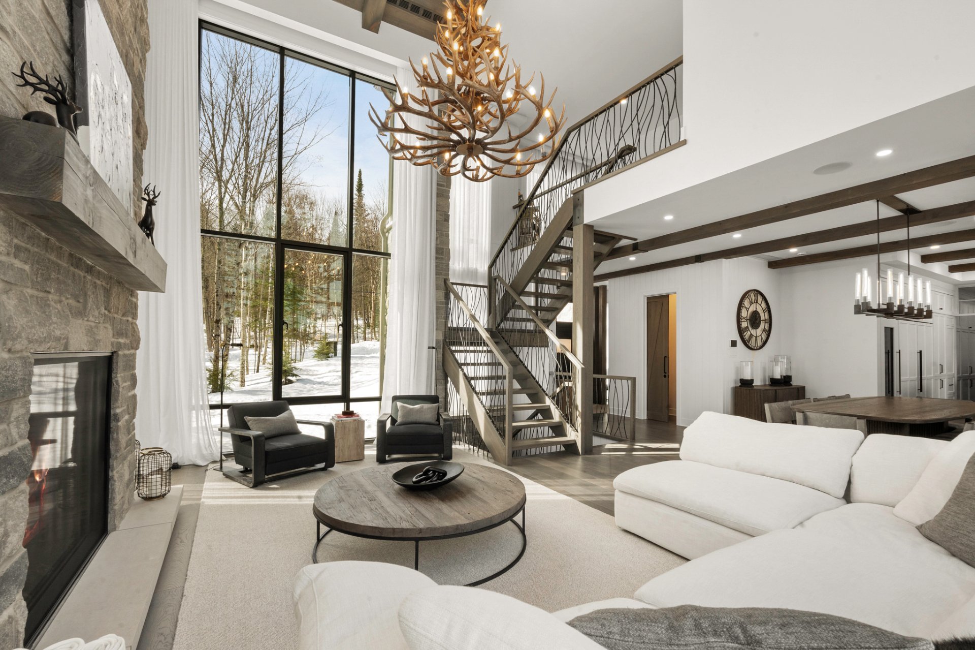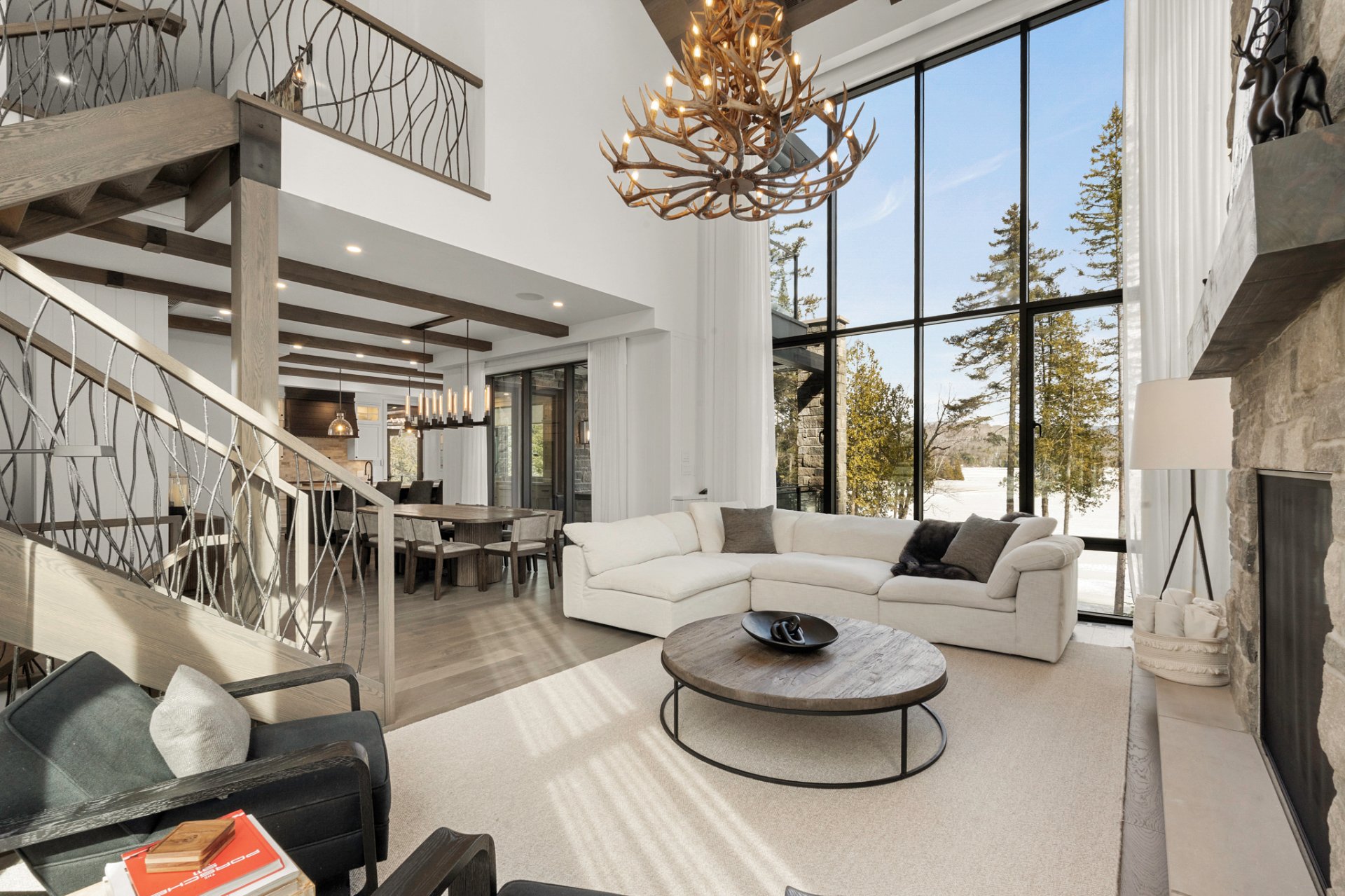 The main living area, entirely oriented toward the lake, reveals a spectacular living room anchored by a full-height natural stone wall featuring an oversized gas fireplace. Cathedral ceilings, exposed beams, and the harmonious blend of noble materials create an atmosphere that is both warm, elegant, and timeless.