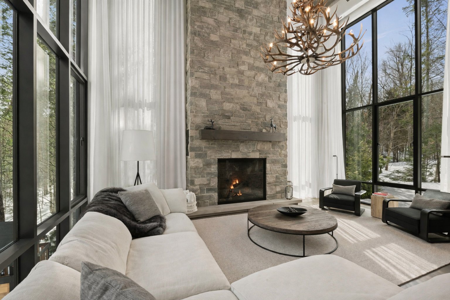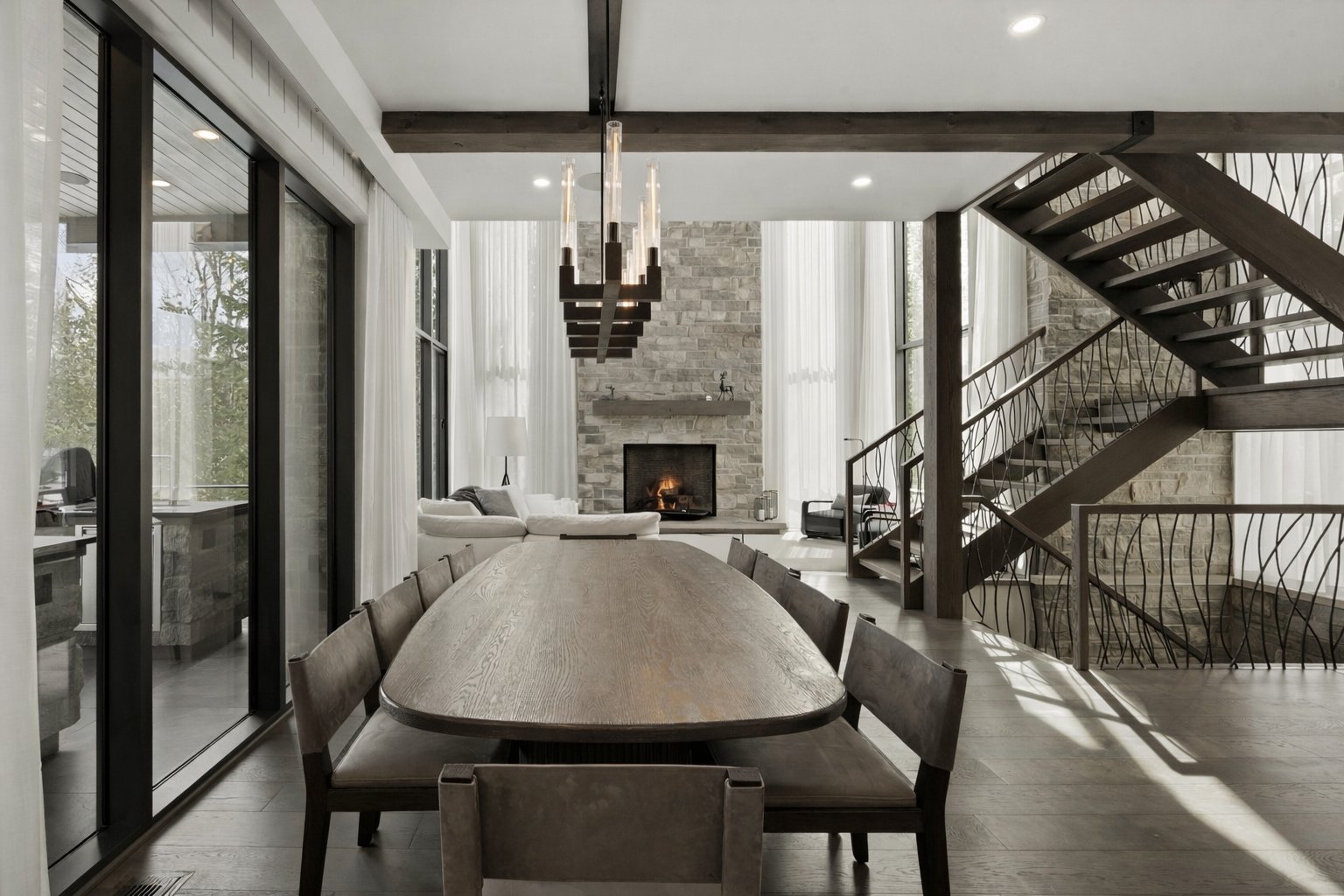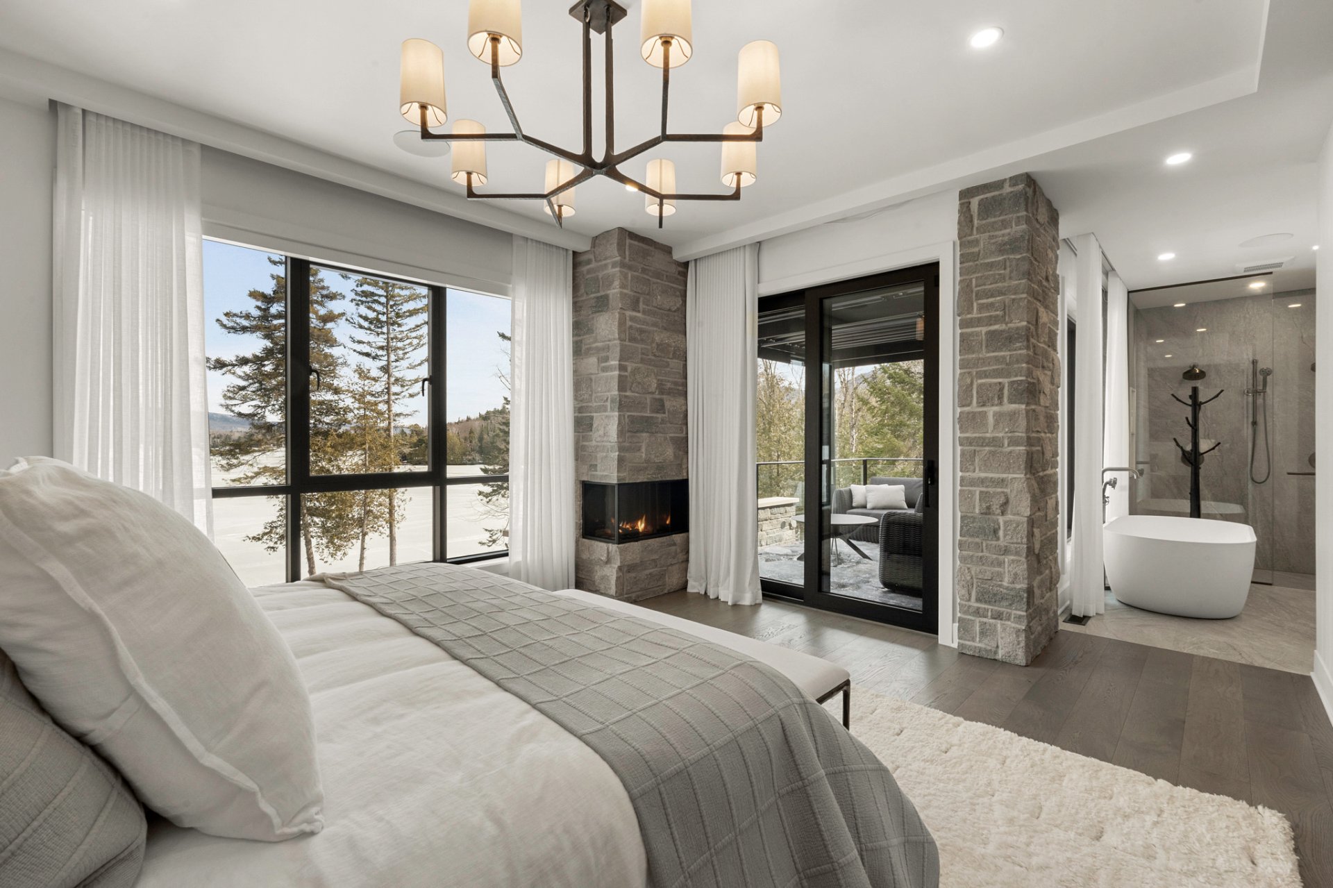 The main living area, entirely oriented toward the lake, reveals a spectacular living room anchored by a full-height natural stone wall featuring an oversized gas fireplace. Cathedral ceilings, exposed beams, and the harmonious blend of noble materials create an atmosphere that is both warm, elegant, and timeless.
