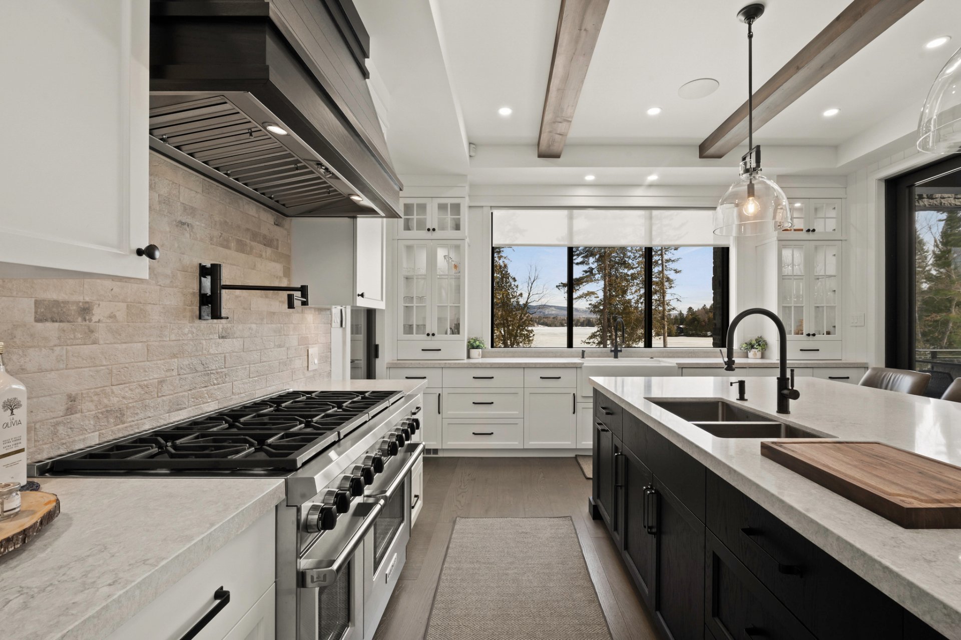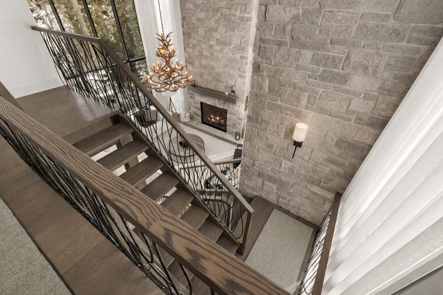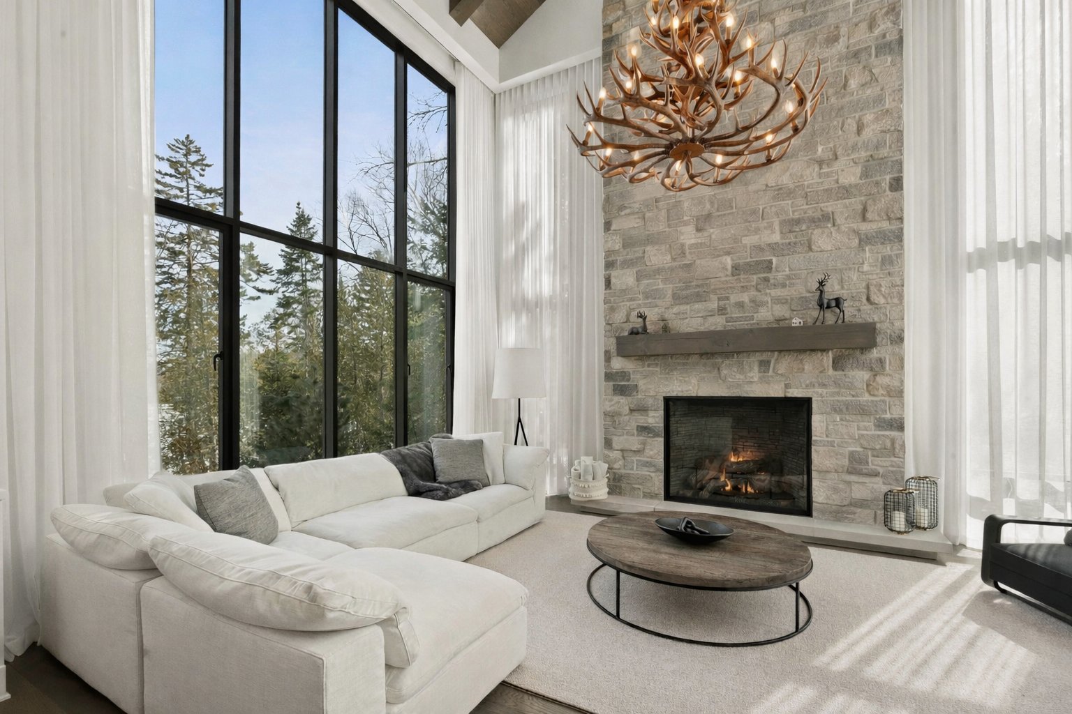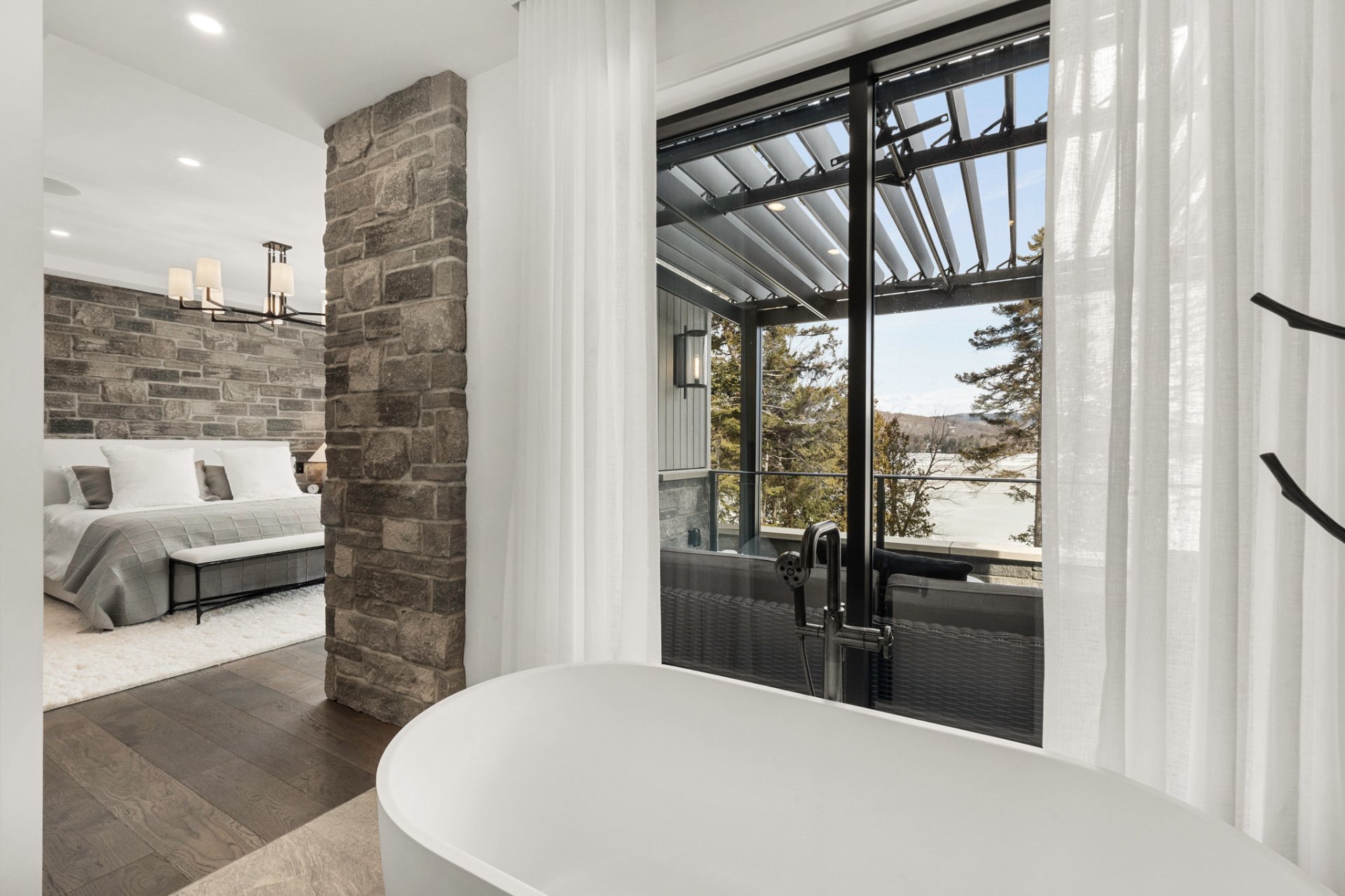The main living area, entirely oriented toward the lake, reveals a spectacular living room anchored by a full-height natural stone wall featuring an oversized gas fireplace. Cathedral ceilings, exposed beams, and the harmonious blend of noble materials create an atmosphere that is both warm, elegant, and timeless.