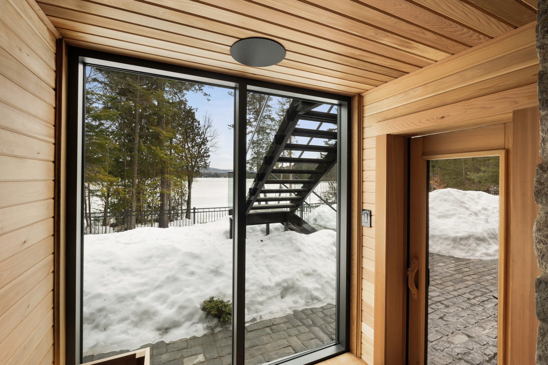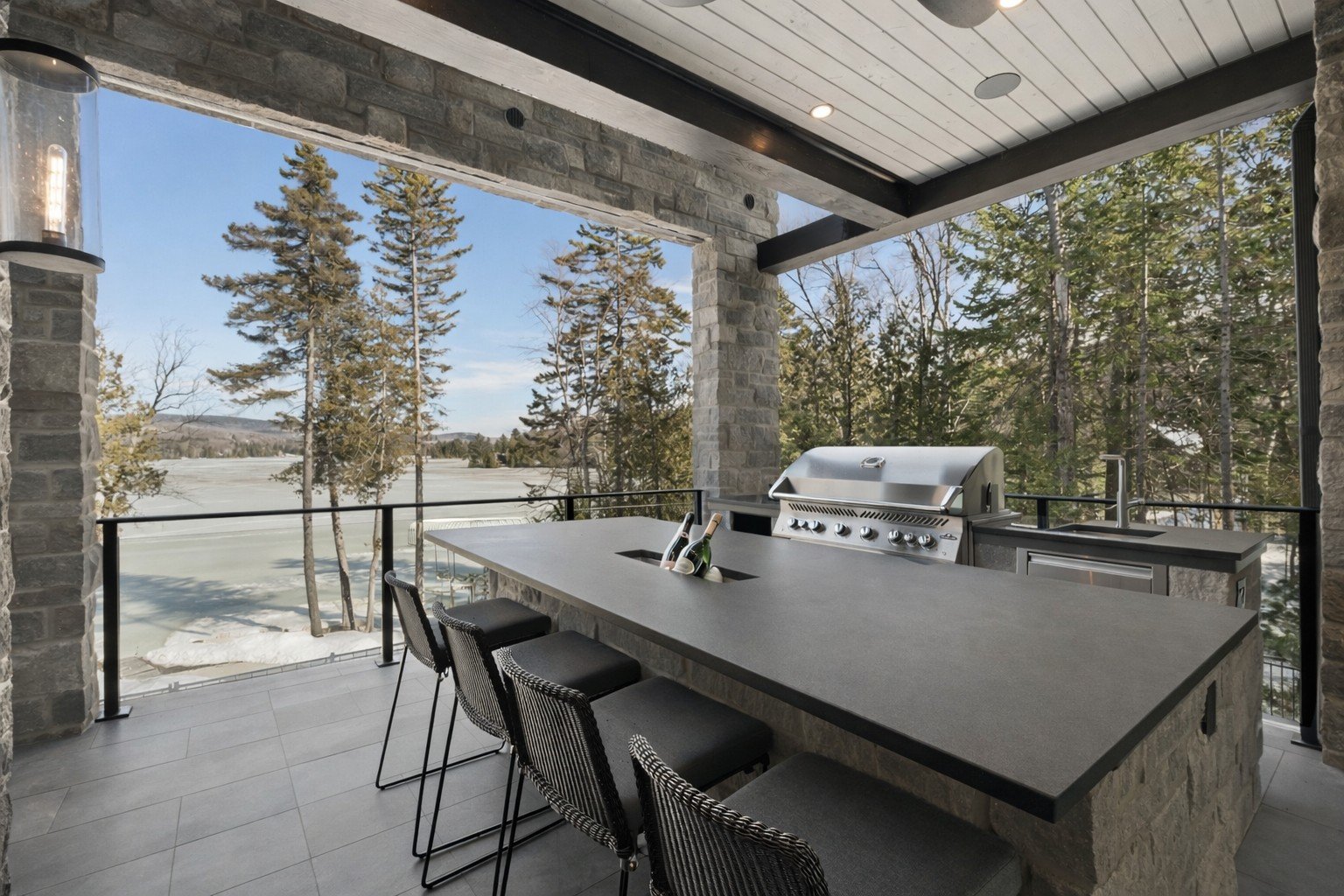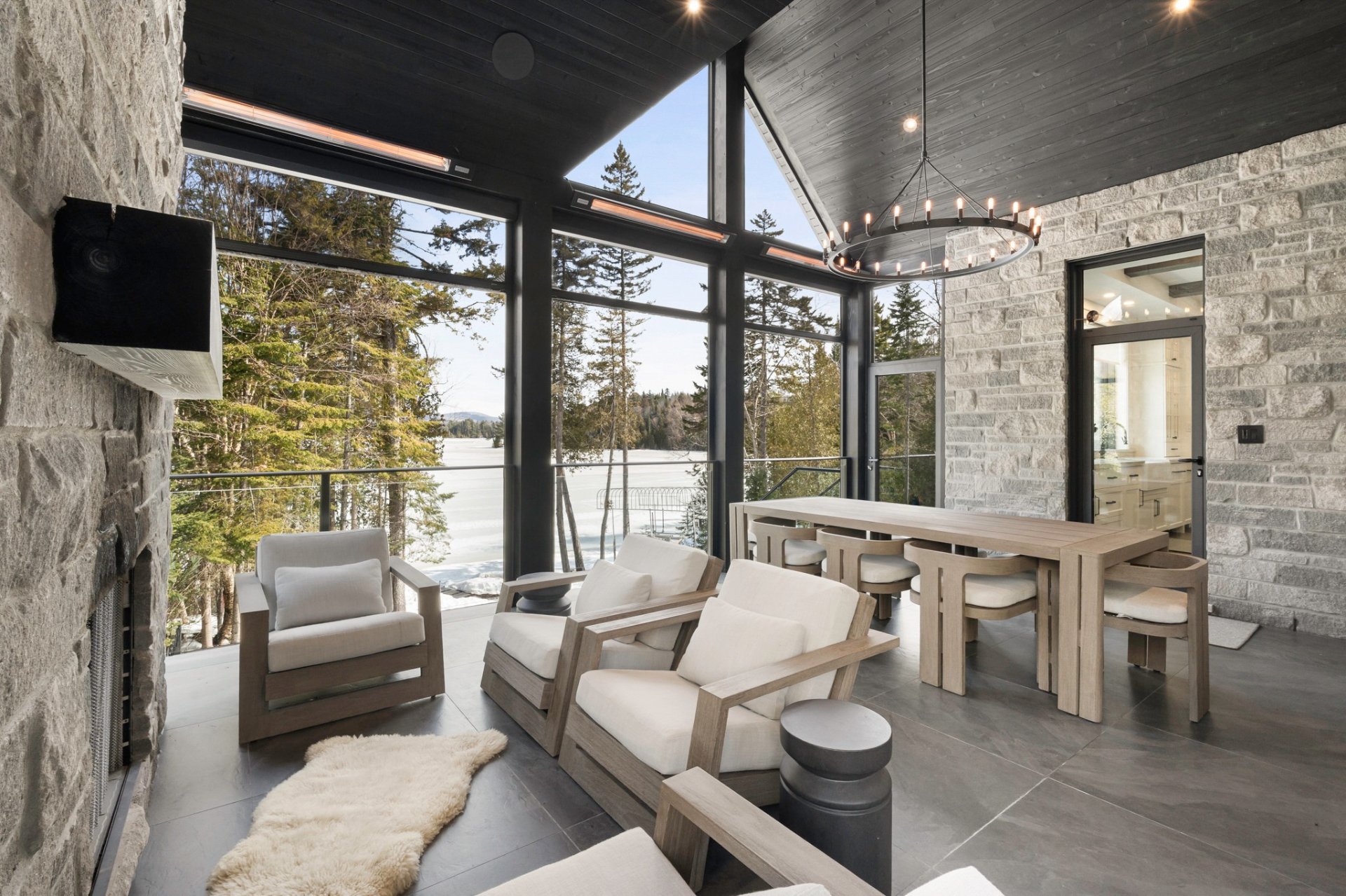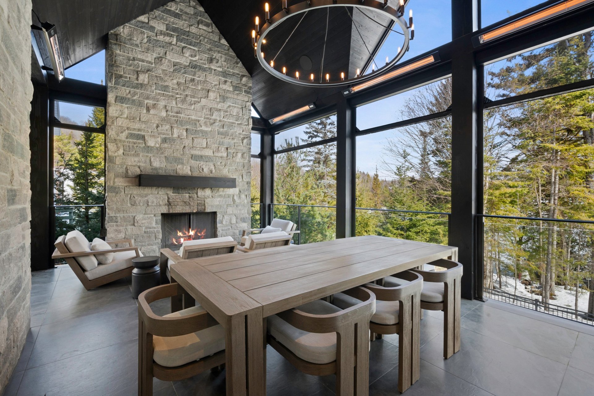 Adjacent to the kitchen, the three-season veranda offers a cozy and inviting ambiance with its wood-burning fireplace and Phantom retractable screen system. A true extension of the living space, it becomes a privileged place to enjoy the surrounding landscape.