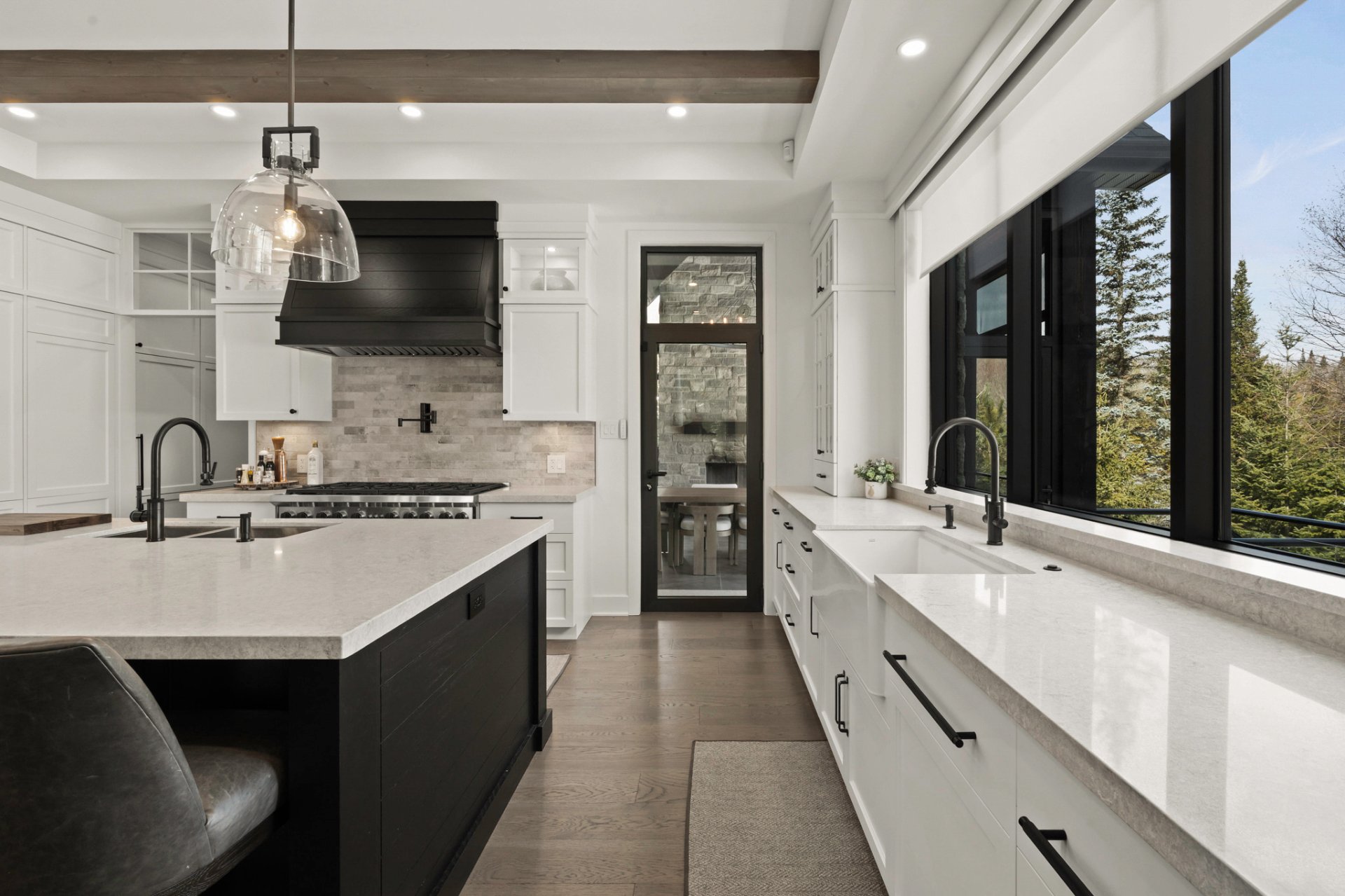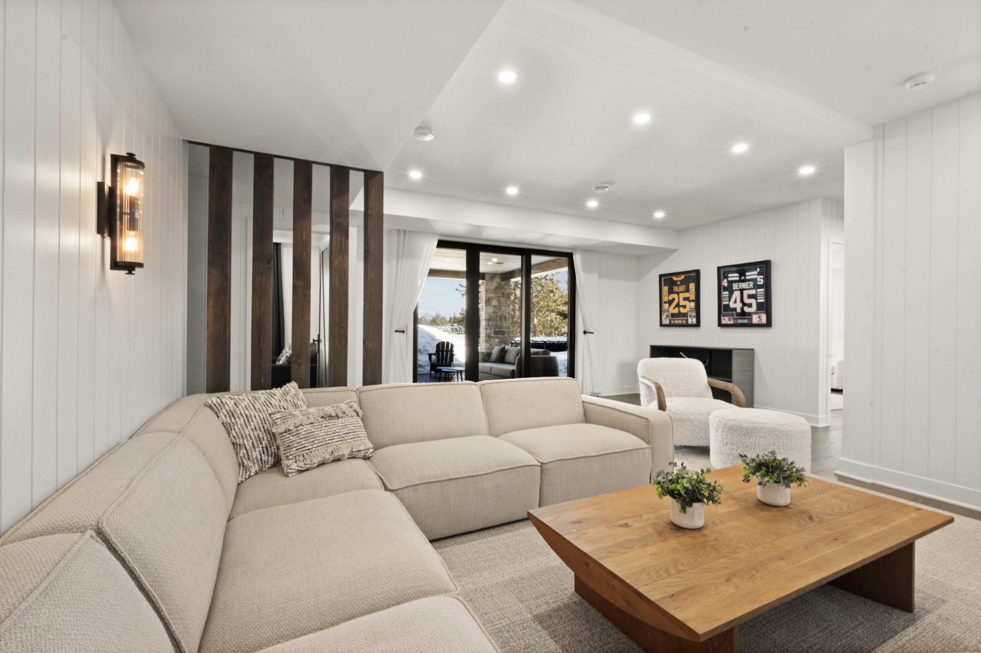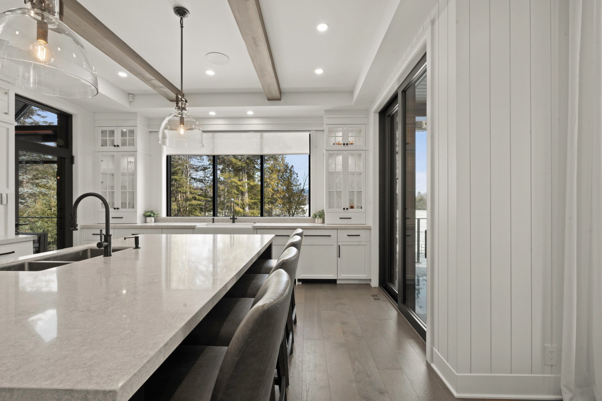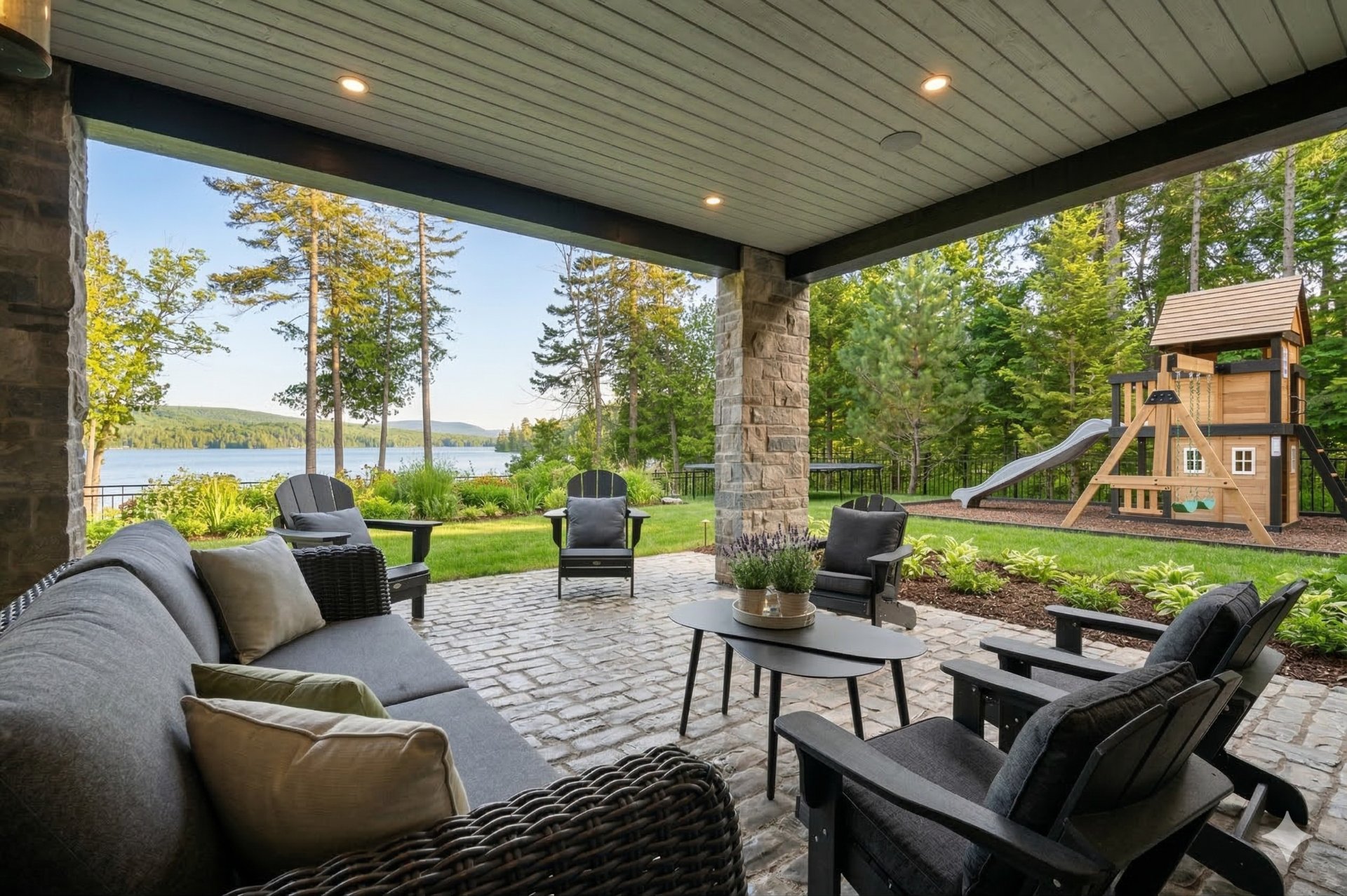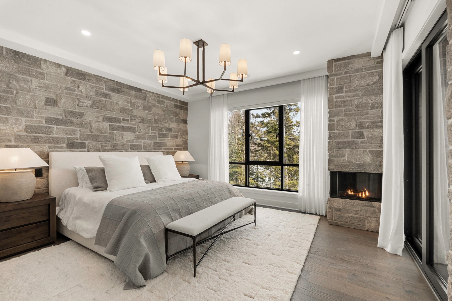 Adjacent to the kitchen, the three-season veranda offers a cozy and inviting ambiance with its wood-burning fireplace and Phantom retractable screen system. A true extension of the living space, it becomes a privileged place to enjoy the surrounding landscape.