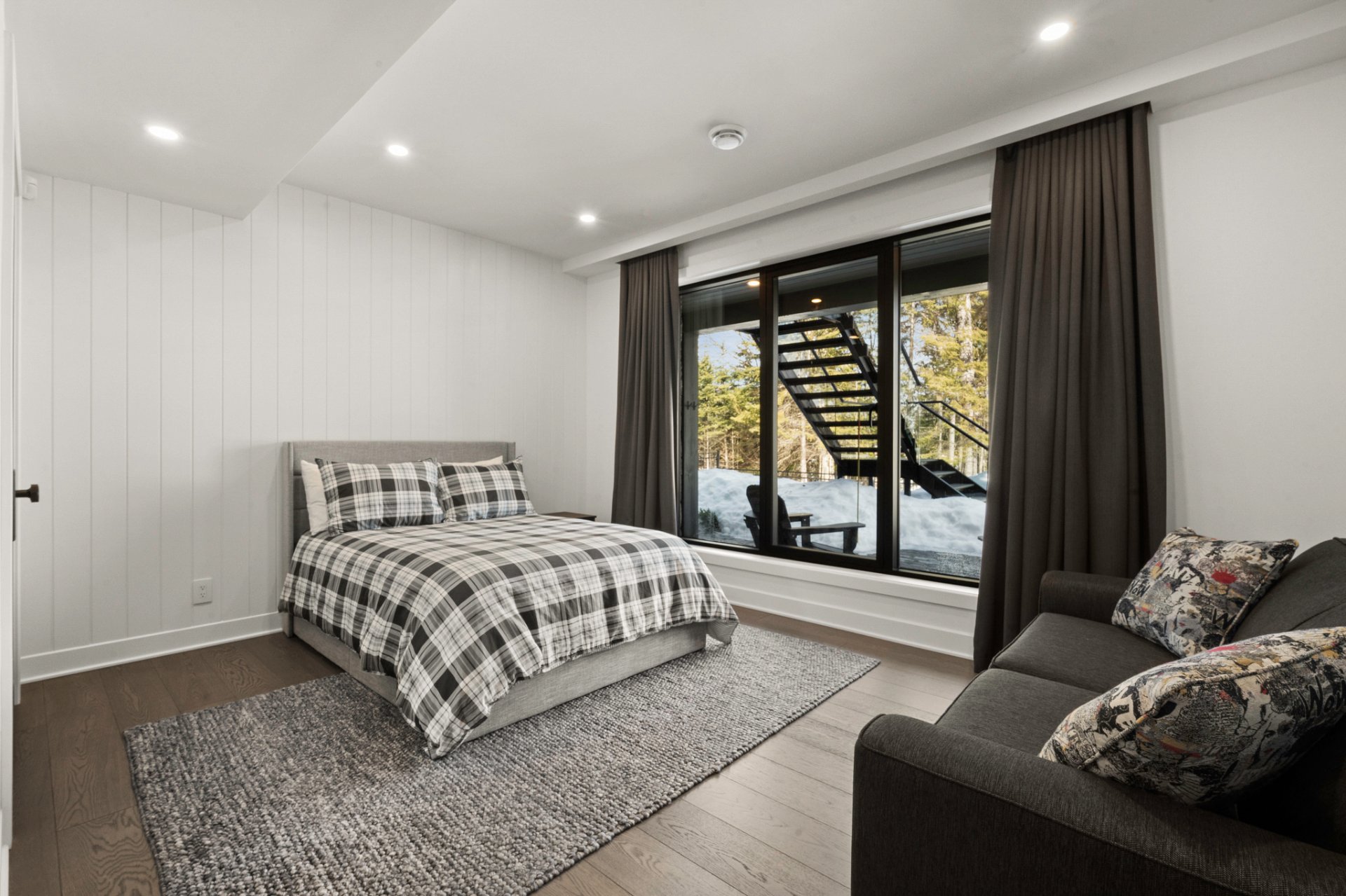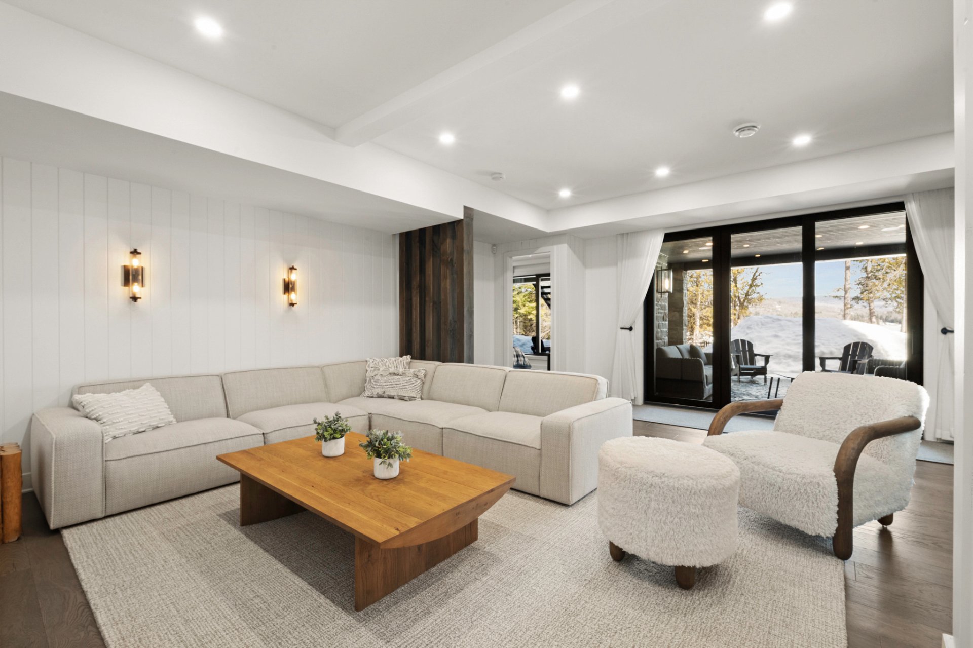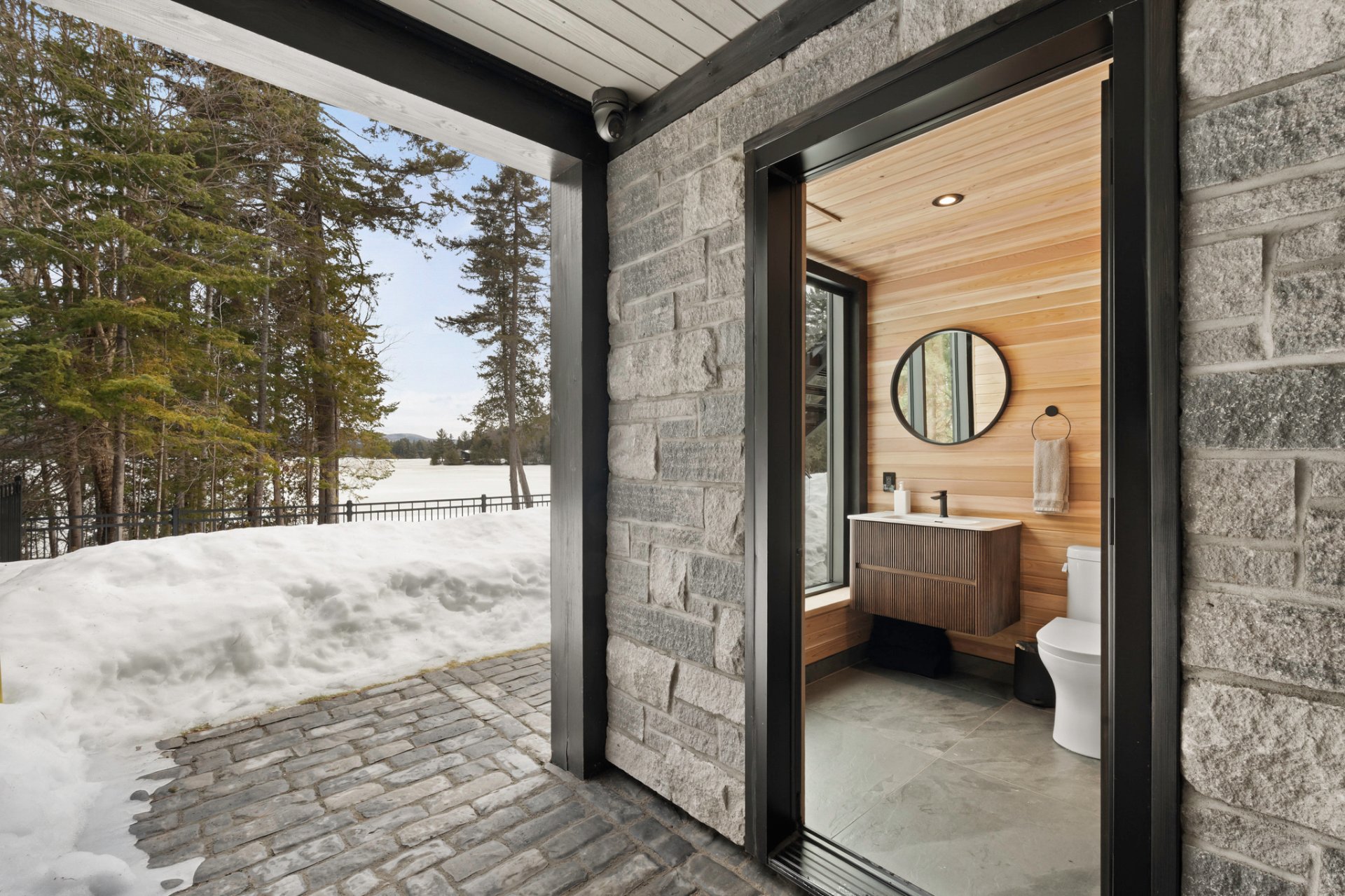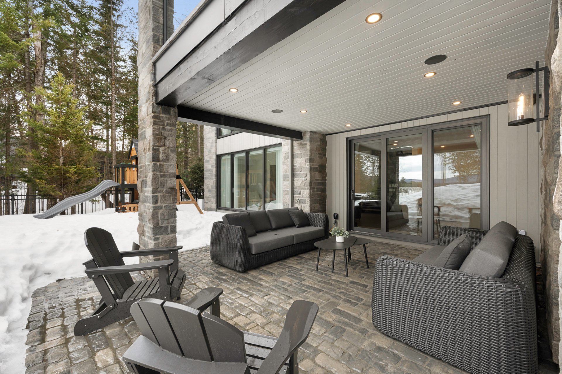 Adjacent to the kitchen, the three-season veranda offers a cozy and inviting ambiance with its wood-burning fireplace and Phantom retractable screen system. A true extension of the living space, it becomes a privileged place to enjoy the surrounding landscape.