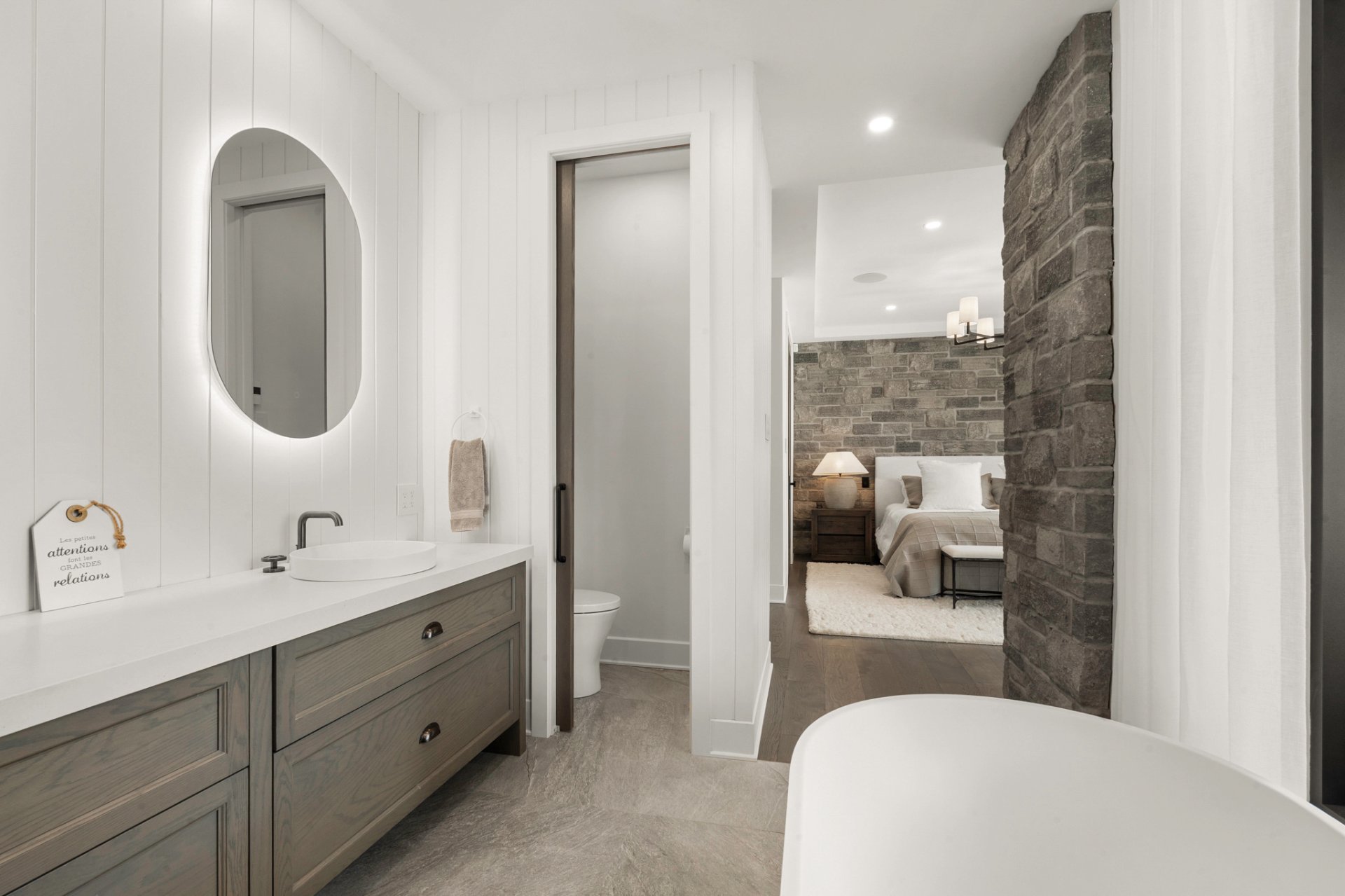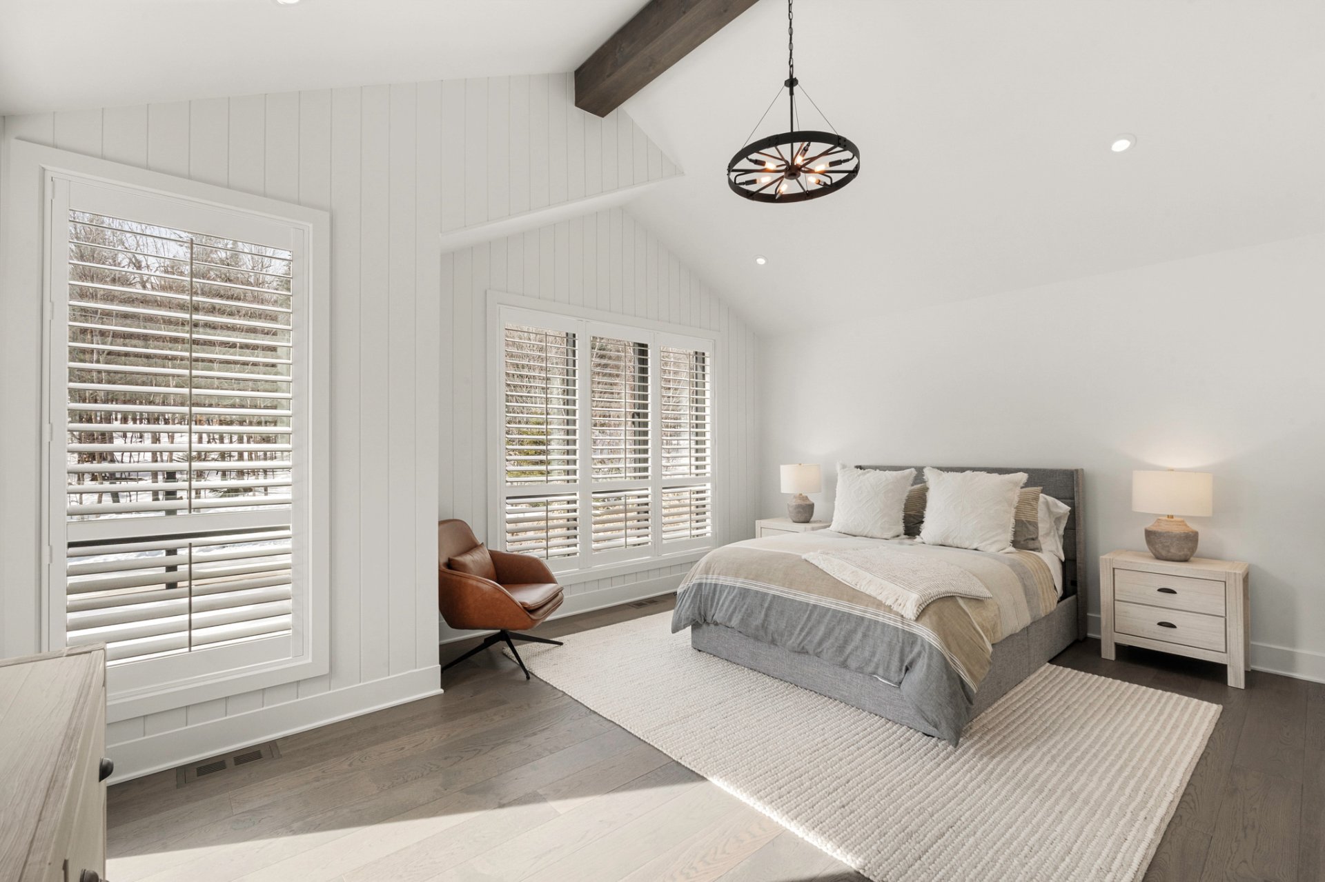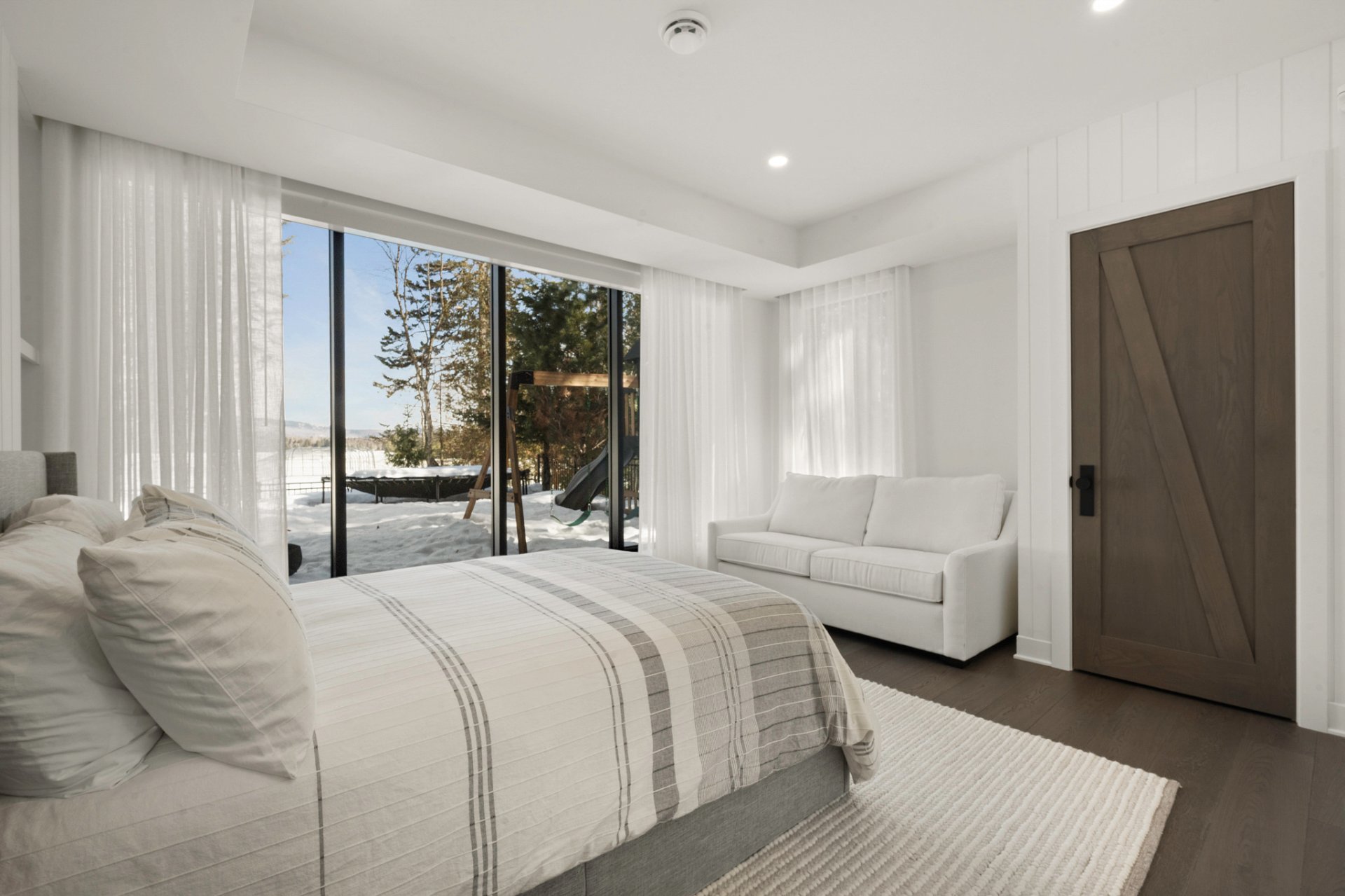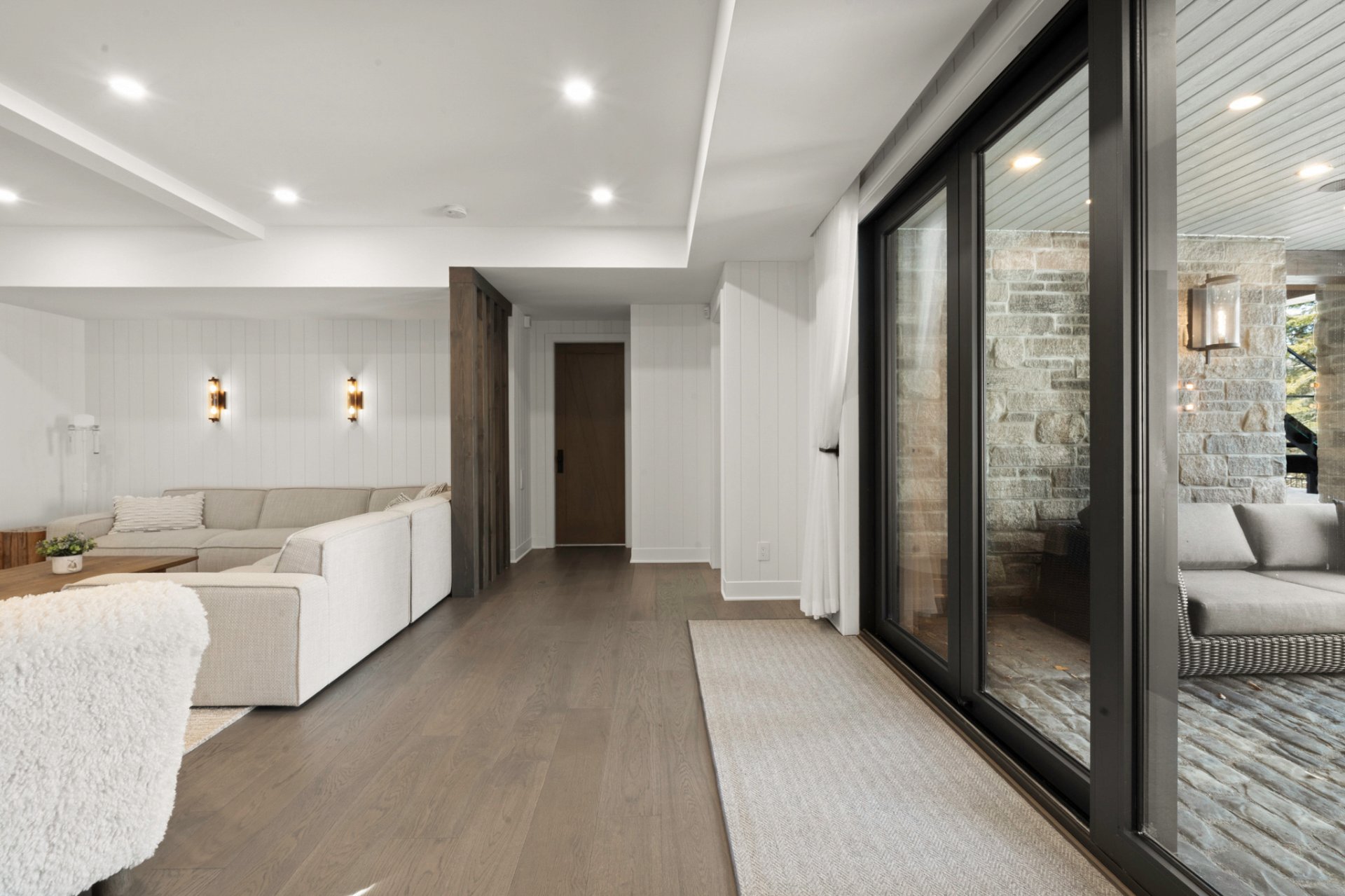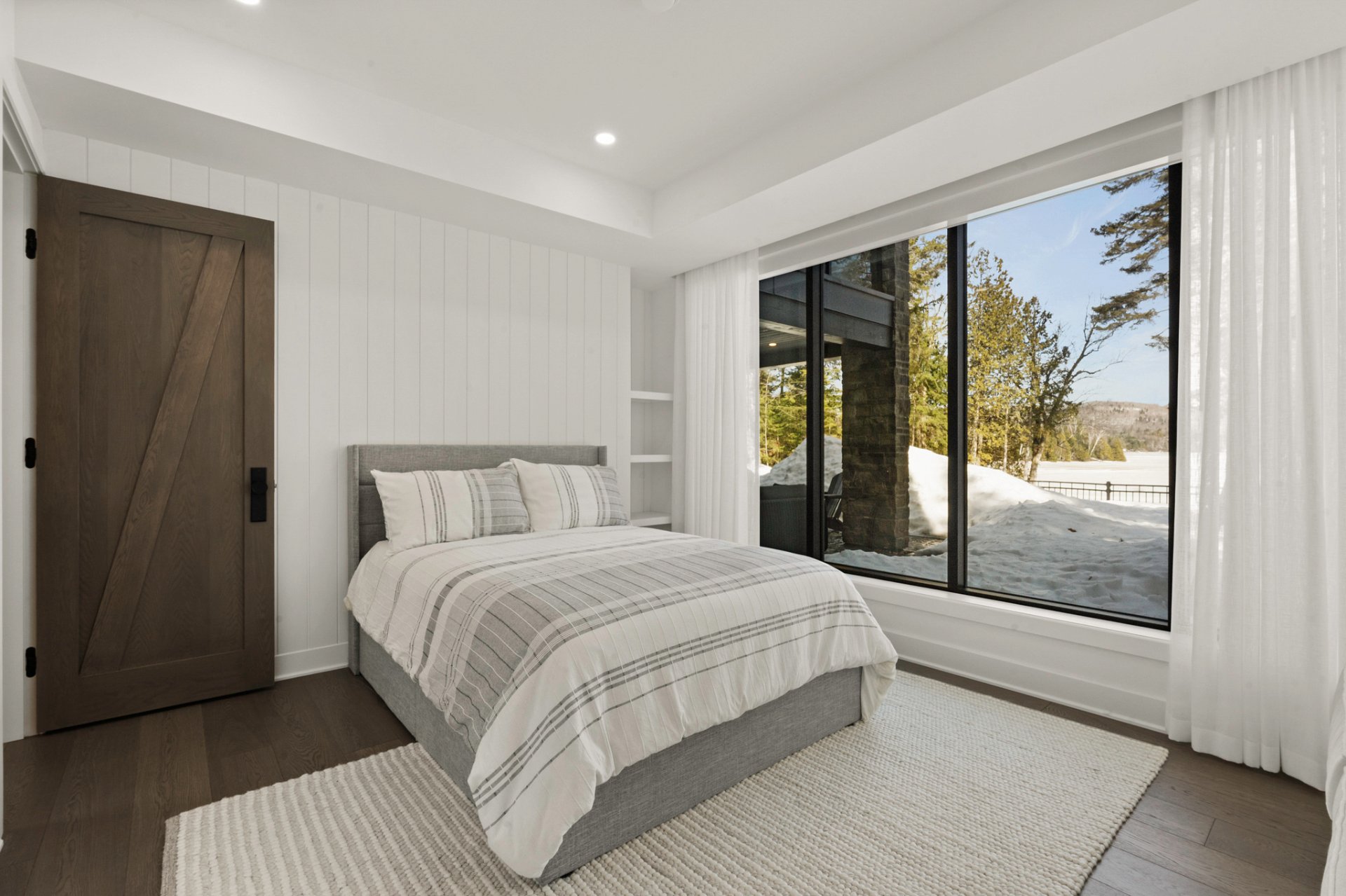 Adjacent to the kitchen, the three-season veranda offers a cozy and inviting ambiance with its wood-burning fireplace and Phantom retractable screen system. A true extension of the living space, it becomes a privileged place to enjoy the surrounding landscape.