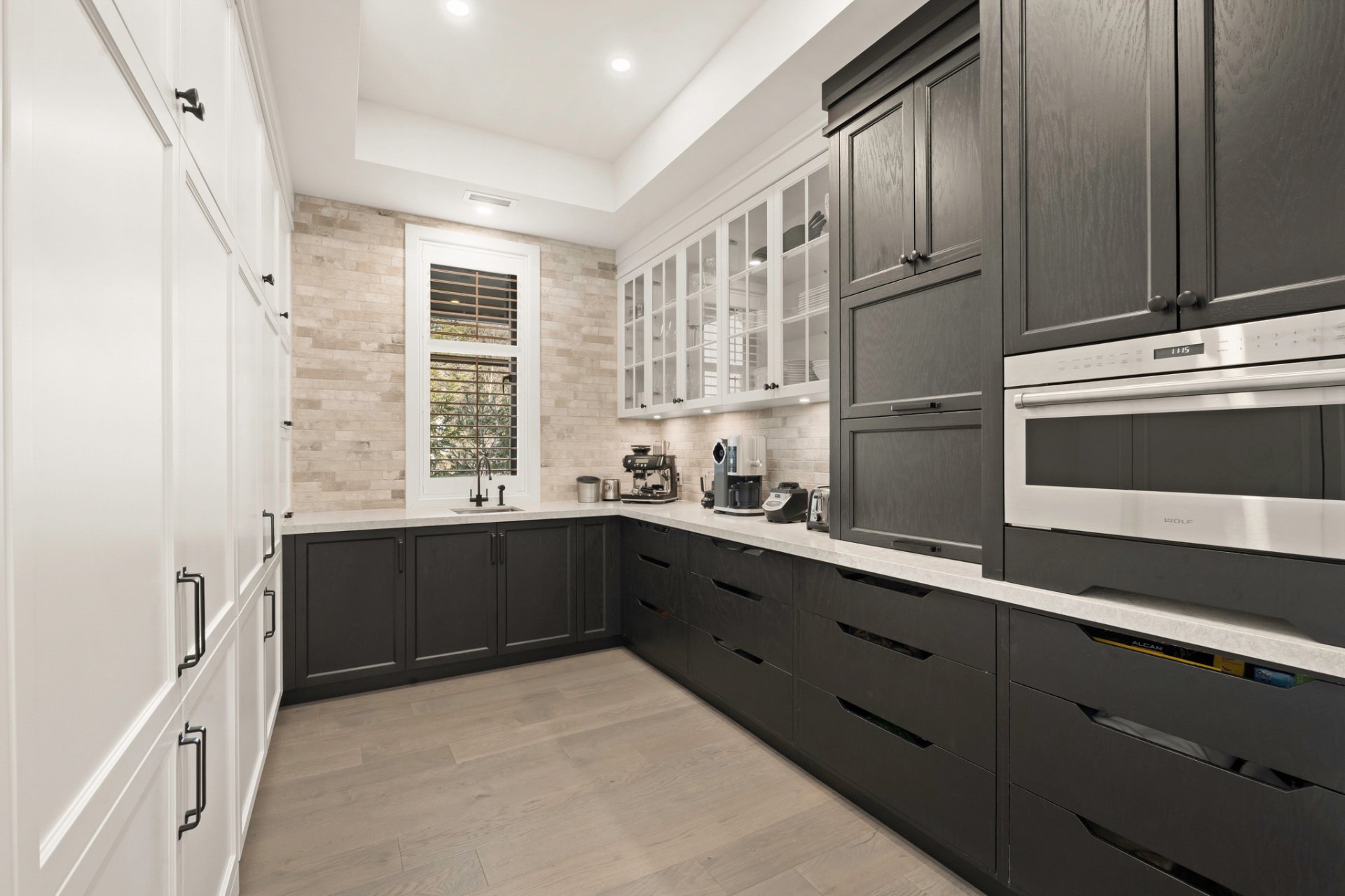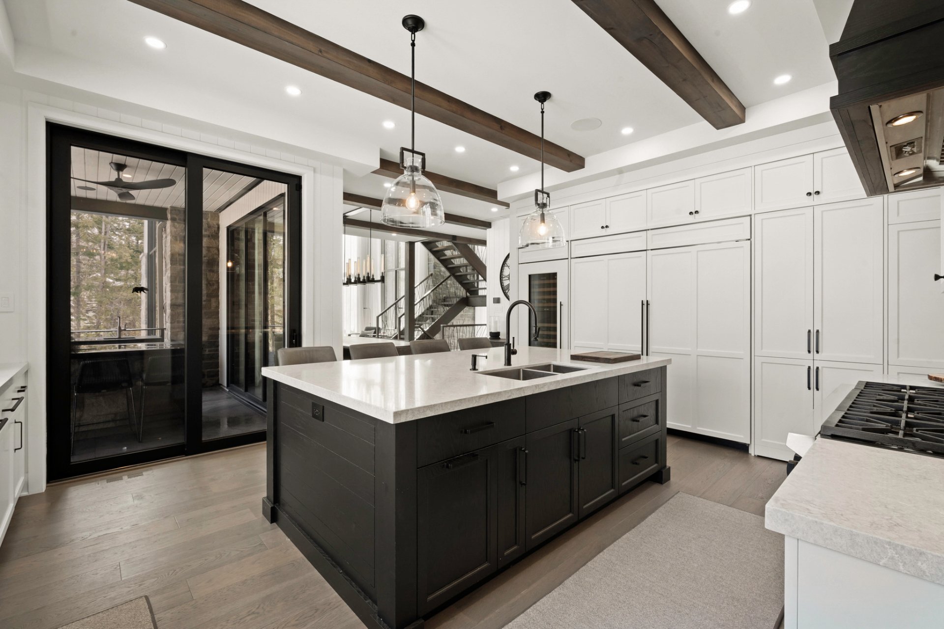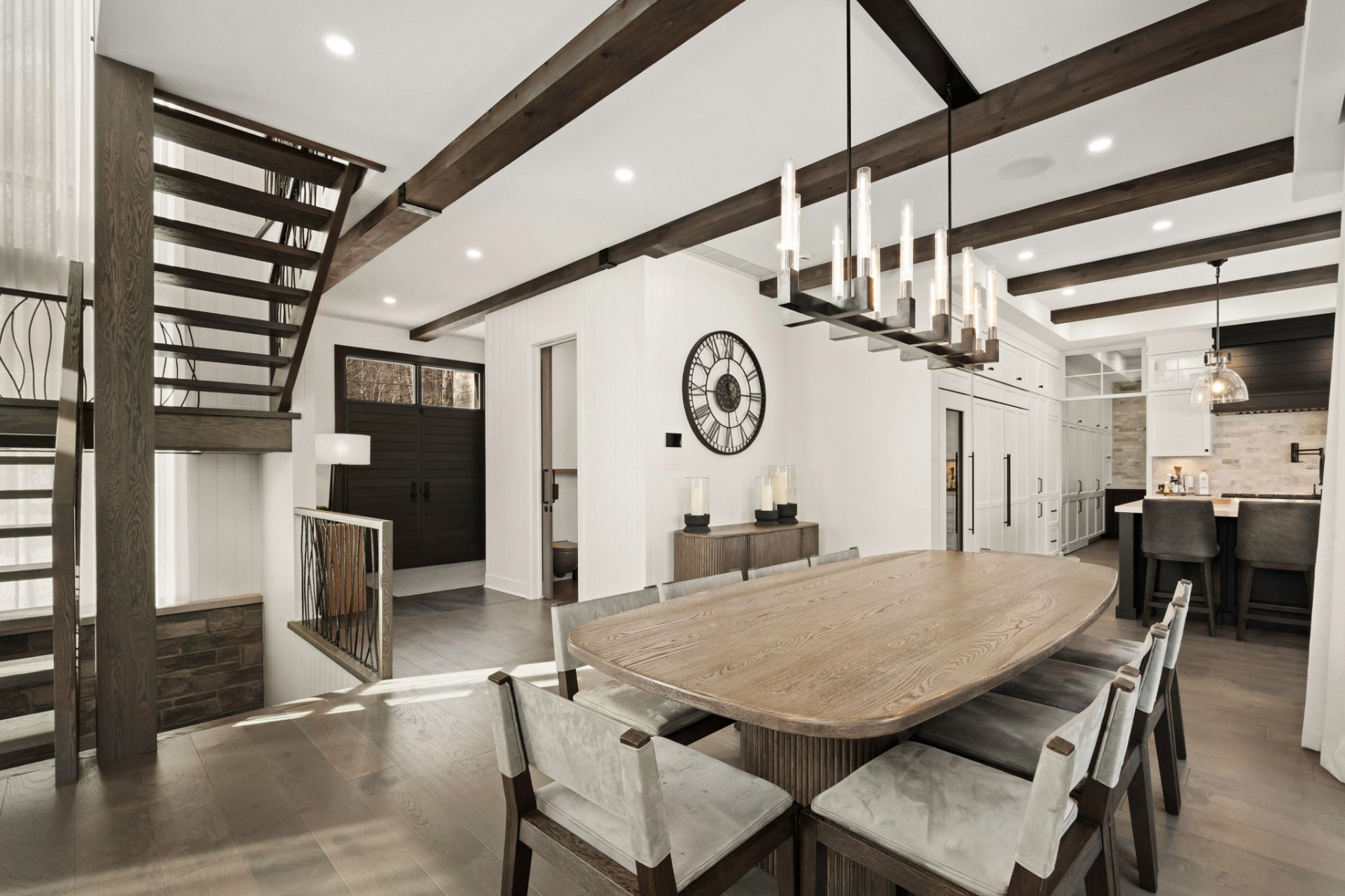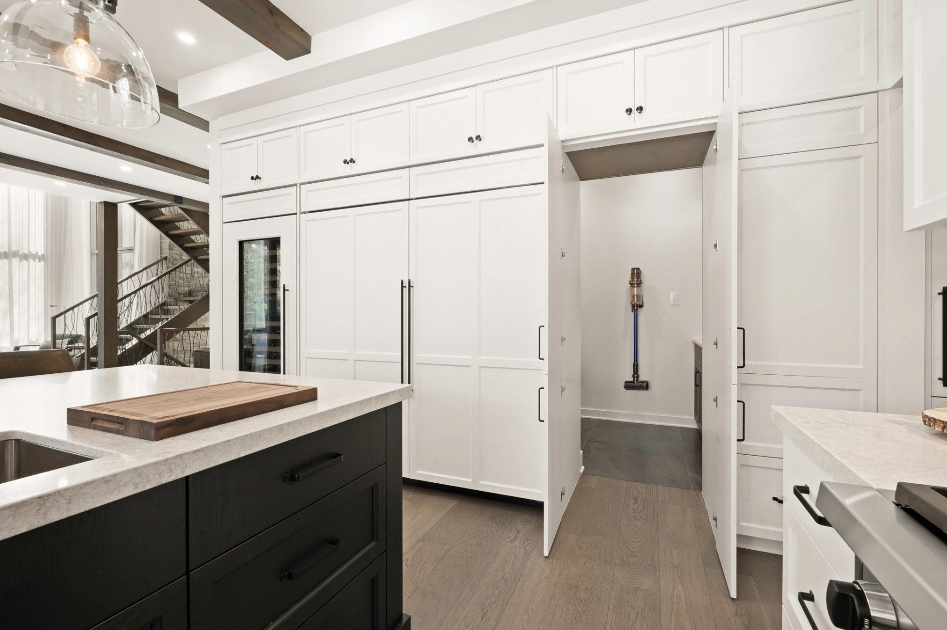 Designed for entertaining and gathering, the kitchen features full-height wood cabinetry, a large central island, and high-end appliances. An impressive back kitchen completes the space, offering both functionality and discretion during gatherings. A discreet laundry room with a laundry chute serving the upper level integrates seamlessly into the layout.