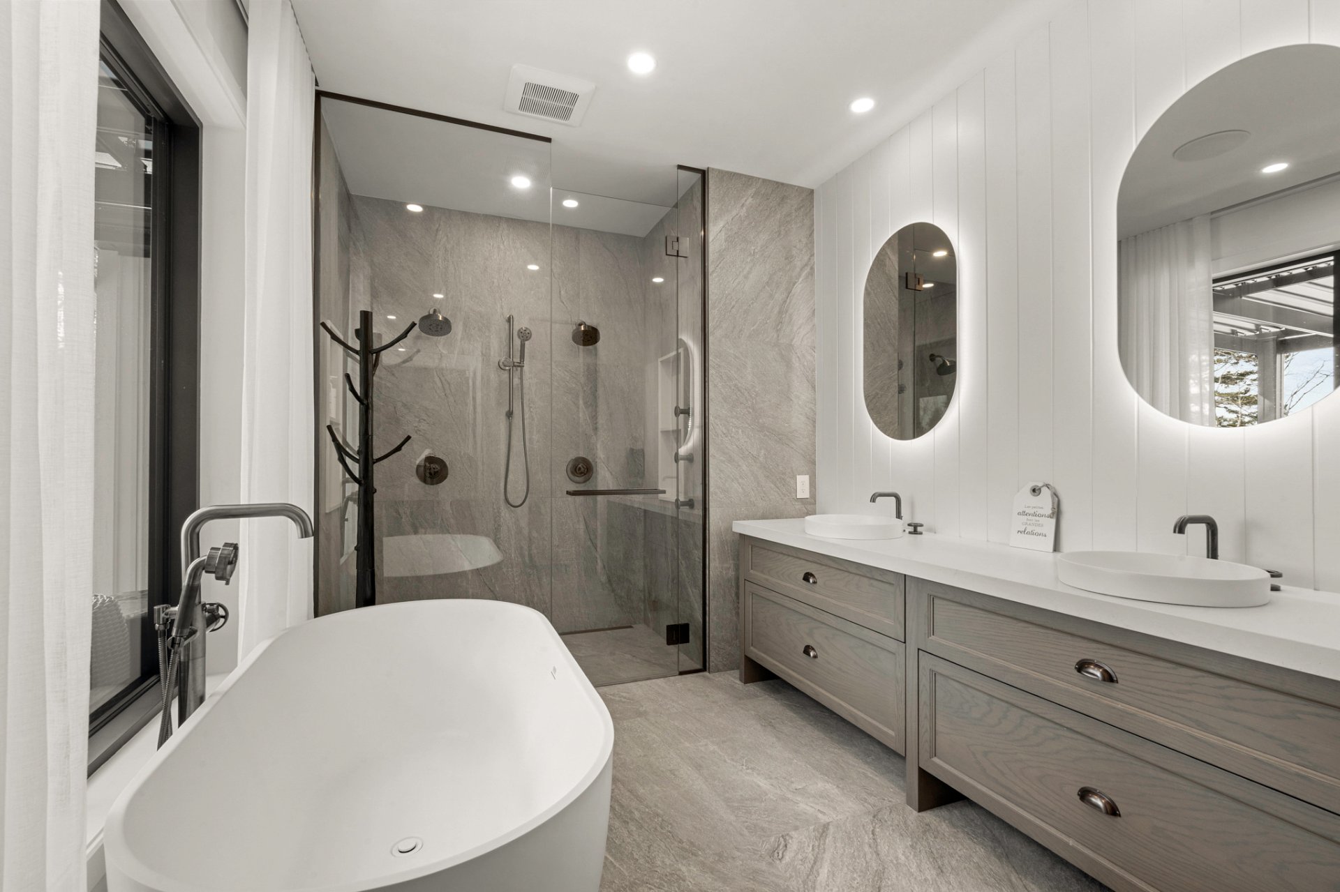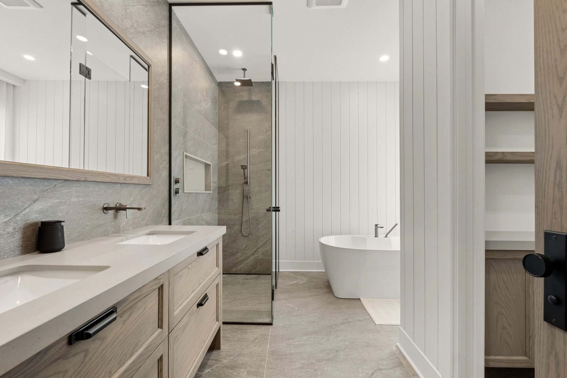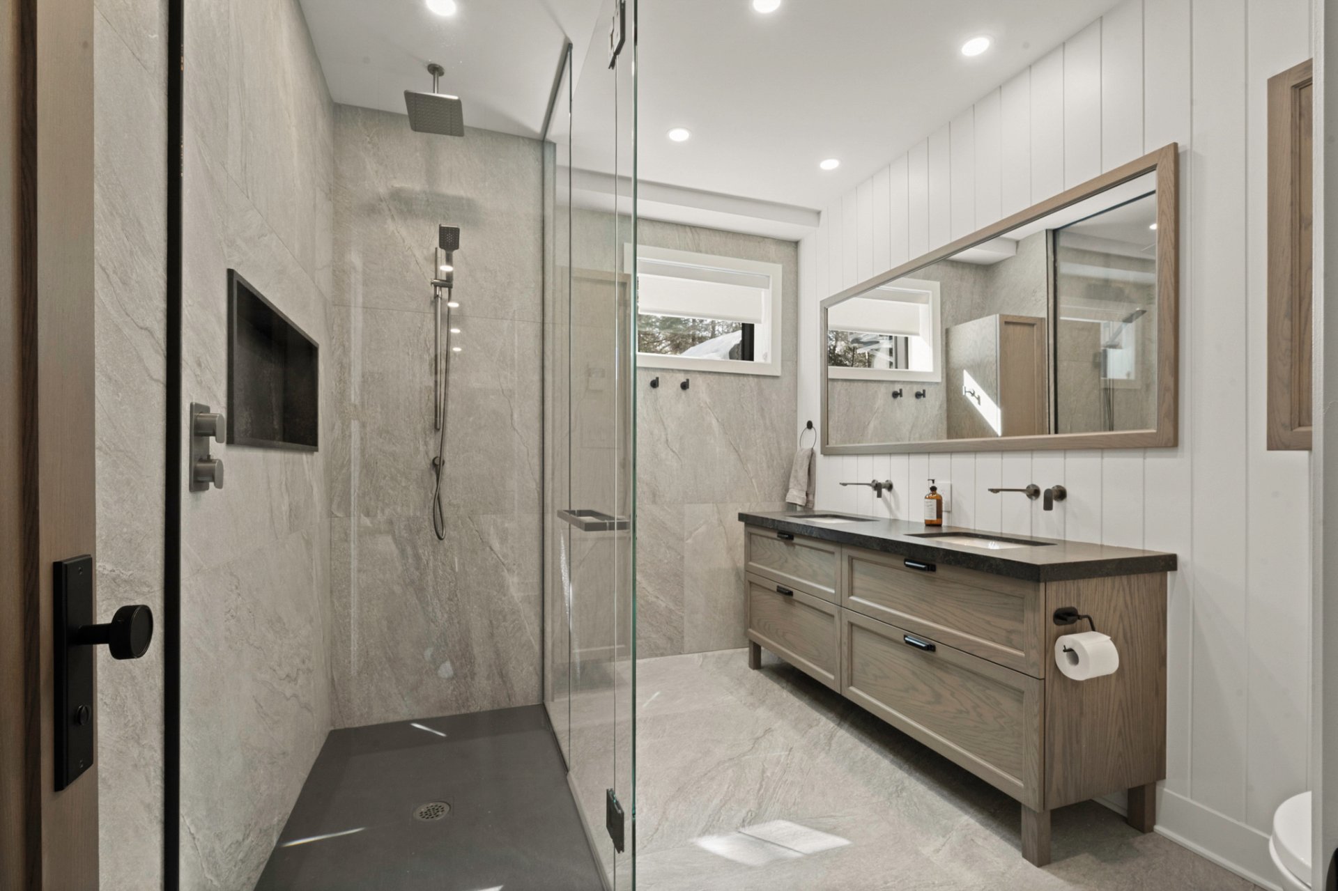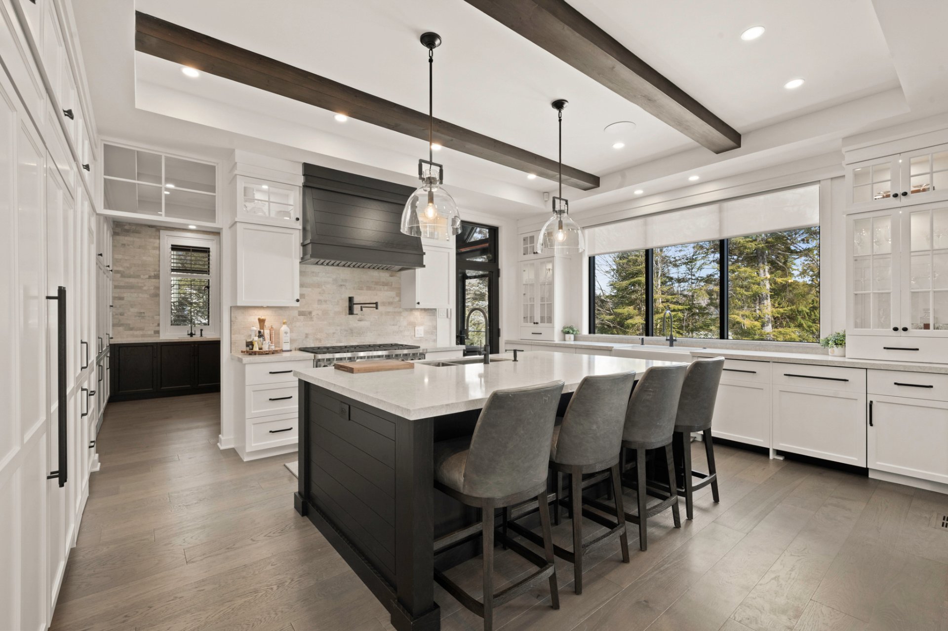 Designed for entertaining and gathering, the kitchen features full-height wood cabinetry, a large central island, and high-end appliances. An impressive back kitchen completes the space, offering both functionality and discretion during gatherings. A discreet laundry room with a laundry chute serving the upper level integrates seamlessly into the layout.