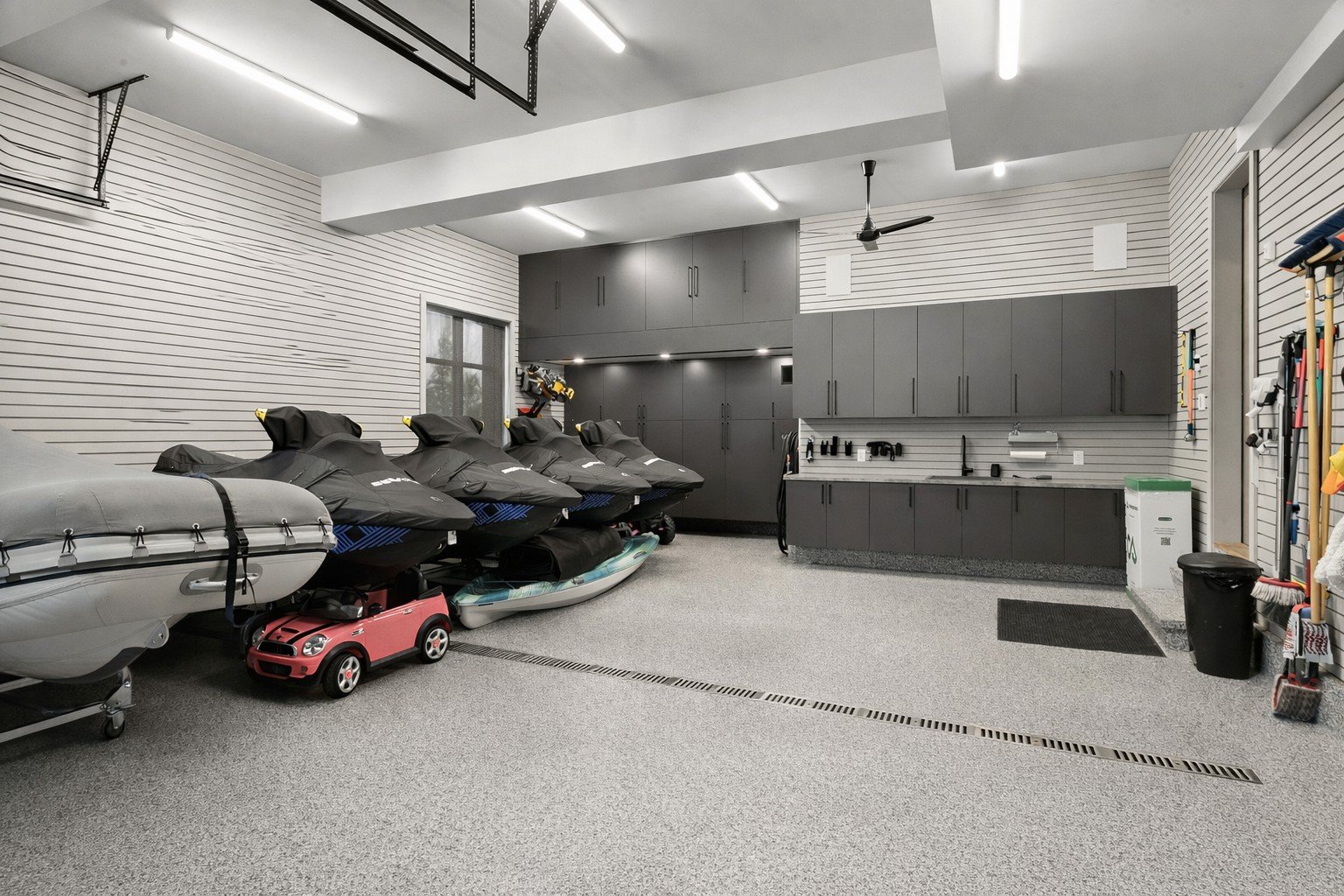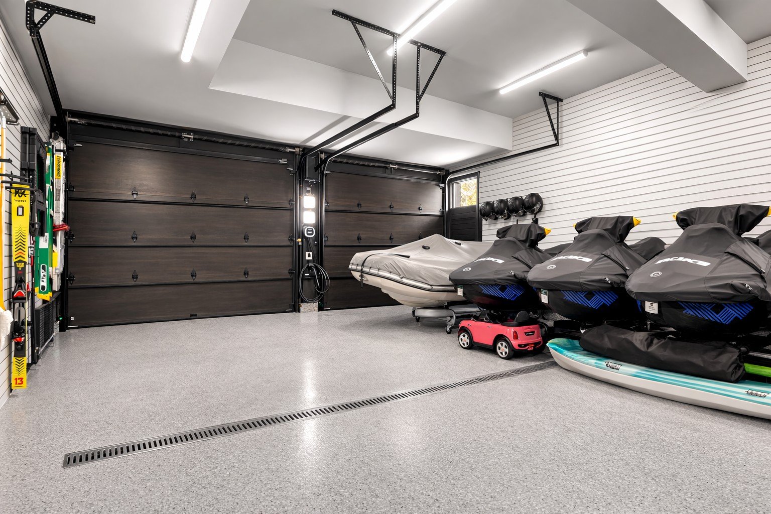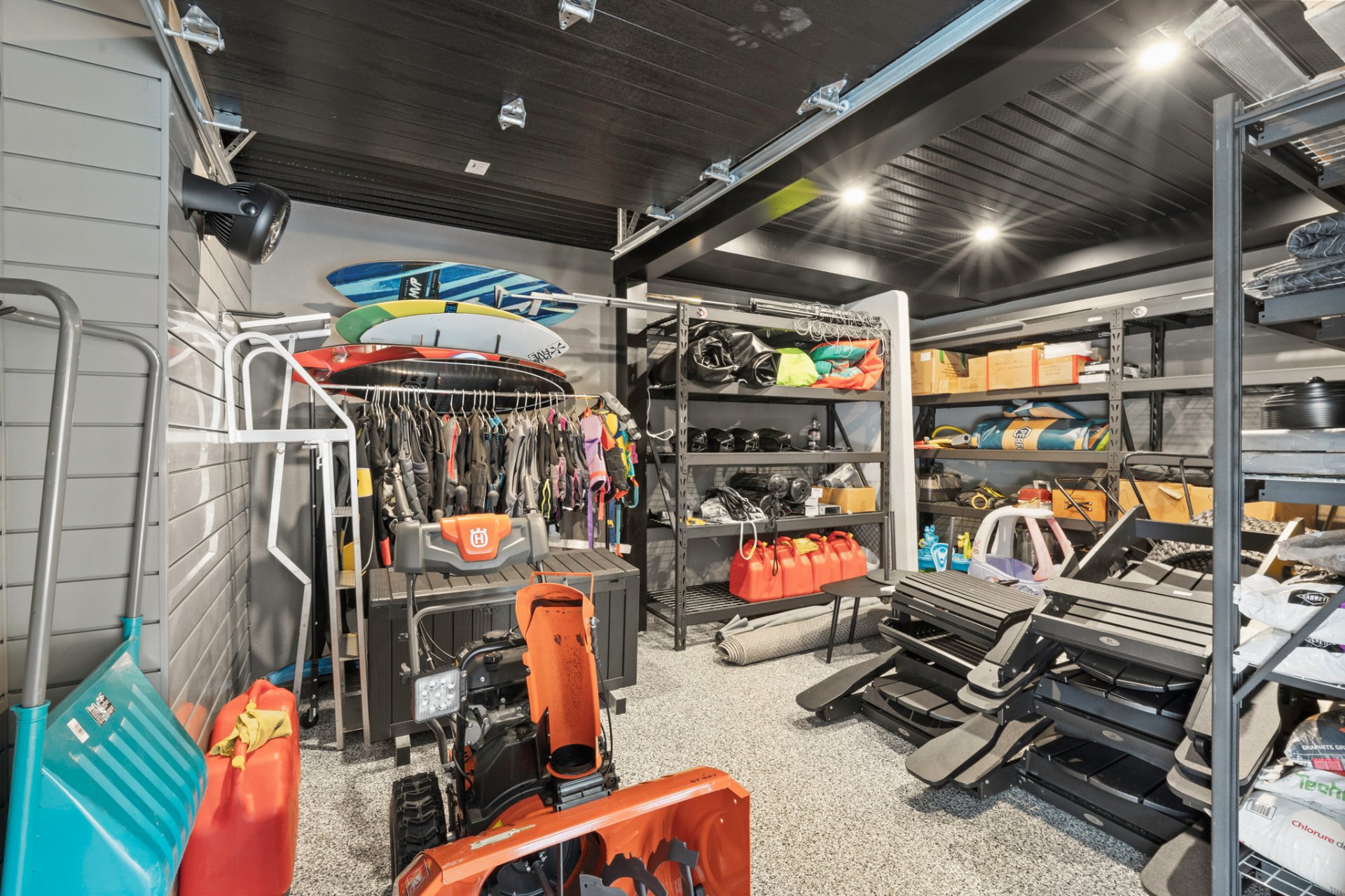 The fully finished triple garage features heated epoxy flooring and custom wall-mounted storage.