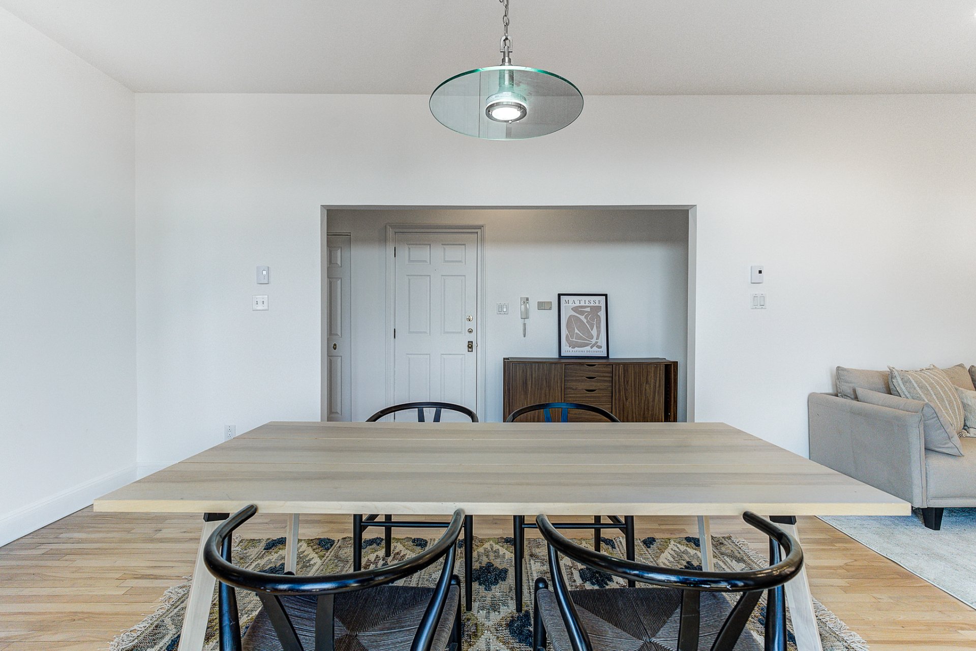 The main living area is inviting and spacious, centered around a cozy fireplace that adds warmth and character to the space. Light hardwood floors flow seamlessly throughout, enhancing the clean, contemporary aesthetic. The dining area opens onto a private balcony through arched wooden French doors, offering a peaceful spot to enjoy your morning coffee or unwind in the evening.