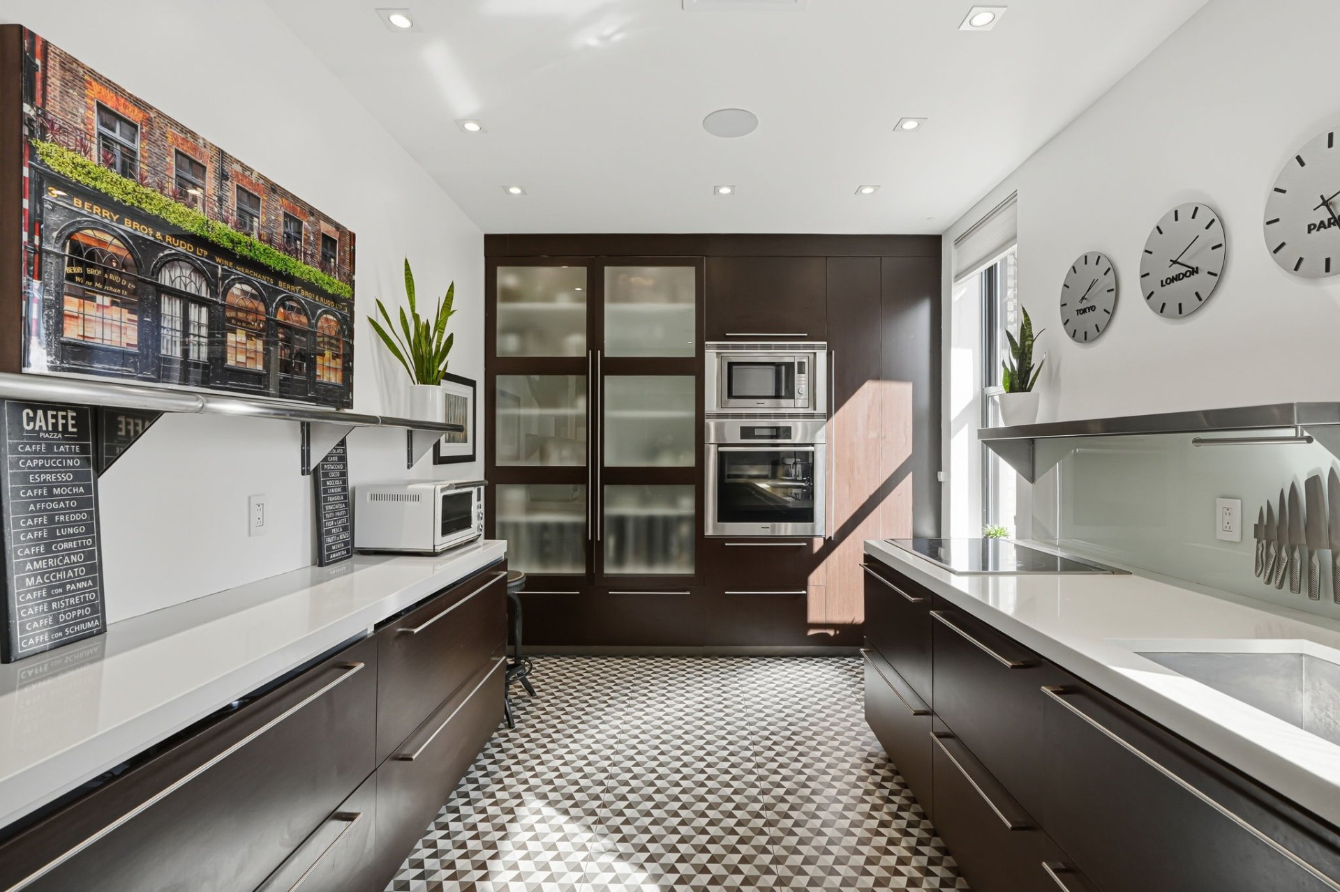 - 36-inch built-in Sub-Zero refrigerator/freezer, Miele built-in oven, Panasonic built-in microwave oven, Fagor induction cooktop and Bosch built-in vertical ventilation fan, Bosch built-in dishwasher, all curtains, blinds and shades, lighting fixtures (except exclusions), 75-inch Samsung smart television with Sonos Arc soundbar, 10 ceiling-mounted built-in speakers with wall controls, and two built-in mirrored medicine cabinets in the bathrooms.