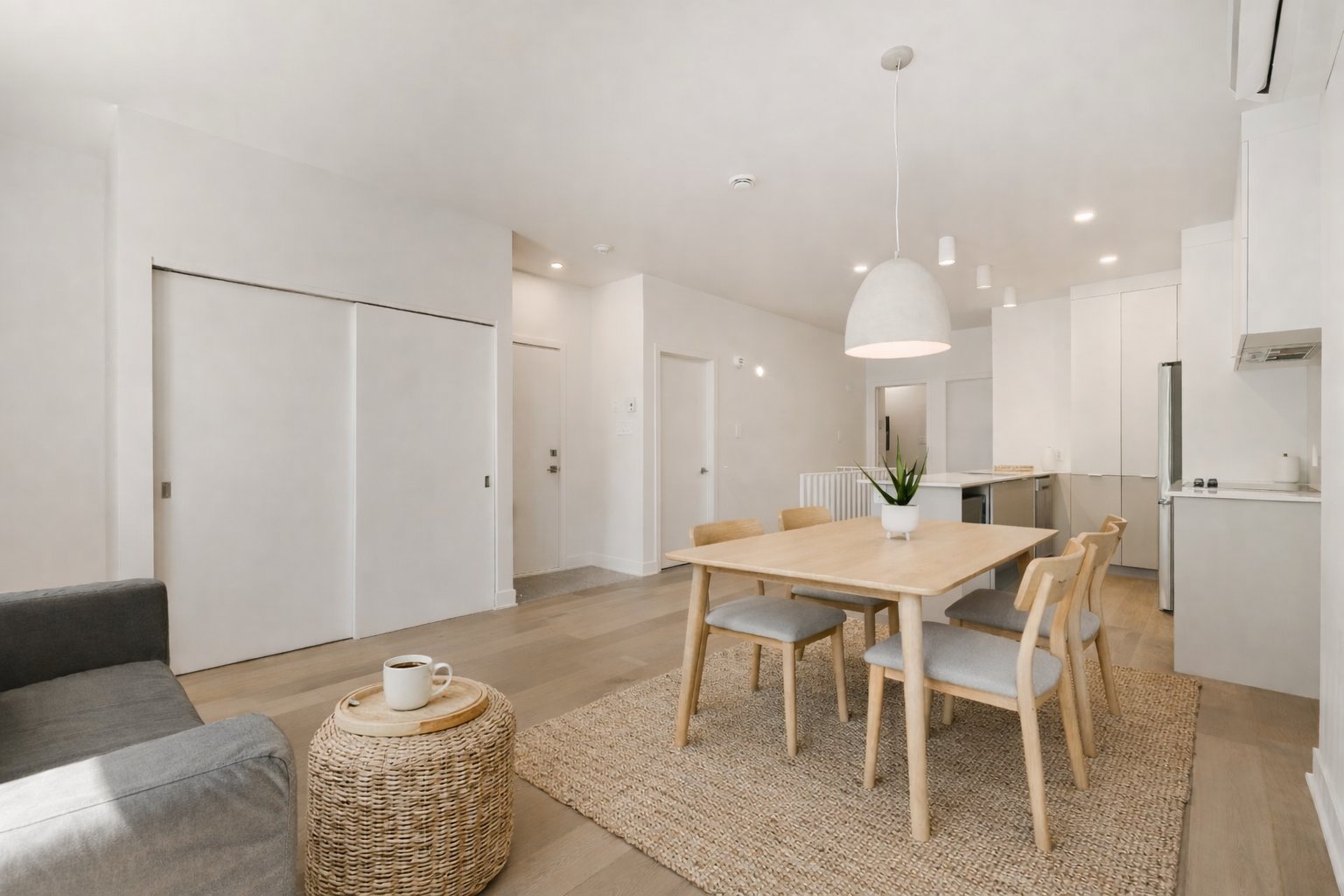 High-end architectural unit completed in 2023 by the firm CARTA. Stunning Scandinavian-style divided co-ownership spread over two levels, featuring three bedrooms and two full bathrooms. Bright living area with high ceilings and abundant windows, facing due south. Refined finishes include engineered oak flooring, a kitchen with quartz countertops and backsplash, a freestanding bathtub, and glass showers. Balcony on the main floor and a private English courtyard at the garden level. Samsung appliances included, wall-mounted heat pumps on each floor, and large storage space. Prime location near metro stations, parks, and shops.