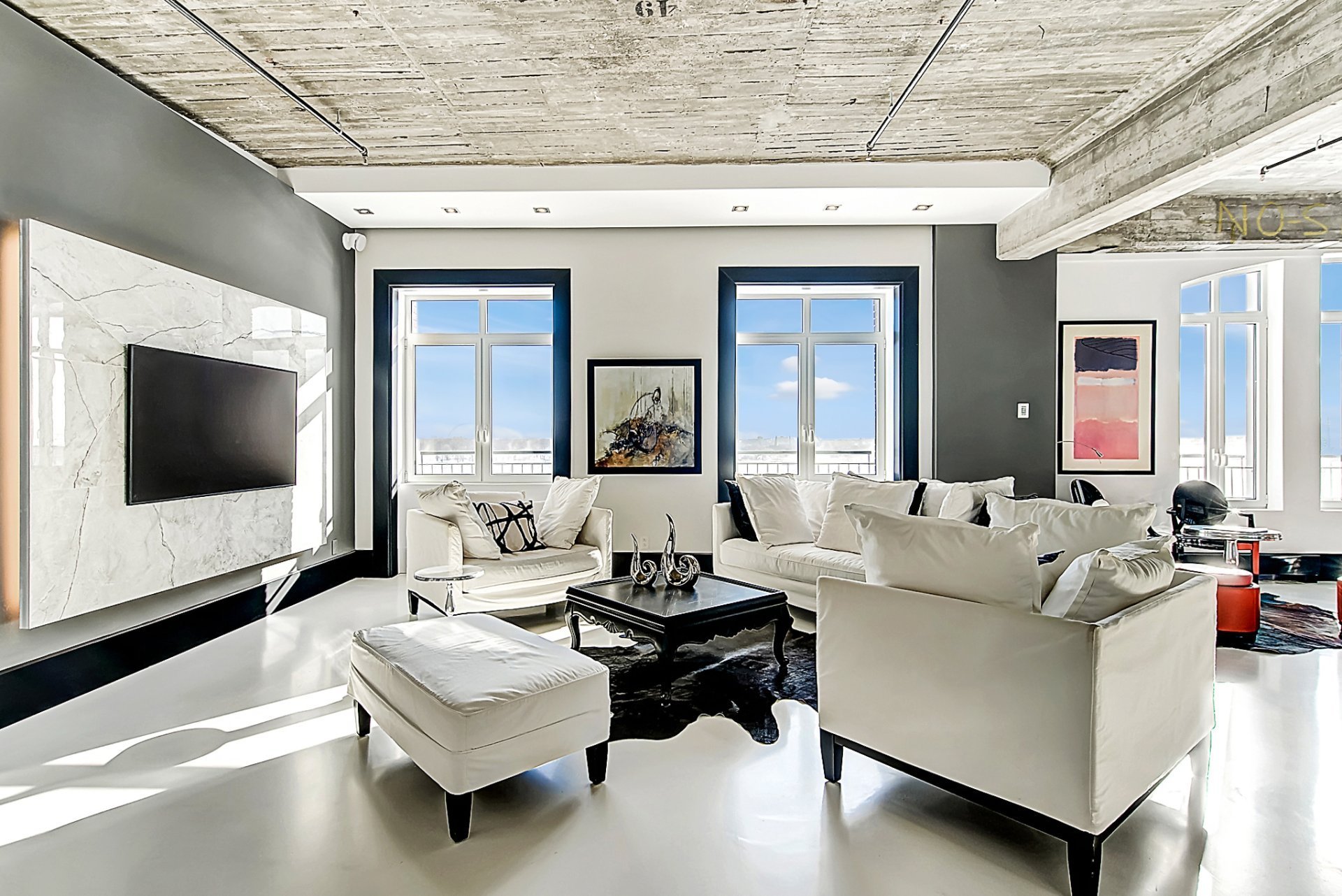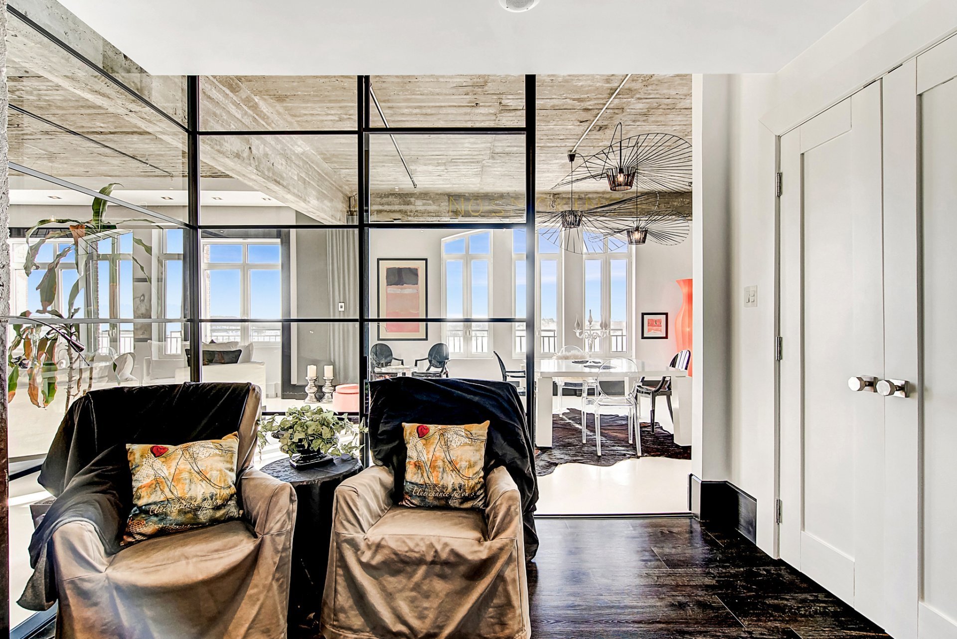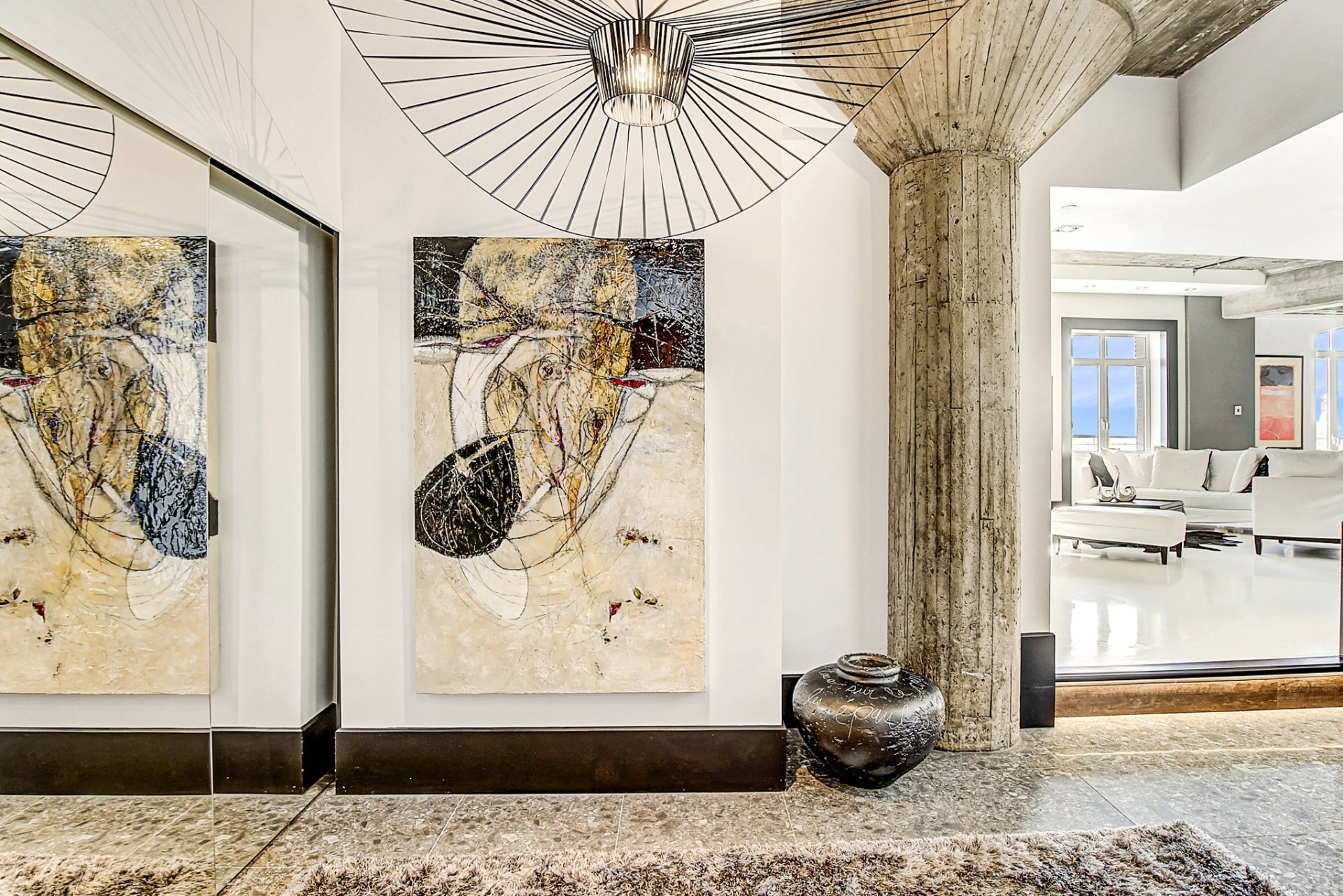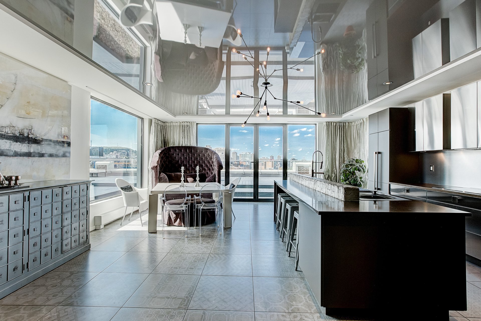 Discover an exceptional penthouse at the top of L'Héritage du Vieux-Port. Spanning five floors with a private elevator, it features a spectacular terrace offering panoramic views of the river, marina, and Mount Royal. The luxurious interior boasts a high-end kitchen and spa-style bathrooms. The property includes two distinct units with private entrances, offering a bi-generational option ideal for teenagers, parents, guests, or staff. Building amenities include a saltwater pool and spa. Ideally located in vibrant Old Montreal, with easy access to the airport.