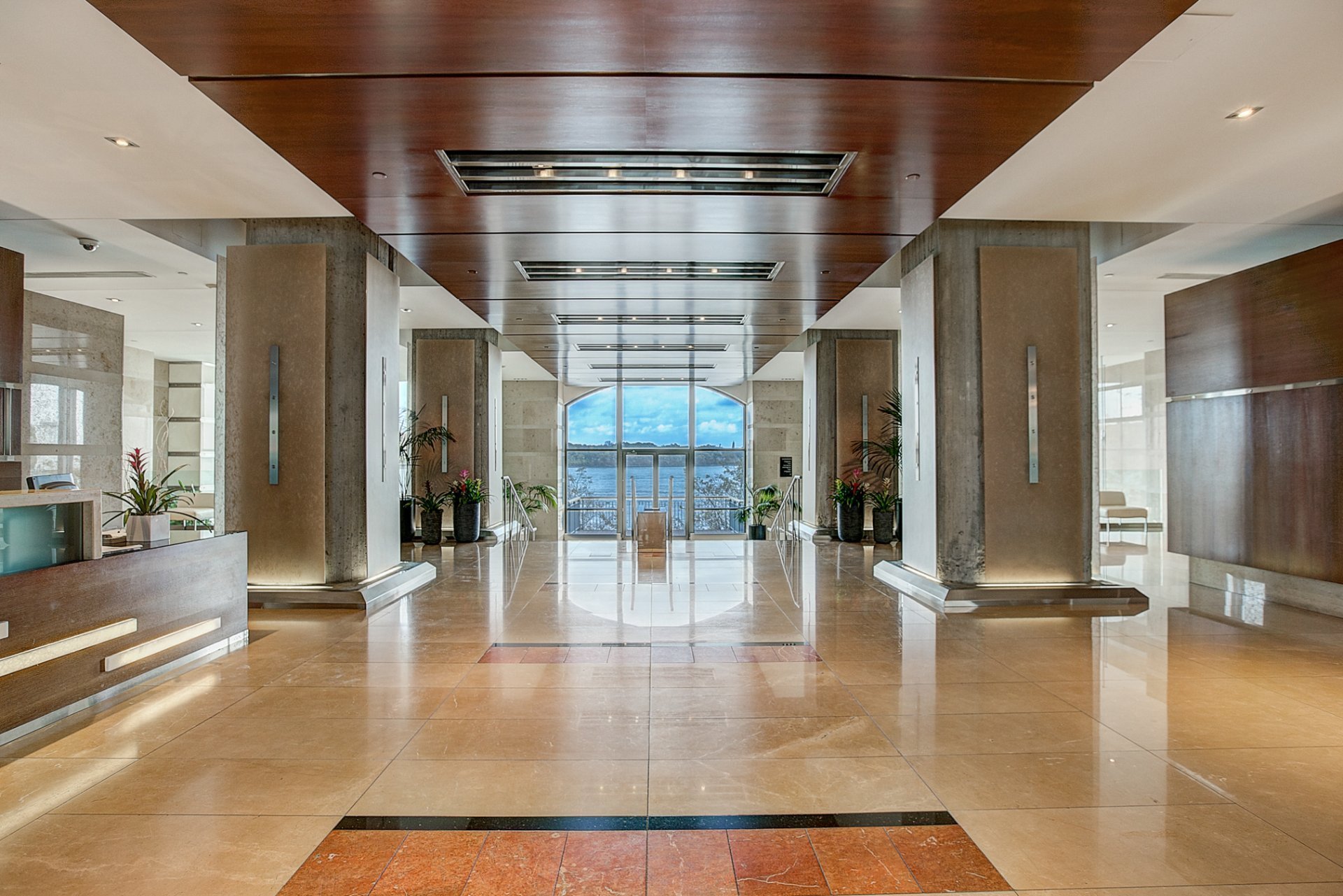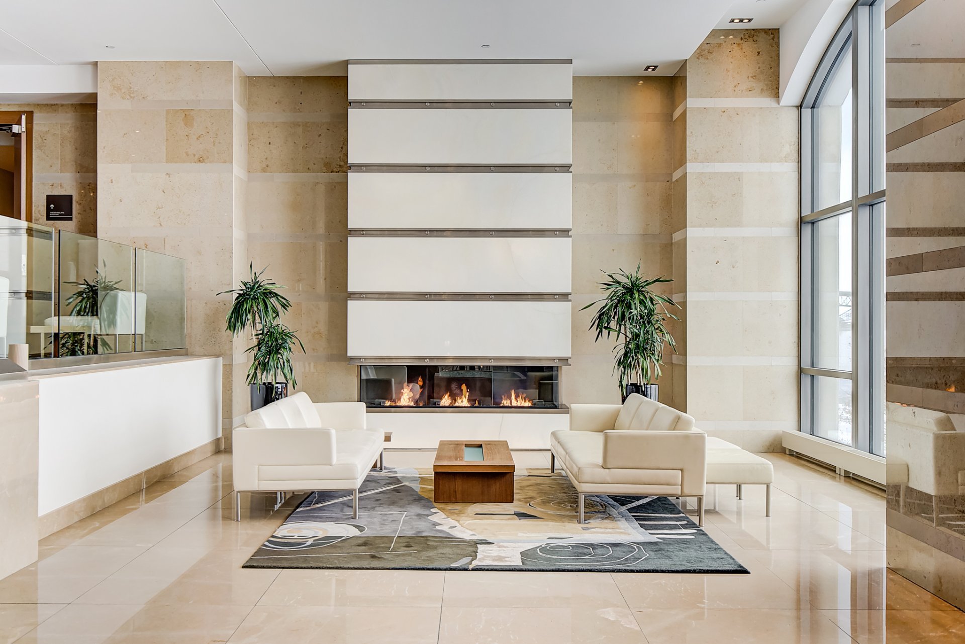 - Main entrance with waiting area, fireplace, and breathtaking views of the St. Lawrence River