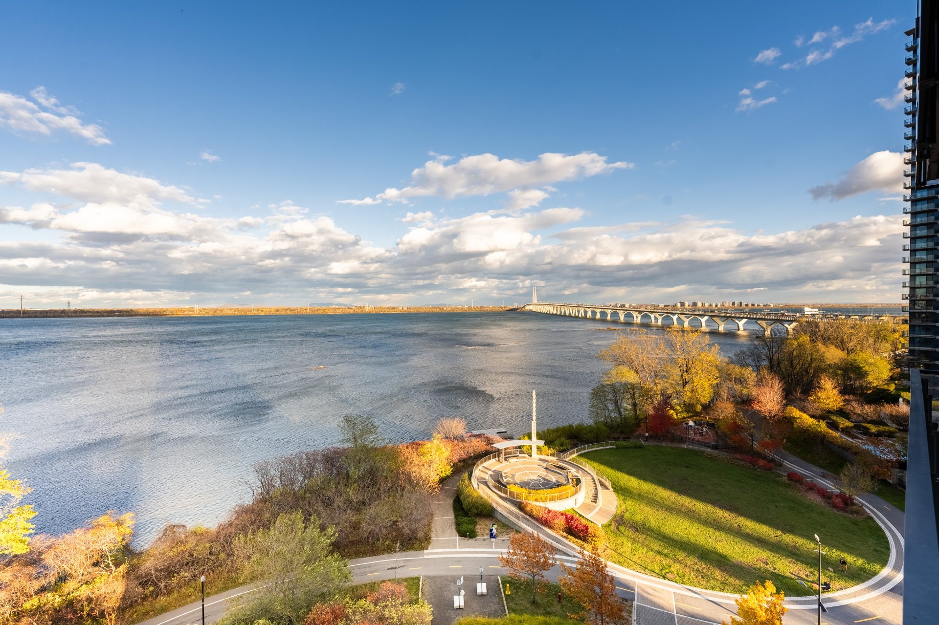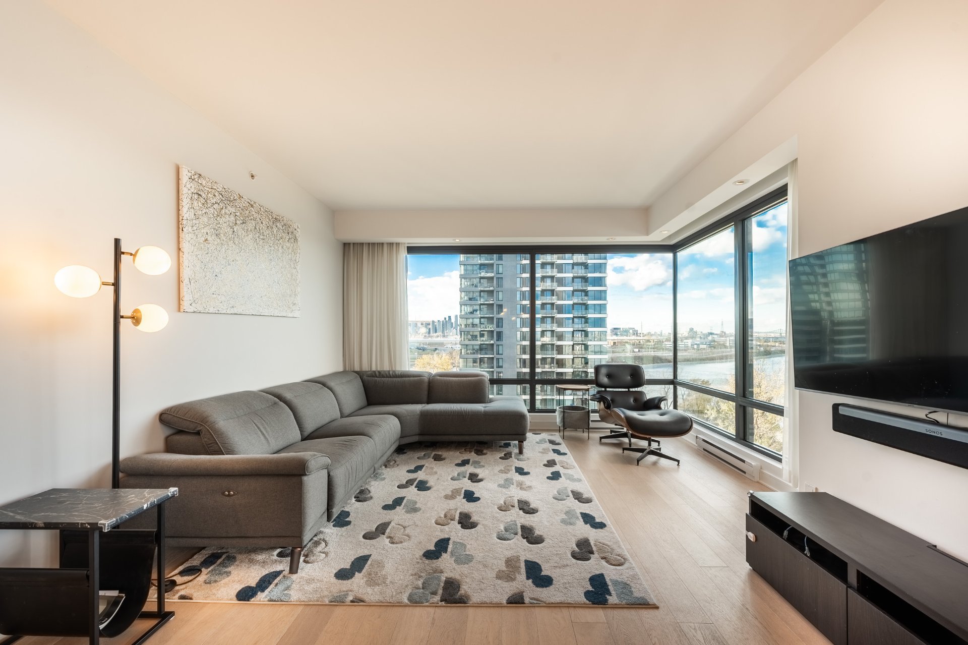 Stunning corner unit flooded with natural light in the prestigious Évolo I tower, offering spectacular views of the river and city skyline. This 1,130 sq.ft. condo stands out with its floor-to-ceiling windows, open-concept layout, and refined finishes. Two bedrooms, including a primary suite with walk-in closet and ensuite bathroom. LEED-certified building with 24-hour concierge, indoor pool, spa, gym, guest suite, and riverside gardens. Heating, air conditioning, and hot water included. Two indoor parking spaces and large storage locker.