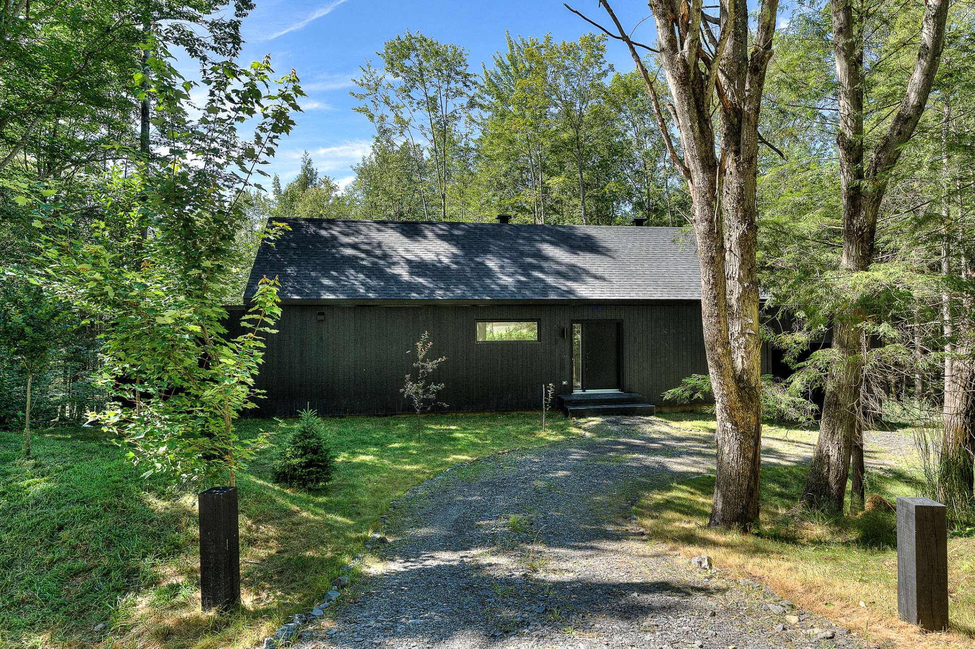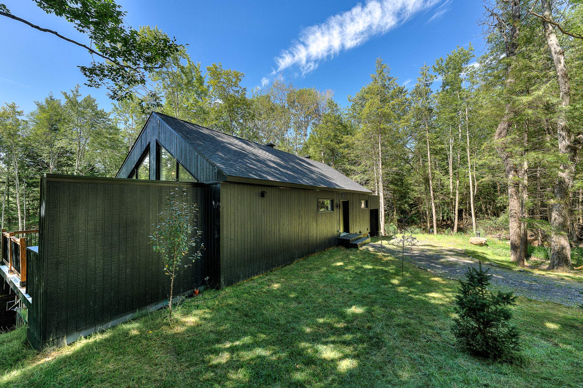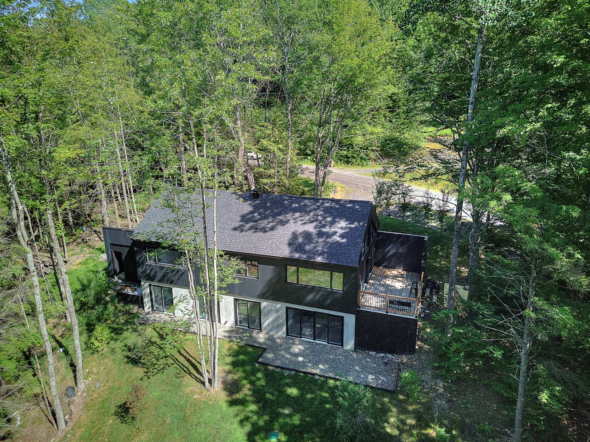 Discover a unique property combining Scandinavian design and modern comfort, nestled in the prestigious Domaine Mon-Louis in Sutton. This house, with its sleek, contemporary style, captivates at first glance thanks to its black exterior cladding and simple architectural lines, perfectly blending into the surrounding nature.