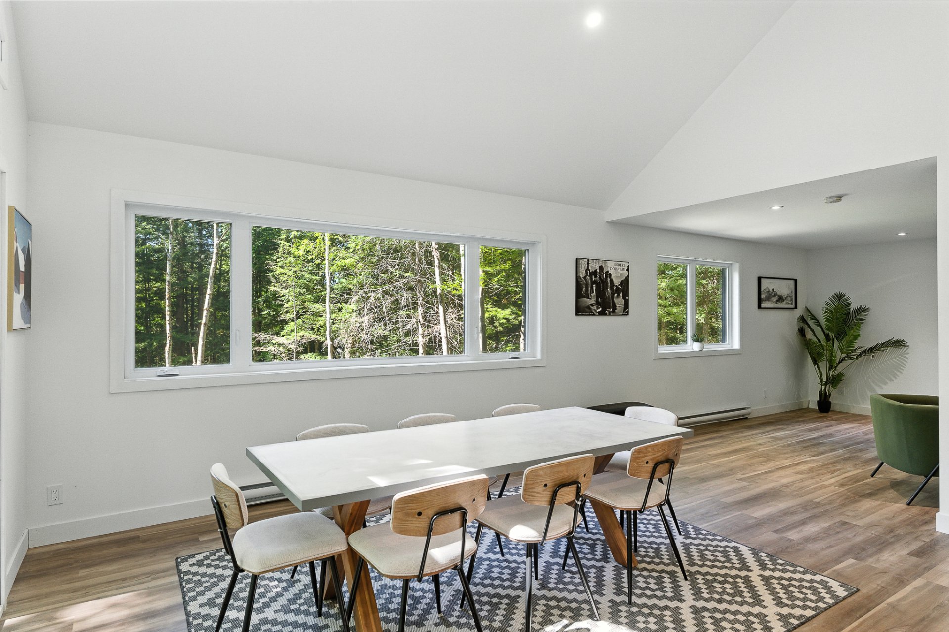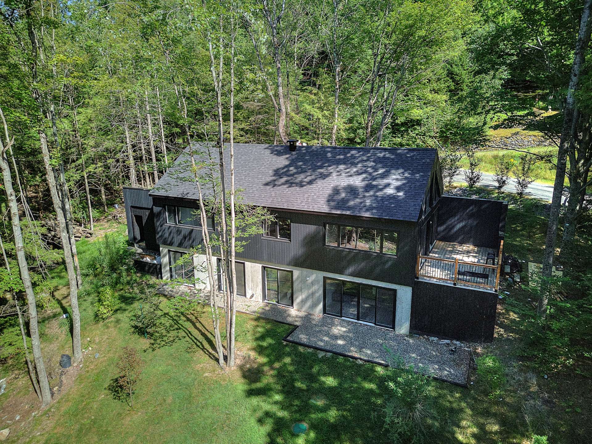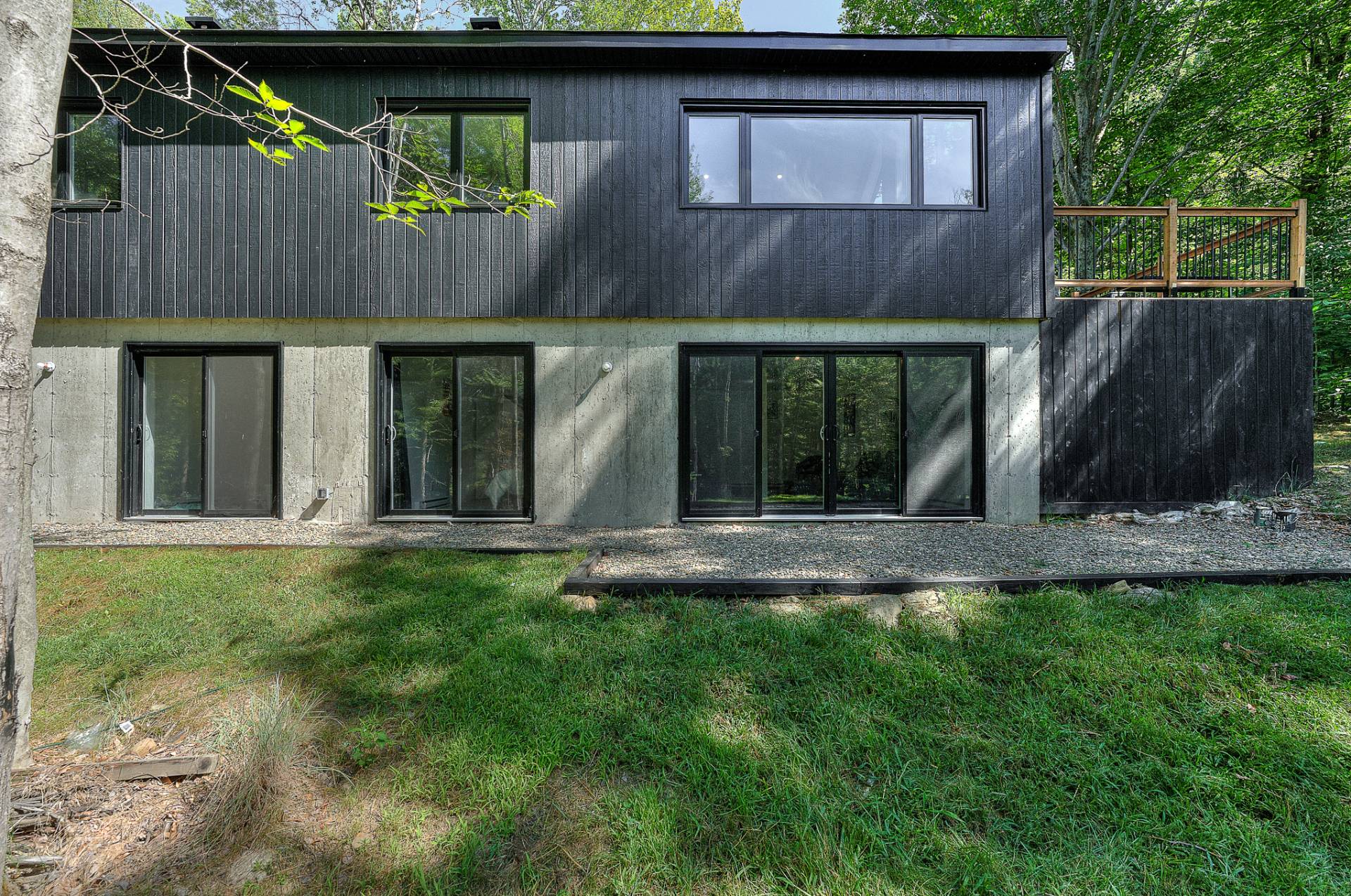 Discover a unique property combining Scandinavian design and modern comfort, nestled in the prestigious Domaine Mon-Louis in Sutton. This house, with its sleek, contemporary style, captivates at first glance thanks to its black exterior cladding and simple architectural lines, perfectly blending into the surrounding nature.