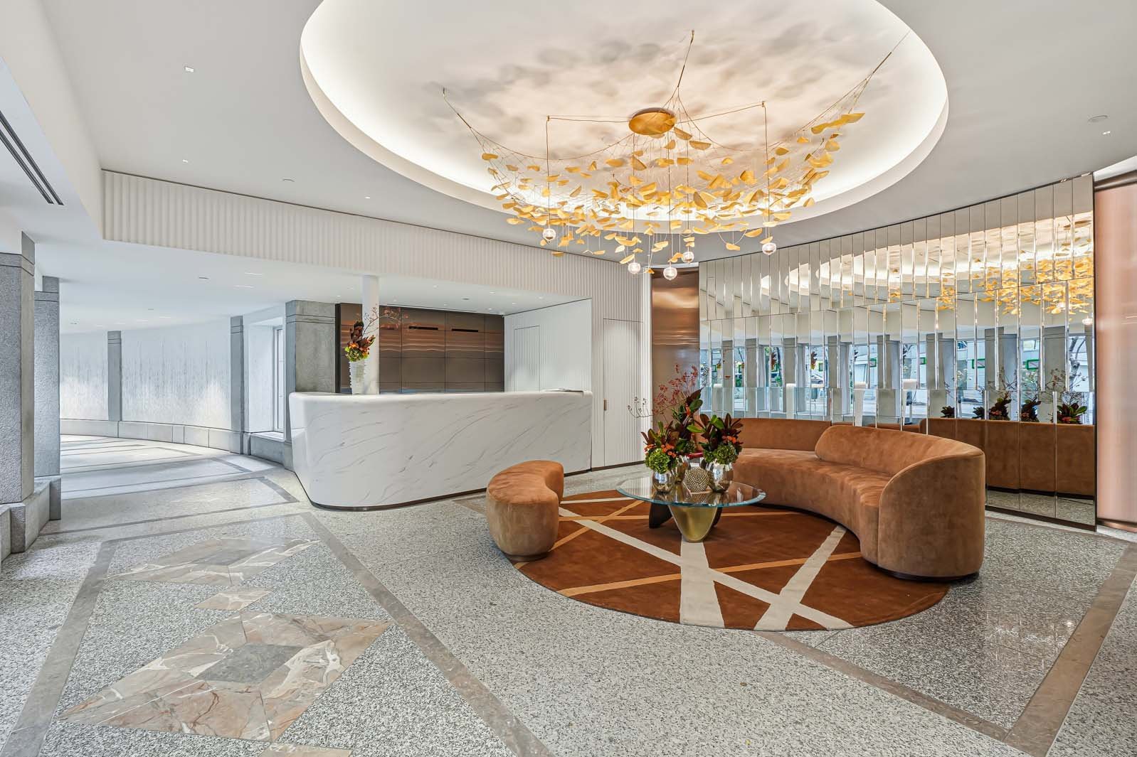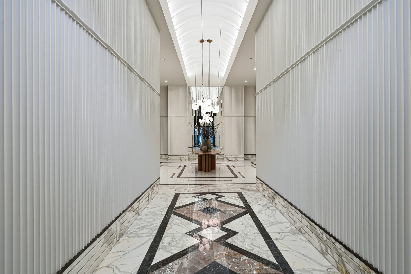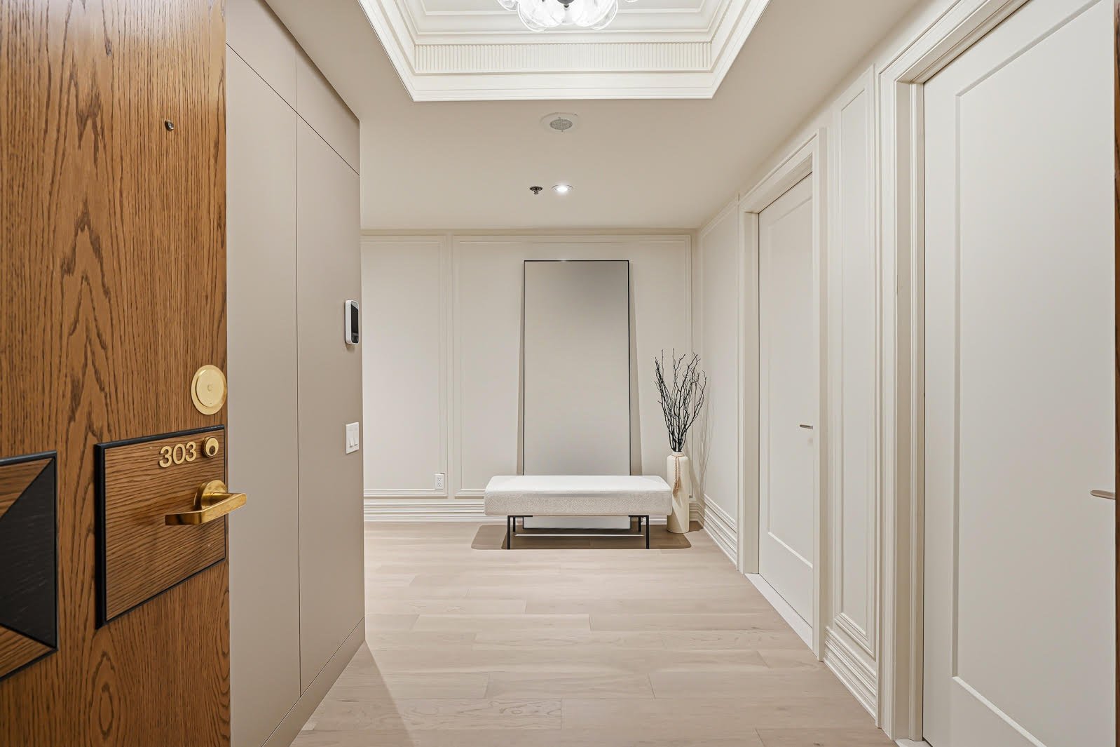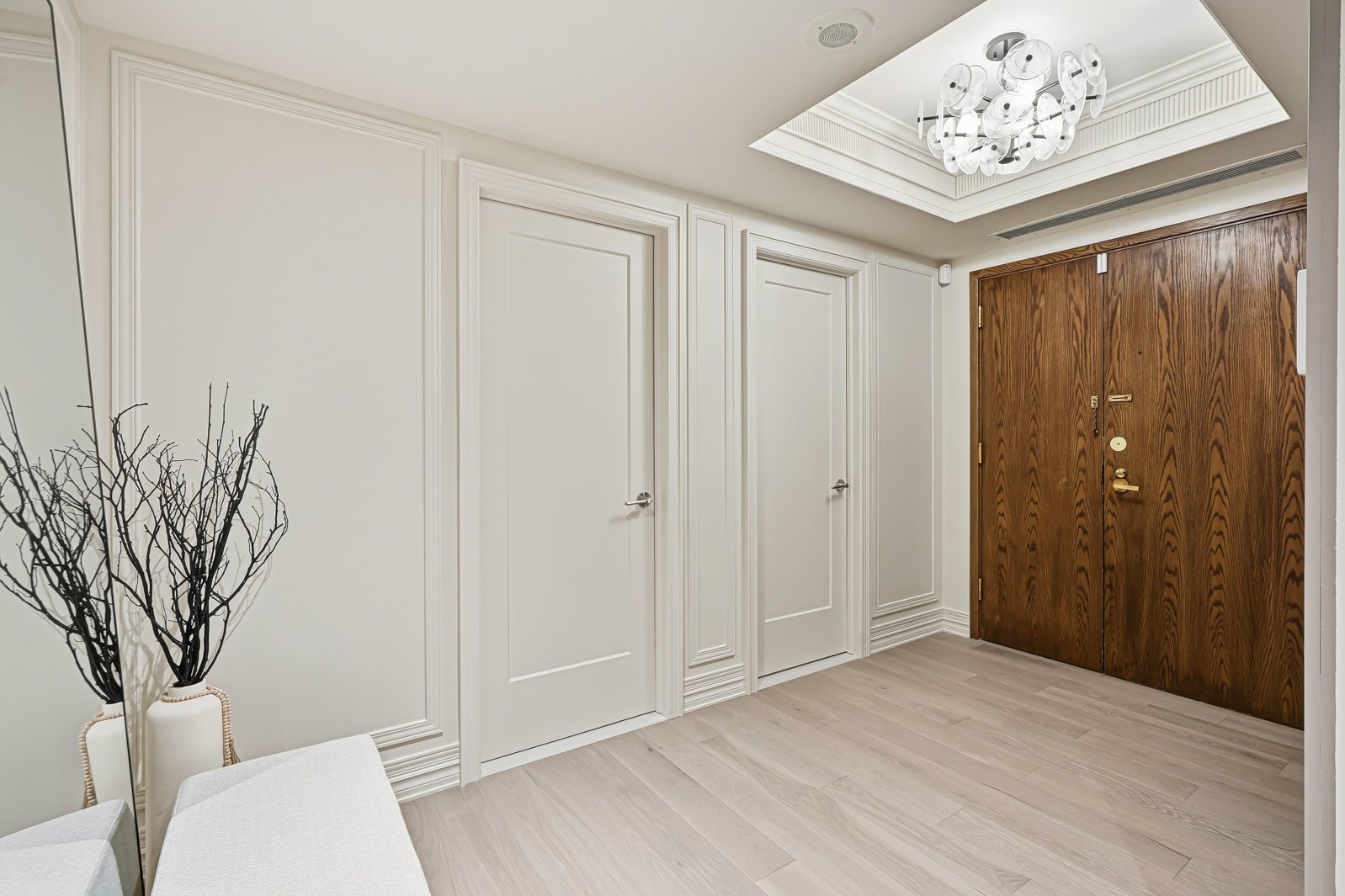 Turnkey perfection -- a stunningly renovated condo where even the windows and doors have been replaced! White oak floors set a chic, contemporary tone filled with natural light. Refined wall mouldings and subtle lighting add understated elegance. Open kitchen with breakfast island flows to the dining and living areas. Generous primary suite with large dressing area and ensuite featuring triple sinks, separate tub and shower. 2nd bedroom ideal for guests or a home office; layout ensures privacy. Striking new lobby by Scott Yetman. Exceptional services, security, and a highly sought-after address.