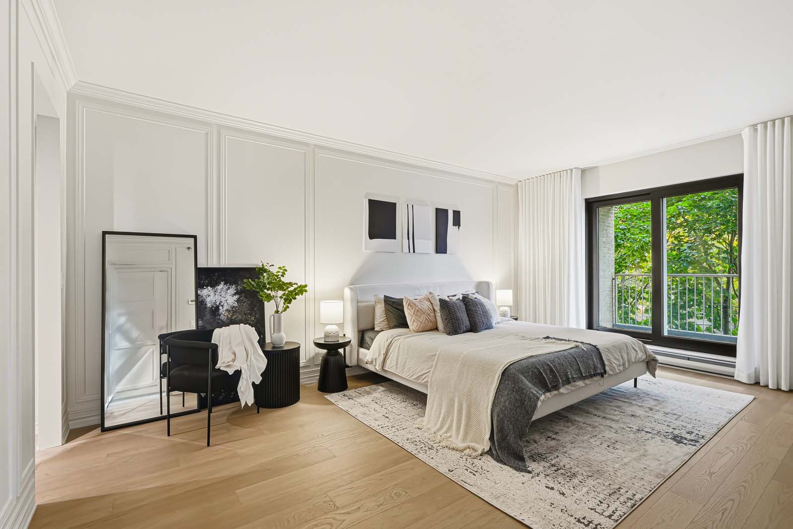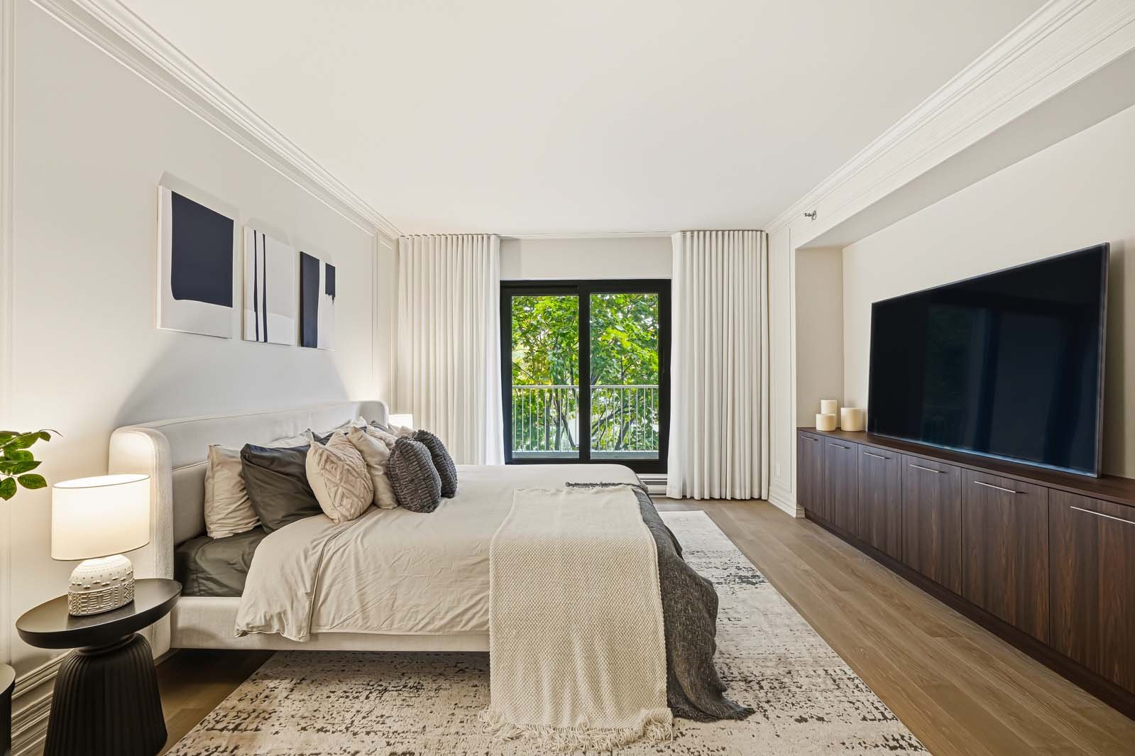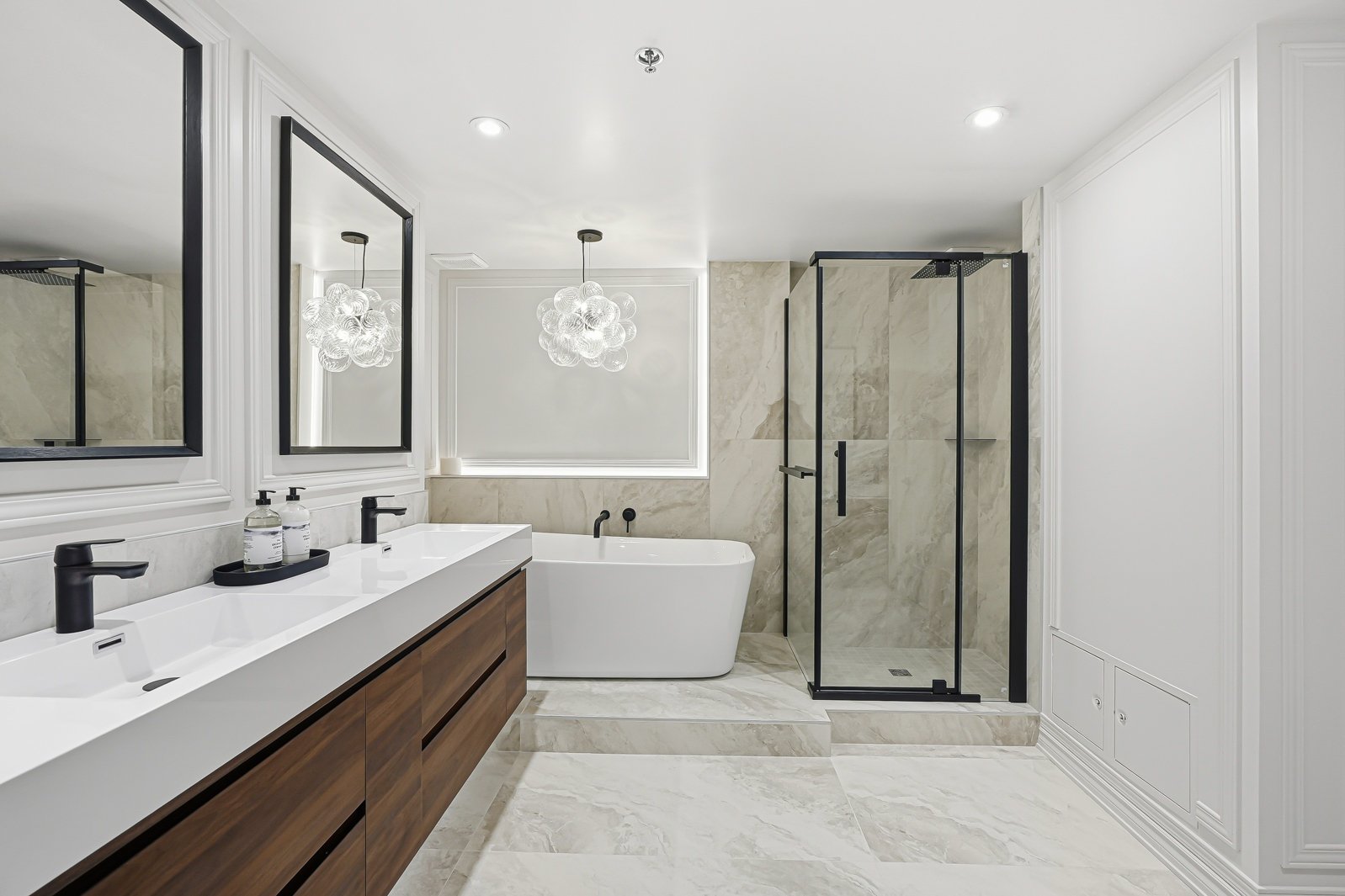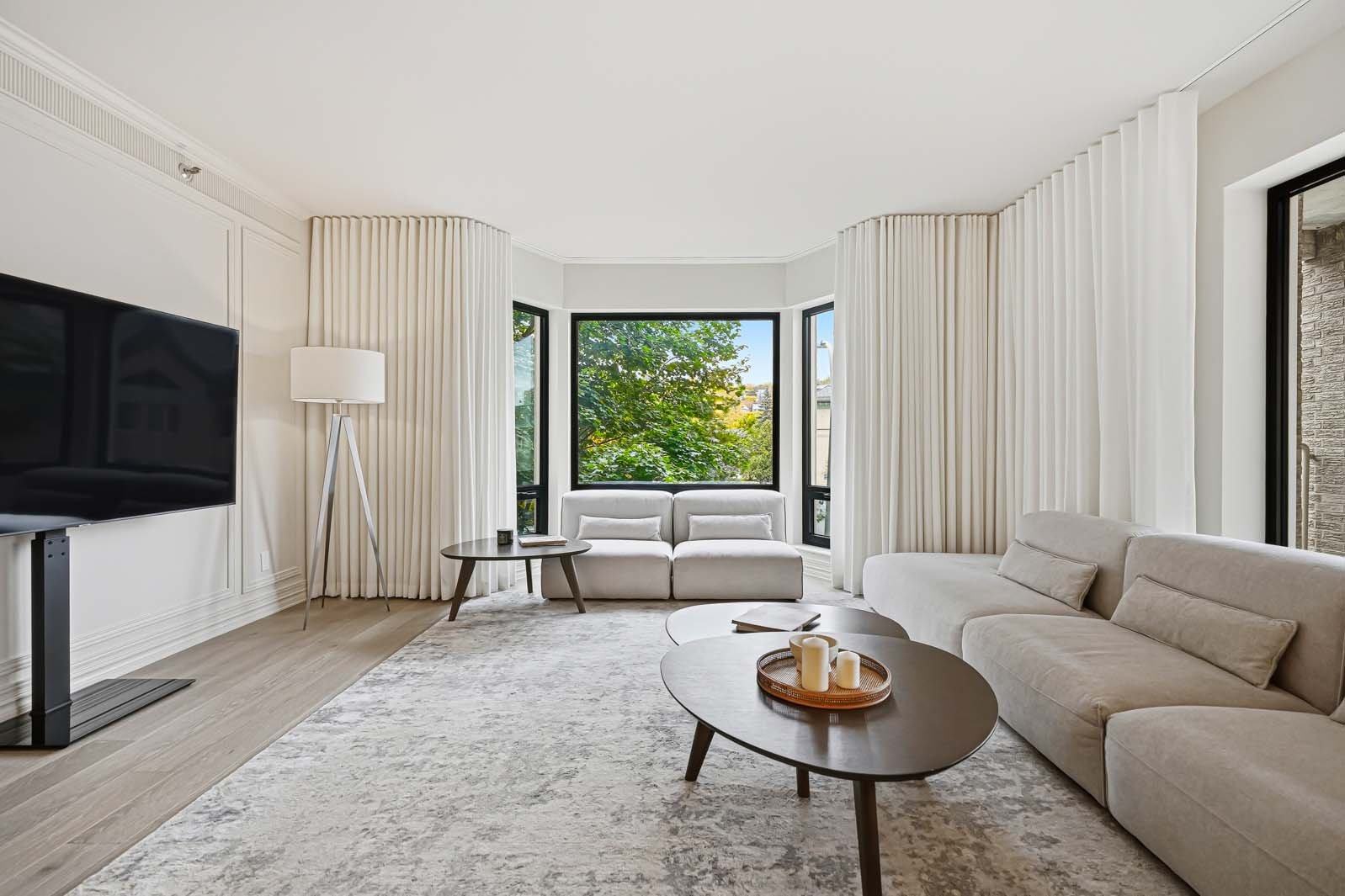 Turnkey perfection -- a stunningly renovated condo where even the windows and doors have been replaced! White oak floors set a chic, contemporary tone filled with natural light. Refined wall mouldings and subtle lighting add understated elegance. Open kitchen with breakfast island flows to the dining and living areas. Generous primary suite with large dressing area and ensuite featuring triple sinks, separate tub and shower. 2nd bedroom ideal for guests or a home office; layout ensures privacy. Striking new lobby by Scott Yetman. Exceptional services, security, and a highly sought-after address.