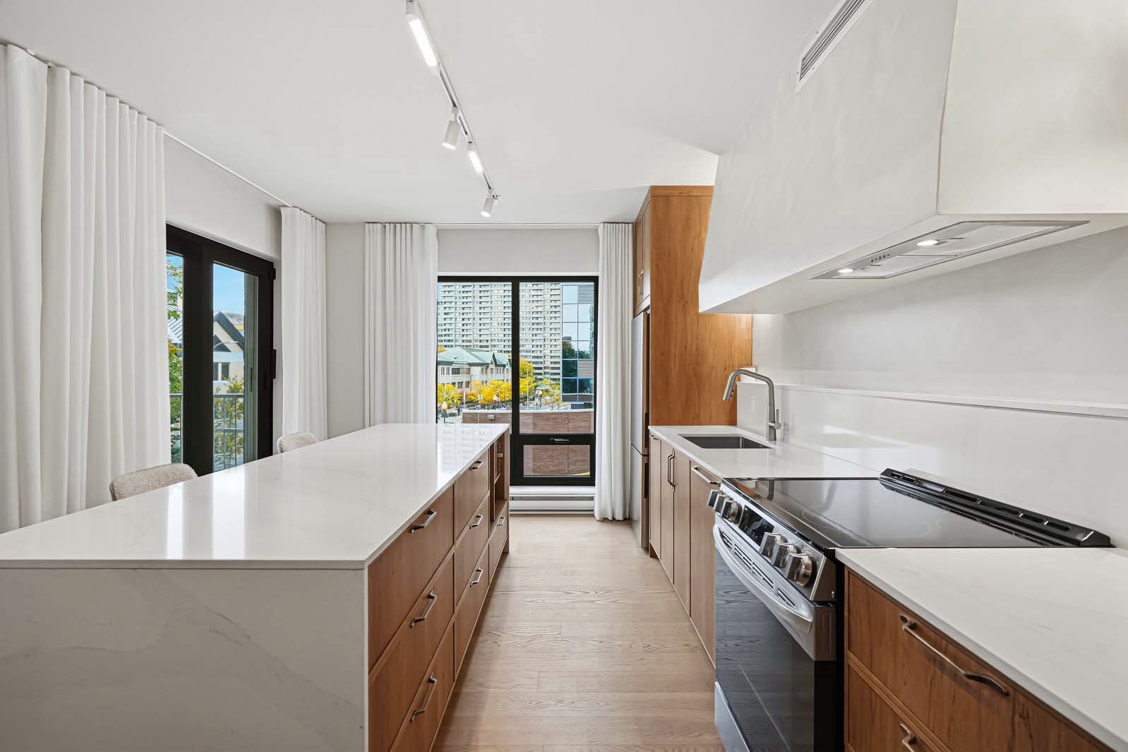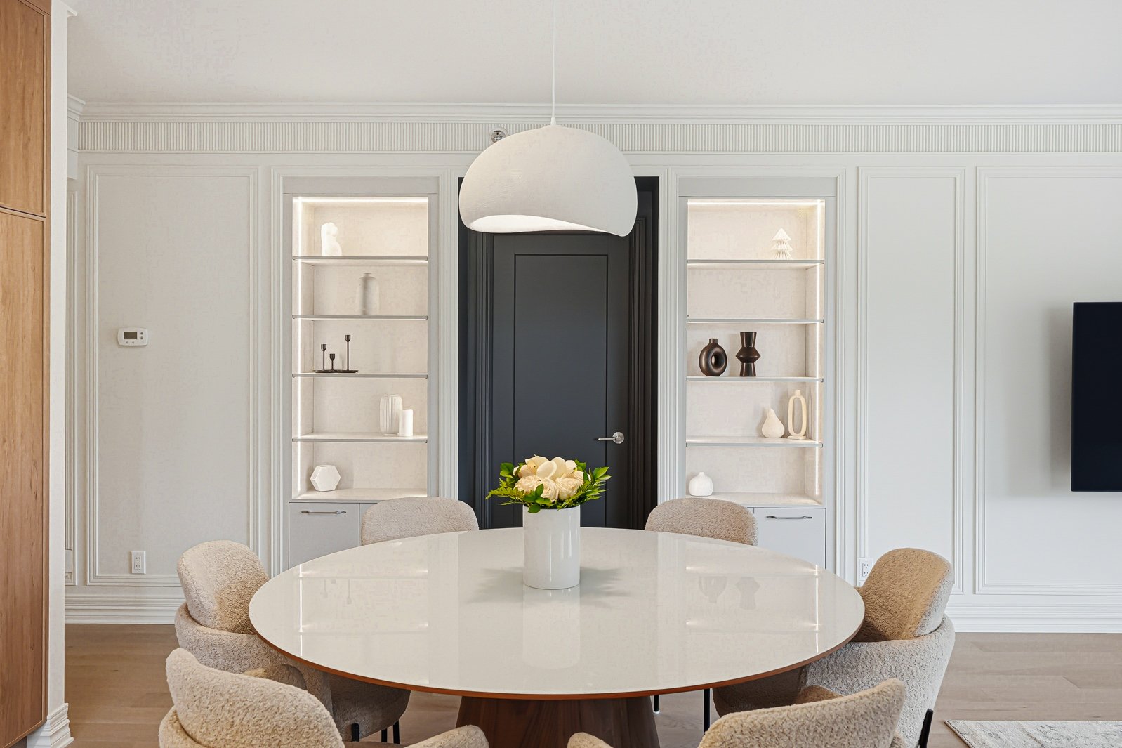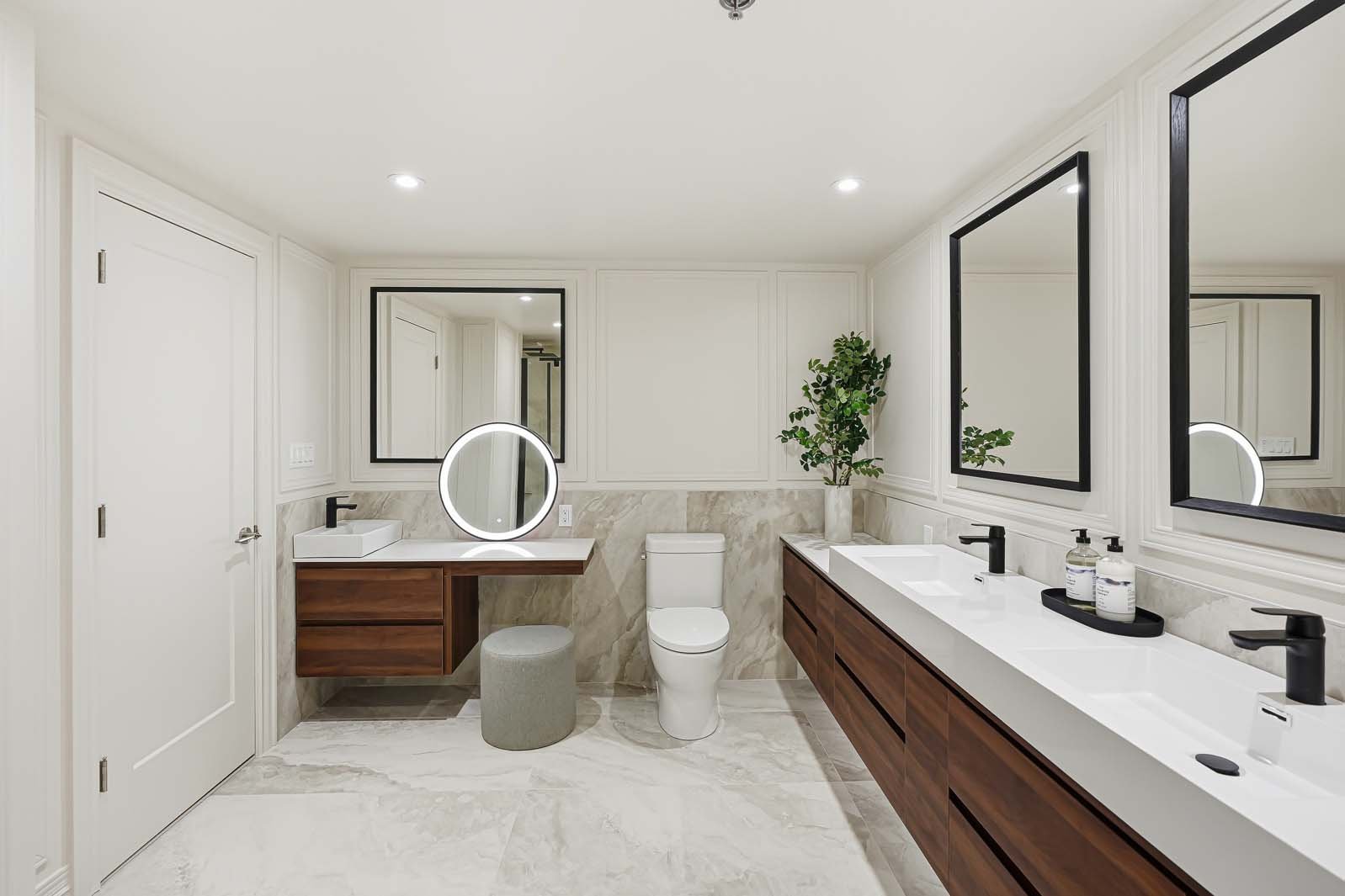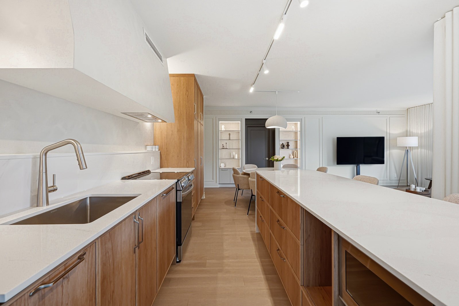 Turnkey perfection -- a stunningly renovated condo where even the windows and doors have been replaced! White oak floors set a chic, contemporary tone filled with natural light. Refined wall mouldings and subtle lighting add understated elegance. Open kitchen with breakfast island flows to the dining and living areas. Generous primary suite with large dressing area and ensuite featuring triple sinks, separate tub and shower. 2nd bedroom ideal for guests or a home office; layout ensures privacy. Striking new lobby by Scott Yetman. Exceptional services, security, and a highly sought-after address.