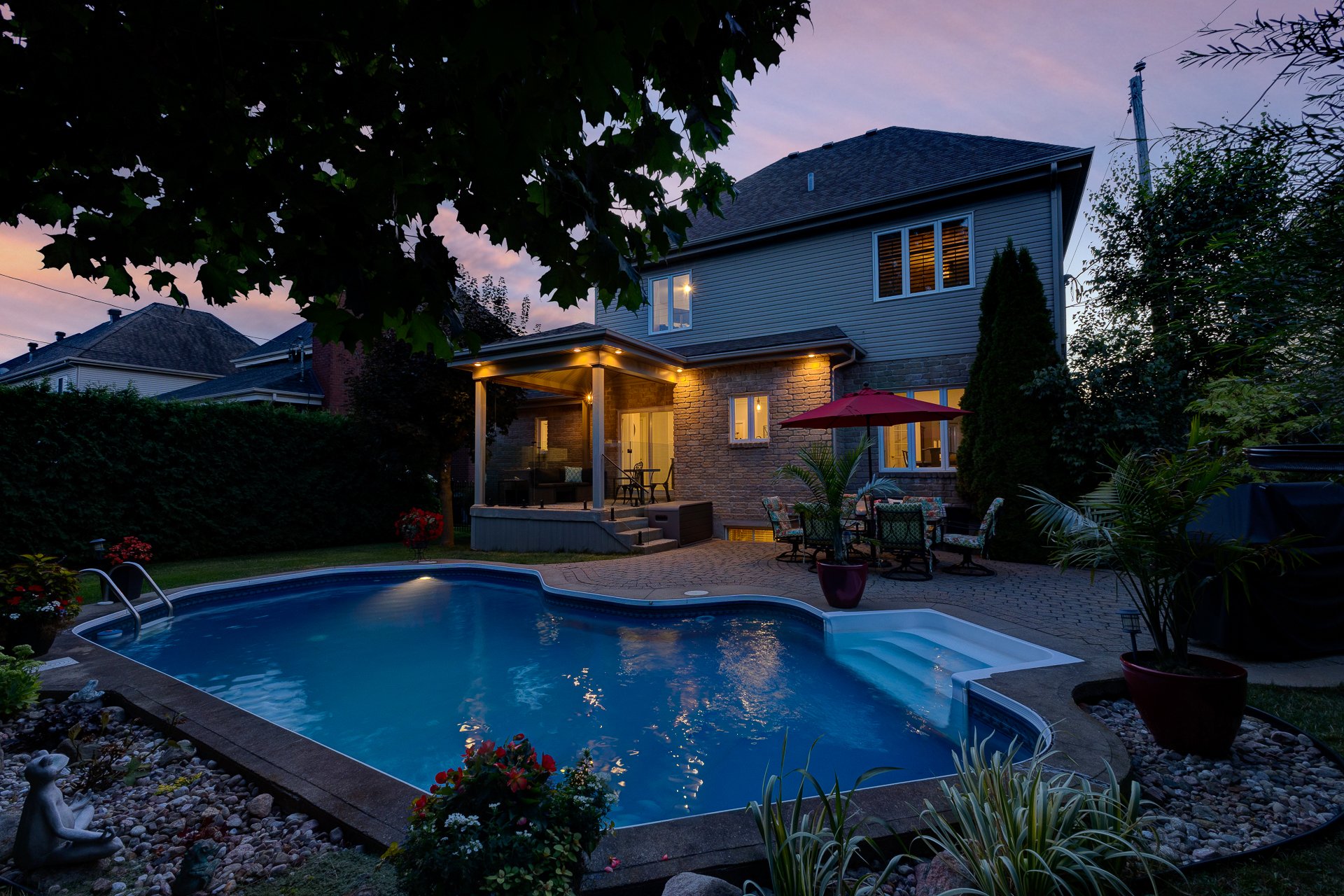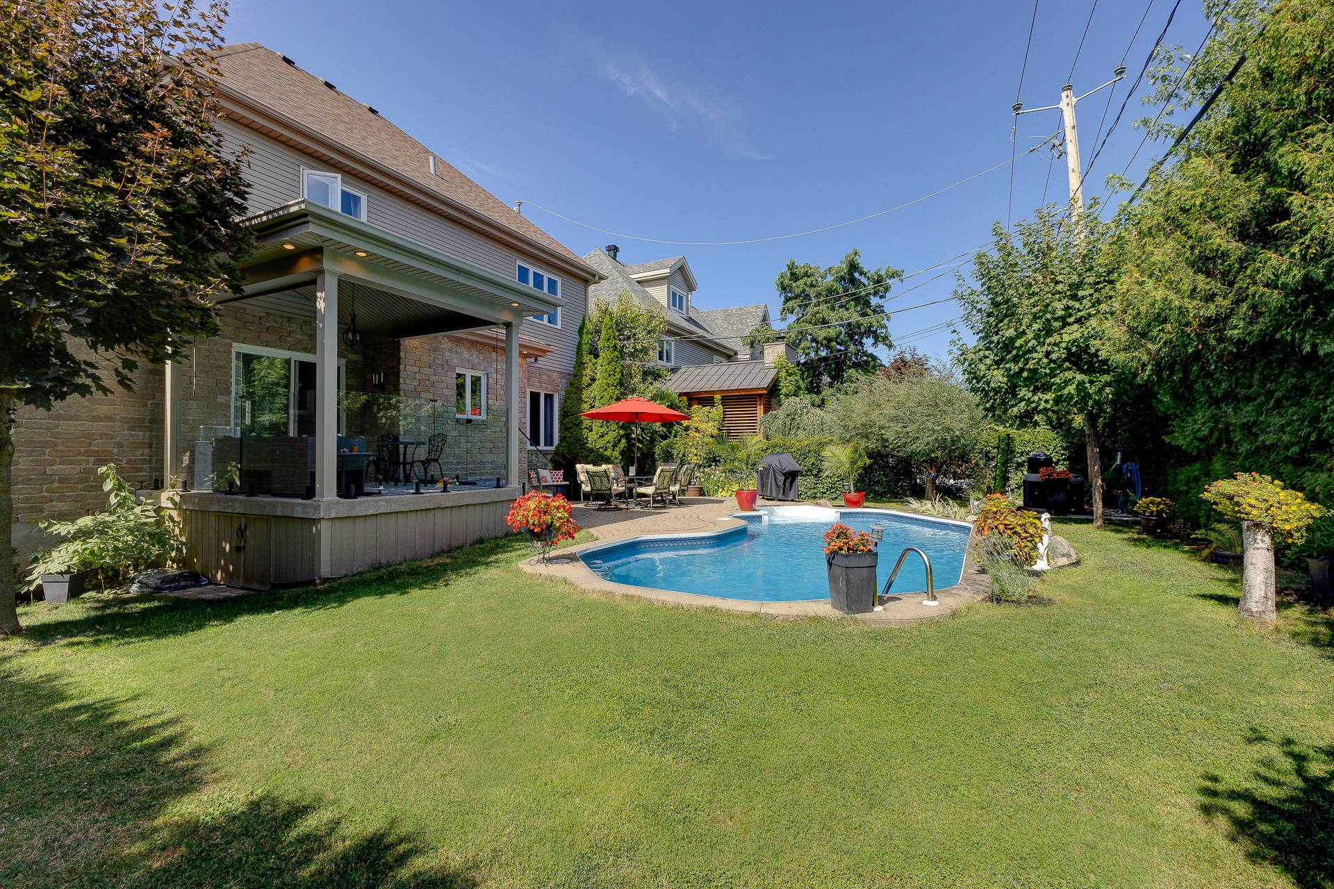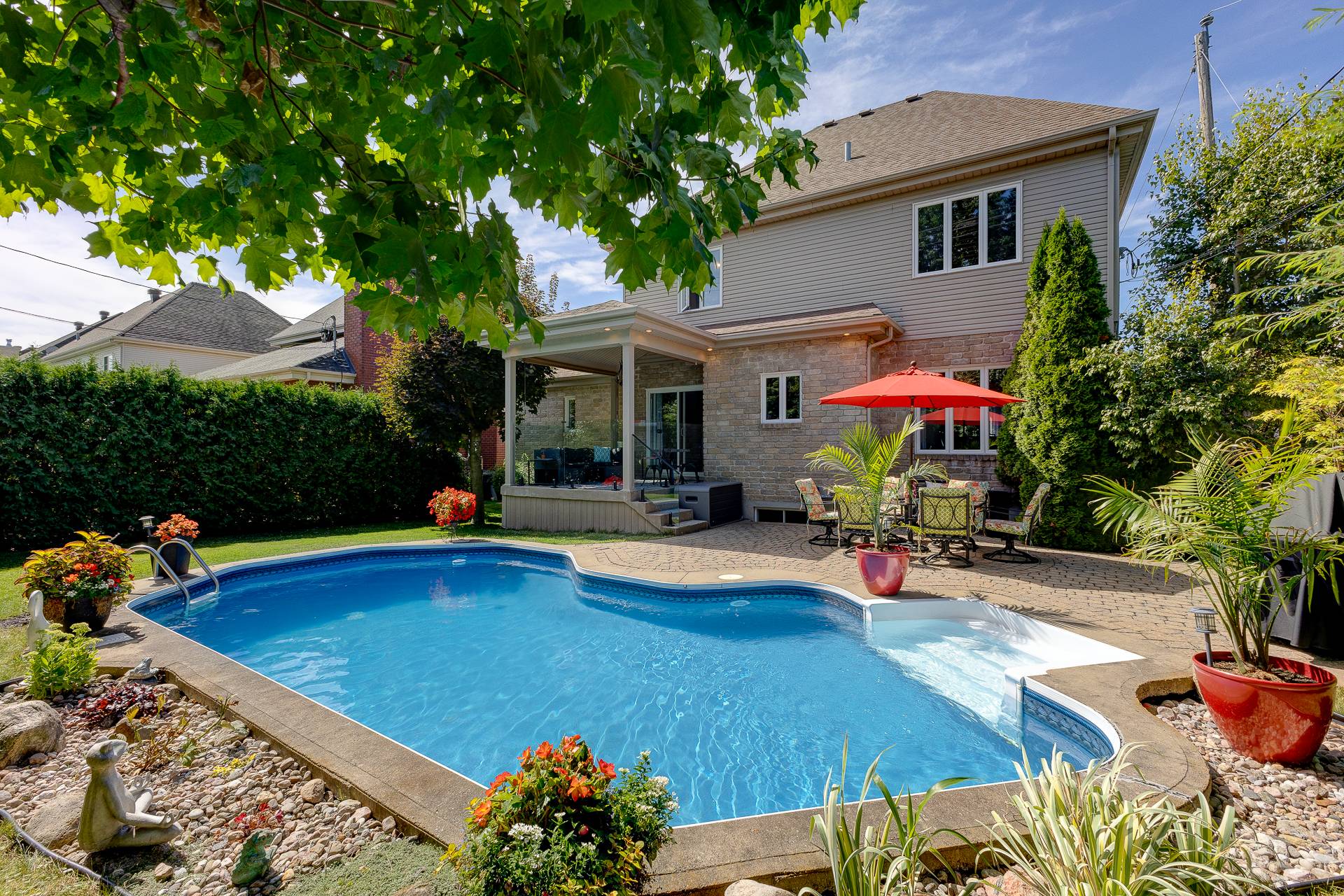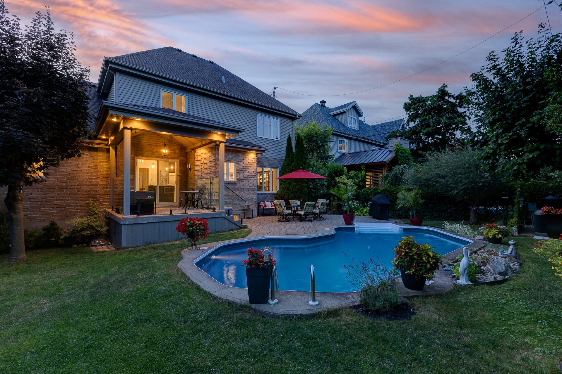 À l'extérieur, la cour arrière est un véritable atout. Avec sa terrasse couverte, son pavé uni, sa piscine creusée avec équipements récents et son aménagement paysager soigné, elle invite à la détente et aux rassemblements en toute convivialité.