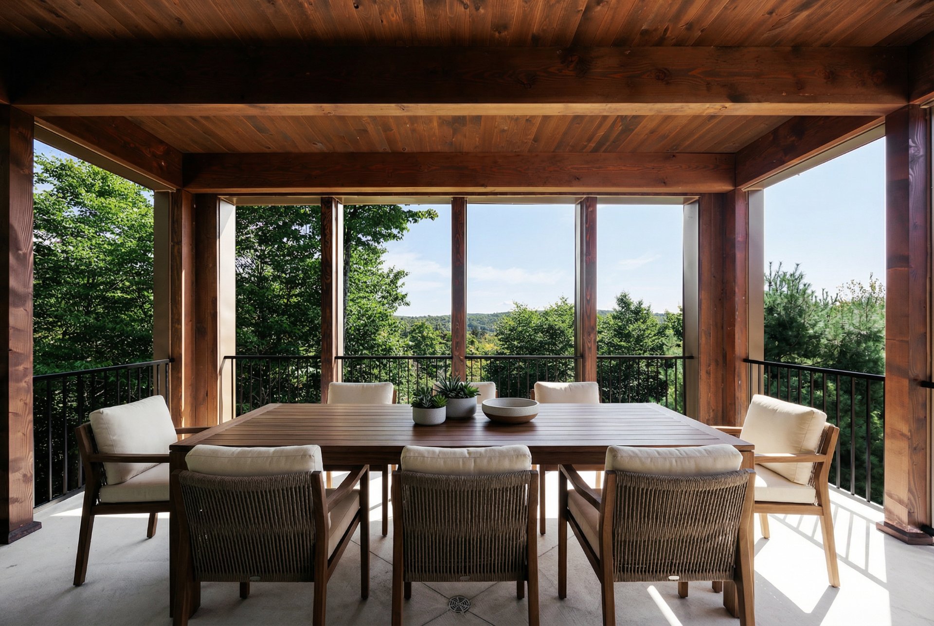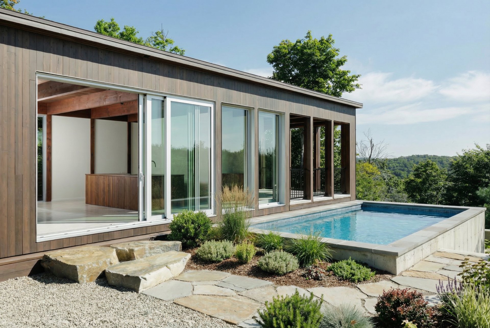 Le séjour, vaste et entièrement ouvert, est bordé de grandes portes coulissantes qui, une fois ouvertes, prolongent l'espace de vie vers l'extérieur et donnent l'impression de vivre en pleine nature. Volumes maîtrisés, matériaux nobles et lignes épurées composent un espace à la fois puissant, apaisant et résolument intemporel.