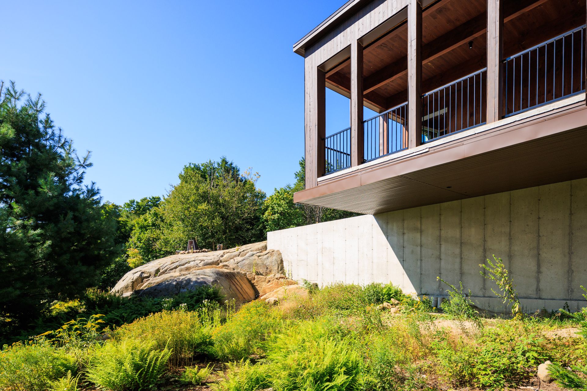 Perchée sur un cap rocheux à flanc de montagne, la propriété s'intègre harmonieusement à son environnement et offre des vues dégagées sur la forêt et les reliefs environnants. Sa position privilégiée permet de capter une lumière naturelle changeante tout au long de la journée, amplifiant l'expérience des lieux.