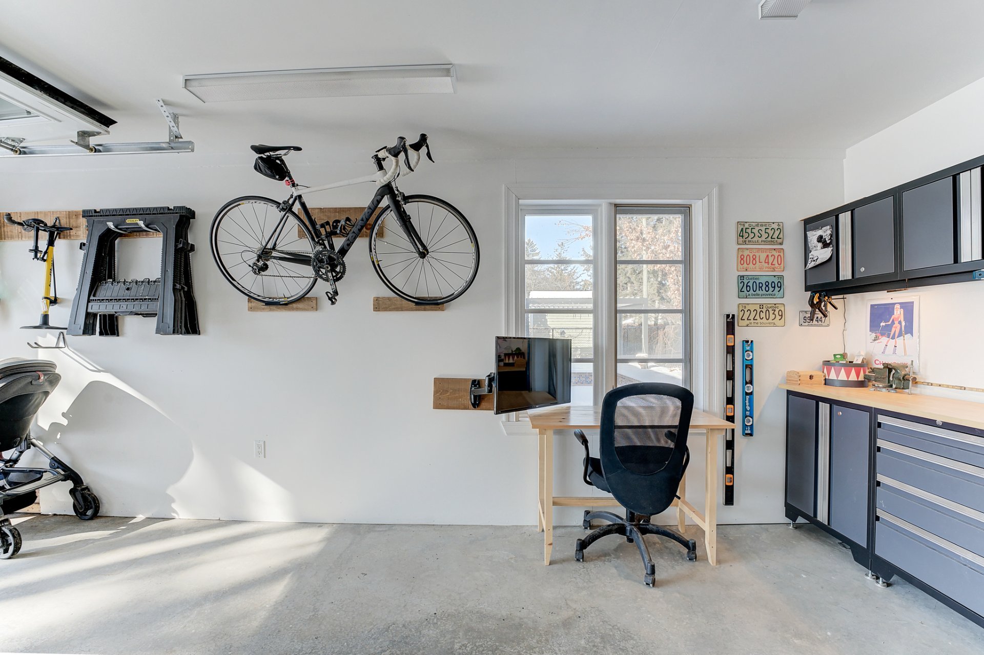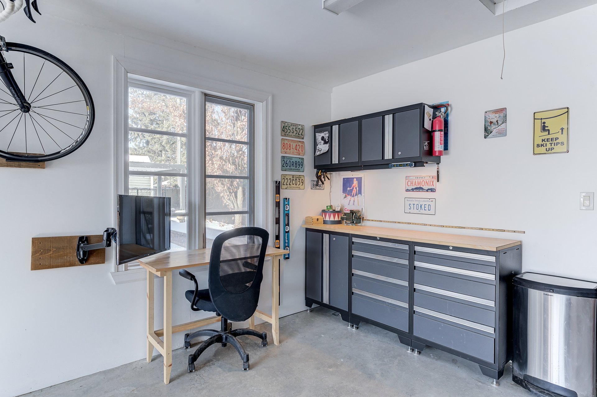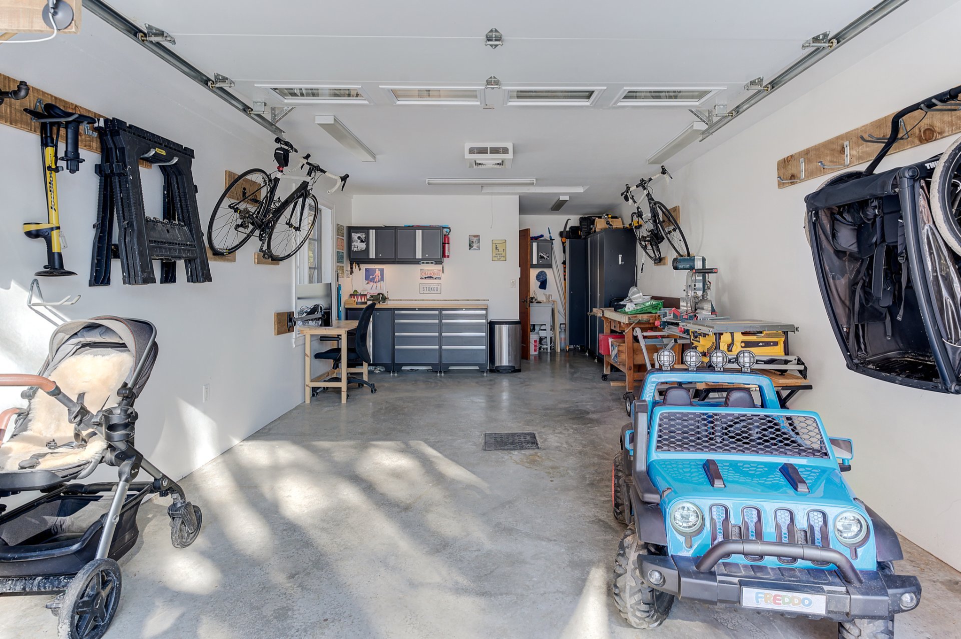 Le garage dispose d'un espace de rangement supplémentaire au grenier, et une salle d'eau accessible depuis la piscine complète les commodités de la propriété.