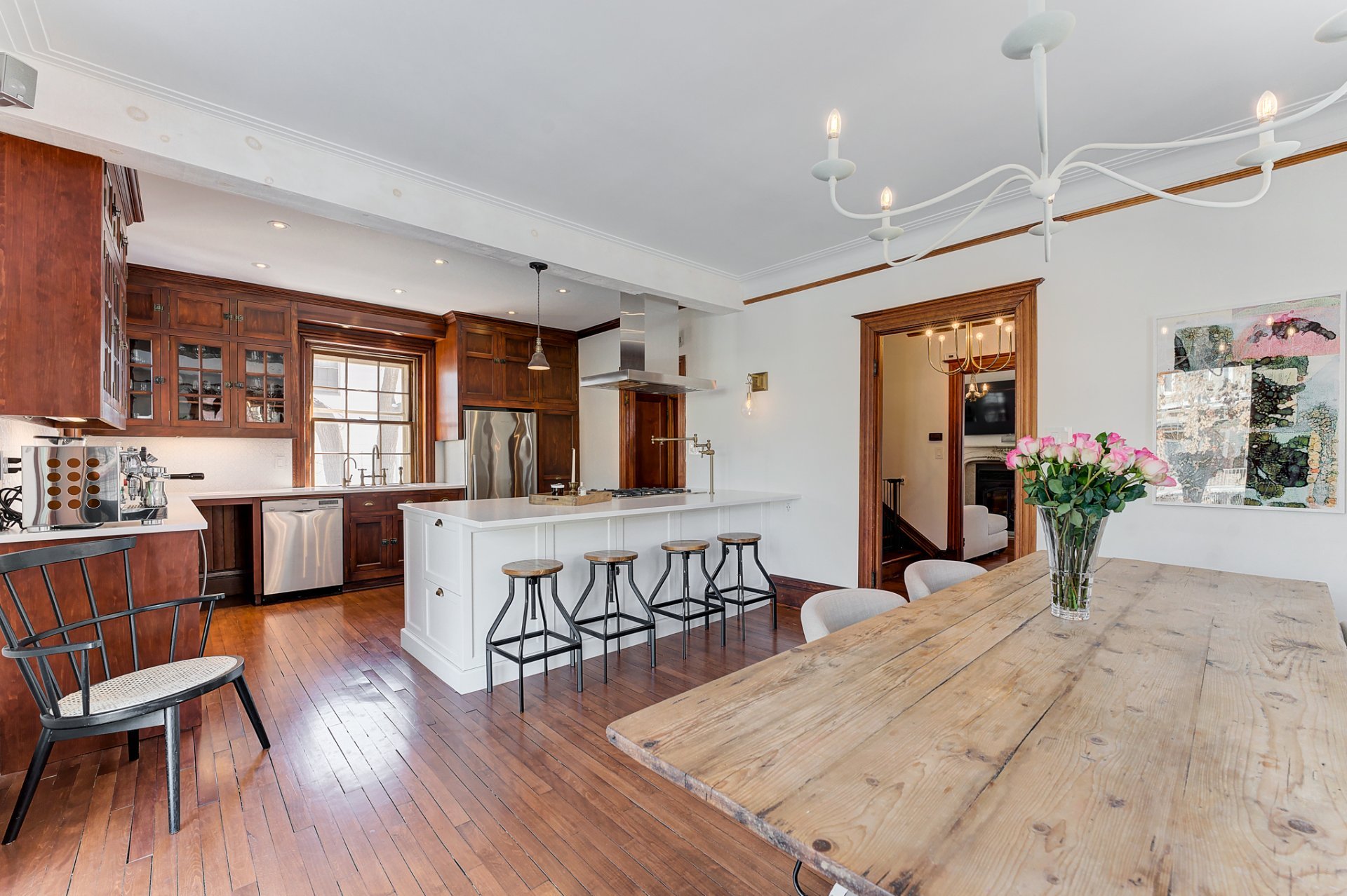 La cuisine, équipée d'un four au gaz, de comptoirs en granite et d'armoires vitrées d'époque, conjuguent à merveille le charme traditionnel et le confort moderne