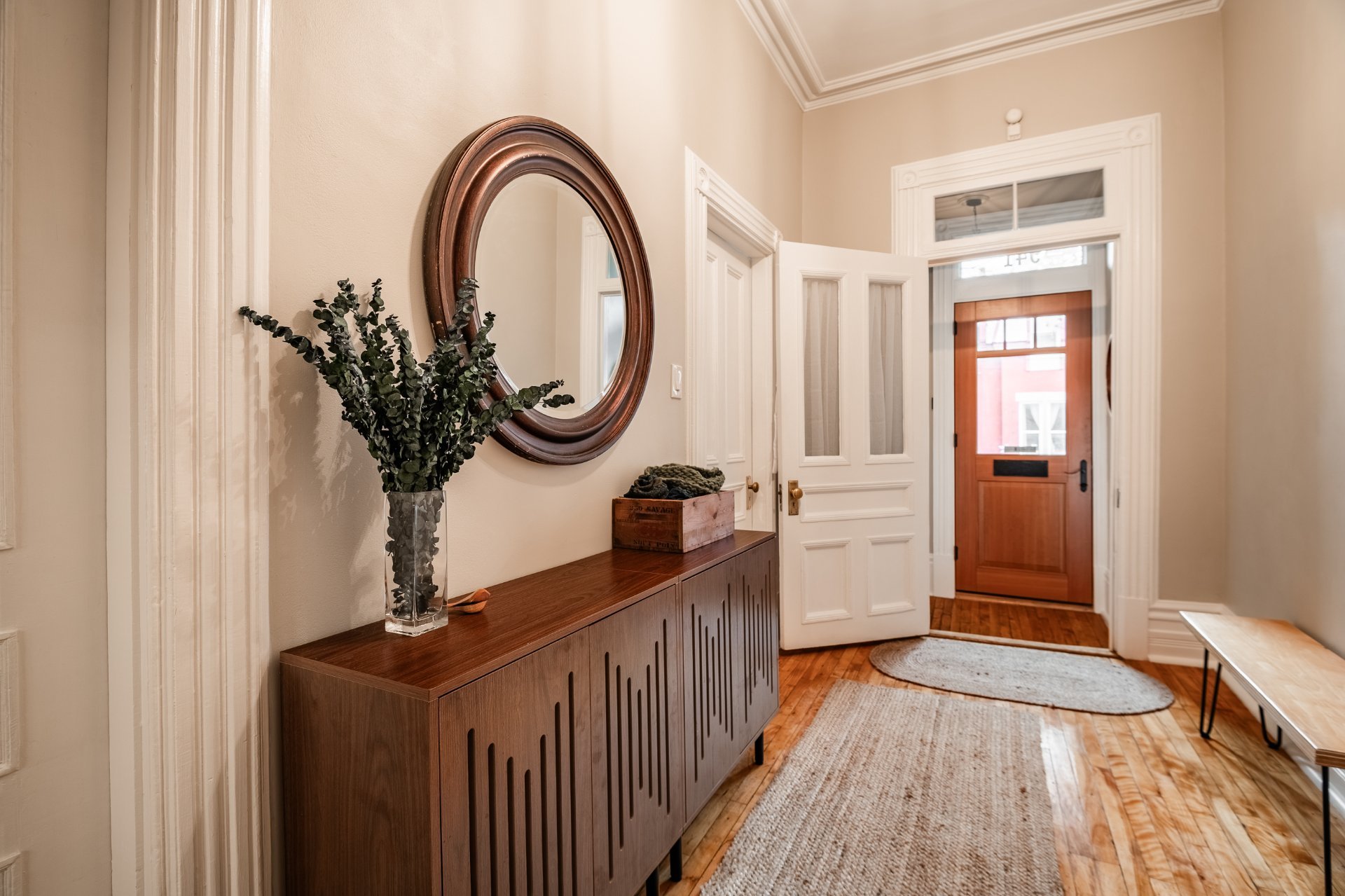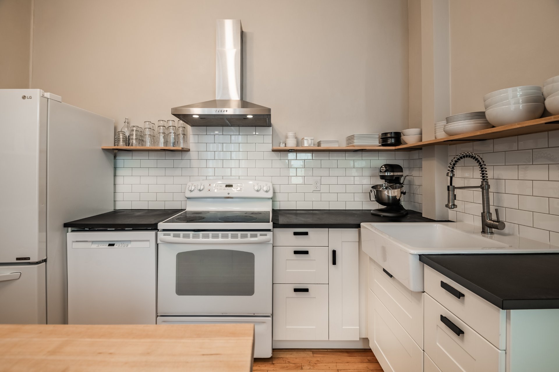 - Laveuse et sécheuse, étendoir, cuisinière, réfrigérateur, lave-vaisselle et congélateur, étagères murales et rangement, miroir dans le vestibule, rideaux et tringles
