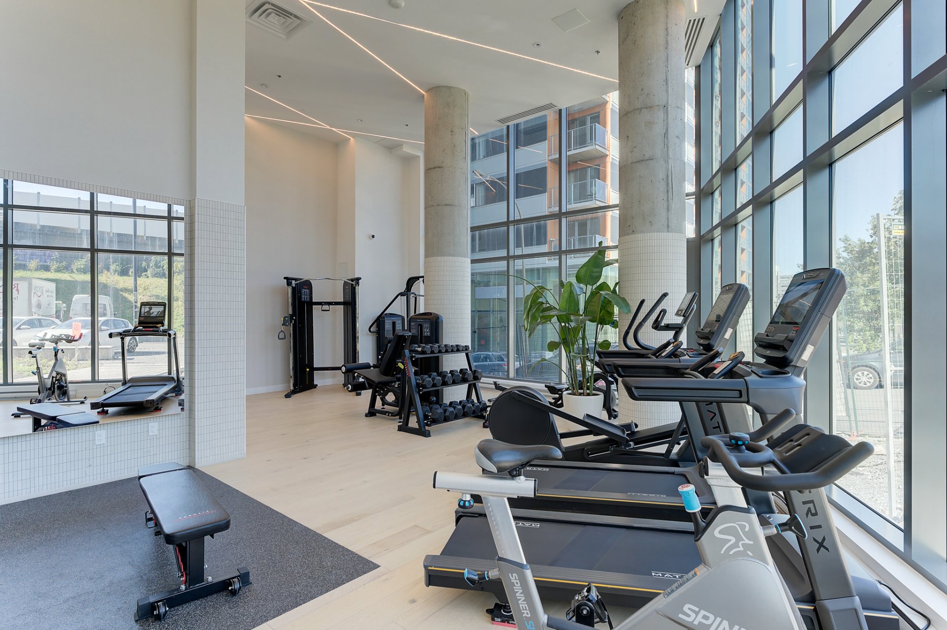 * Une salle de sport moderne, entourée de verre et équipée des dernières machines d'exercice et de poids libres.