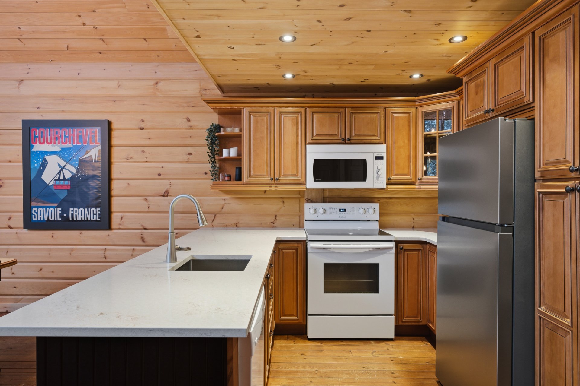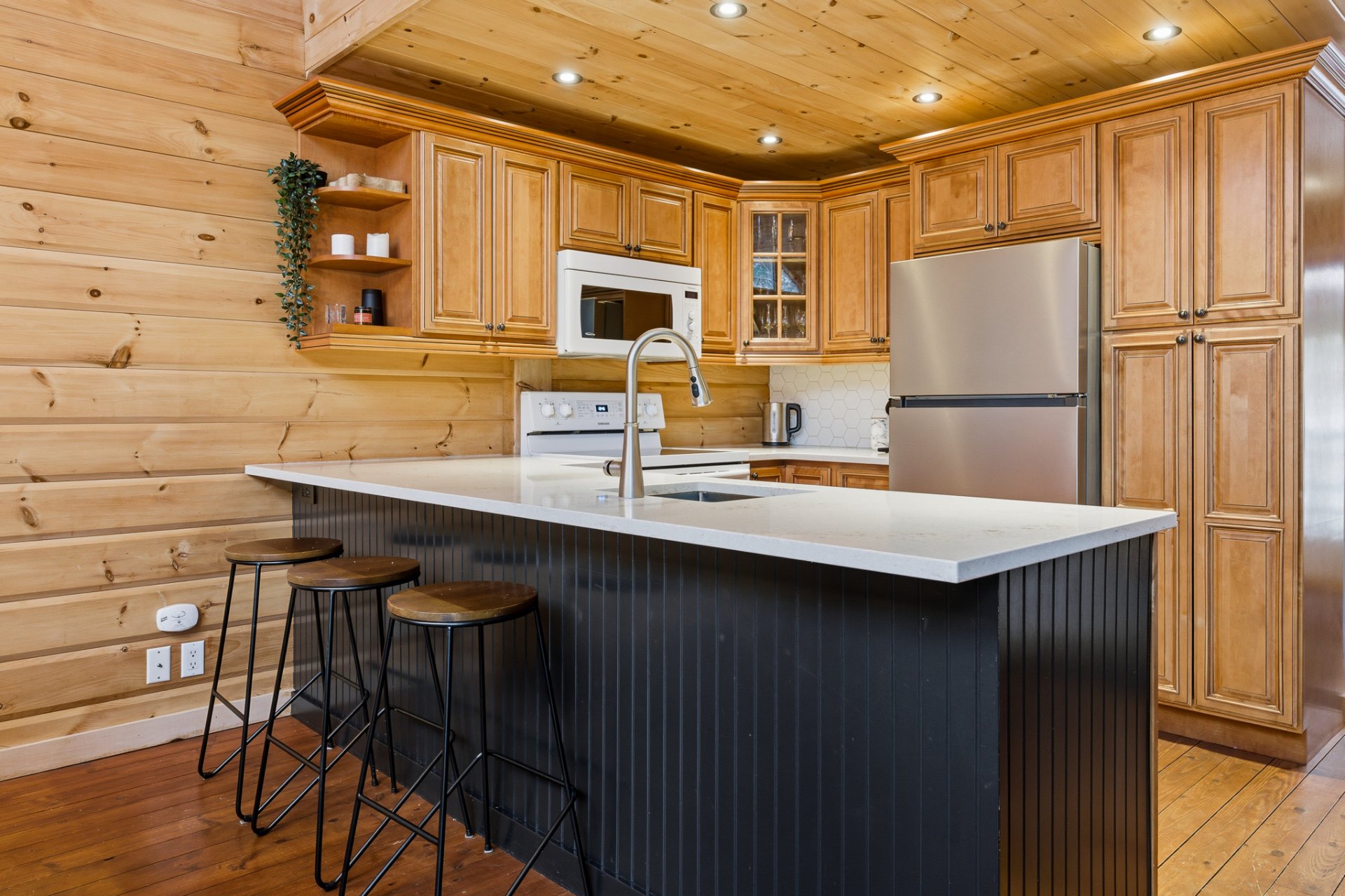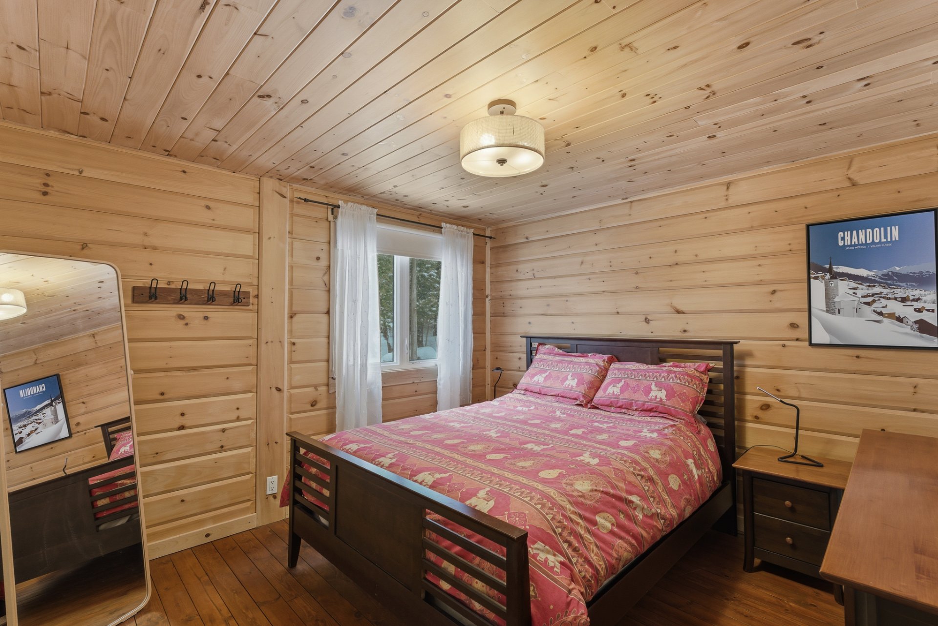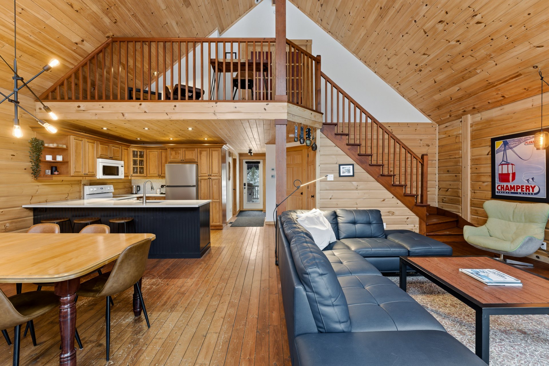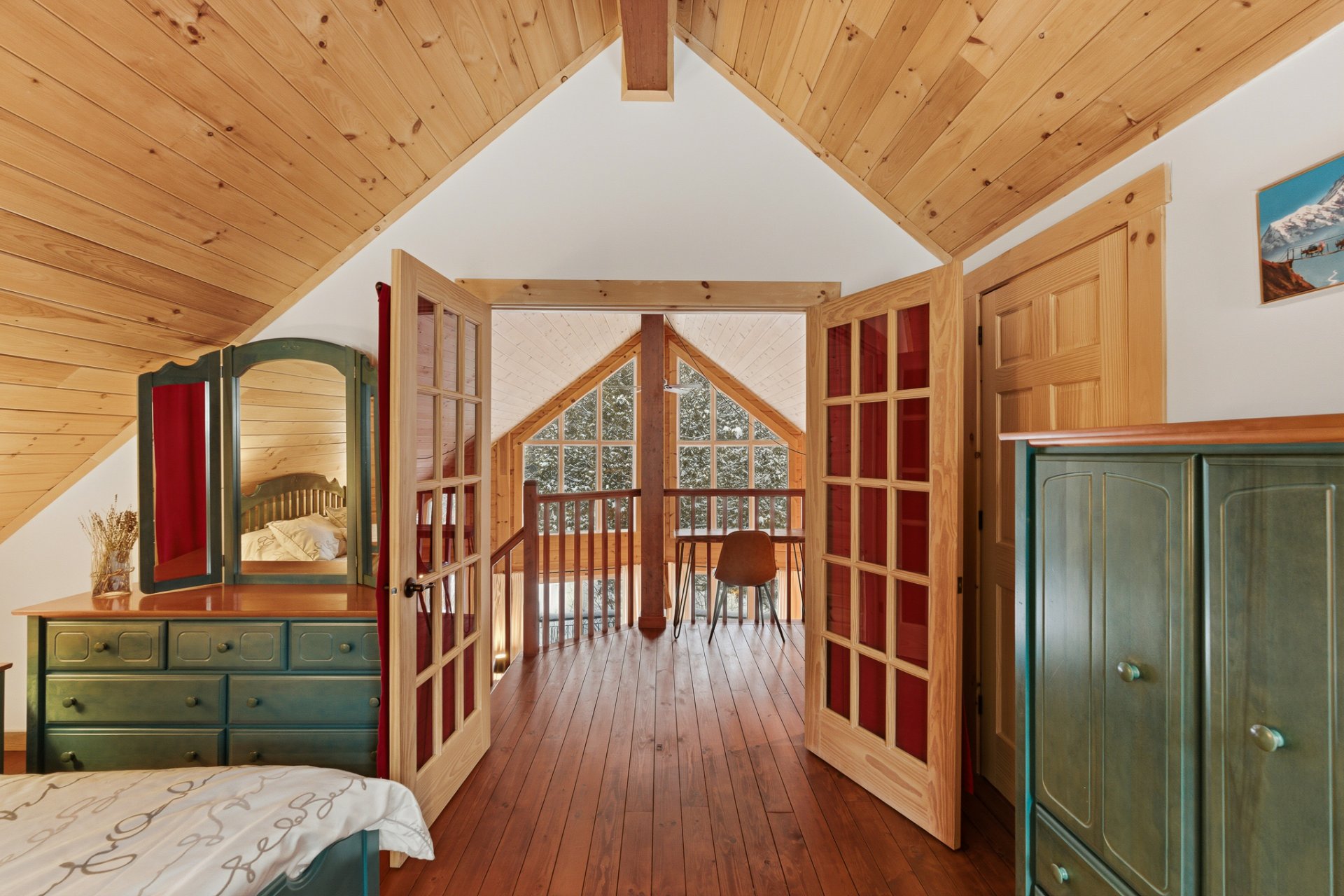 L'intérieur se distingue par une ambiance chaleureuse et apaisante, portée par la lumière naturelle, le plafond cathédrale et une aire de vie conviviale où se rencontrent cuisine, salle à manger et salon. Le poêle au bois ajoute une touche de chaleur et de confort, idéal pour les retours de ski ou les soirées tranquilles après une journée à l'extérieur. L'entrée de type "mudroom" avec plancher chauffant a été pensée pour la vie active, facilitant le quotidien en toute saison. Une chambre et une salle de bain complète complètent le rez-de-chaussée.