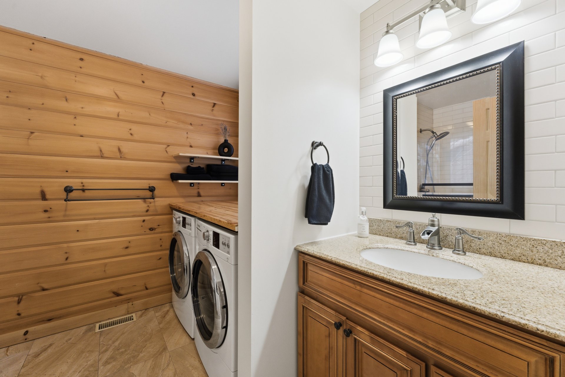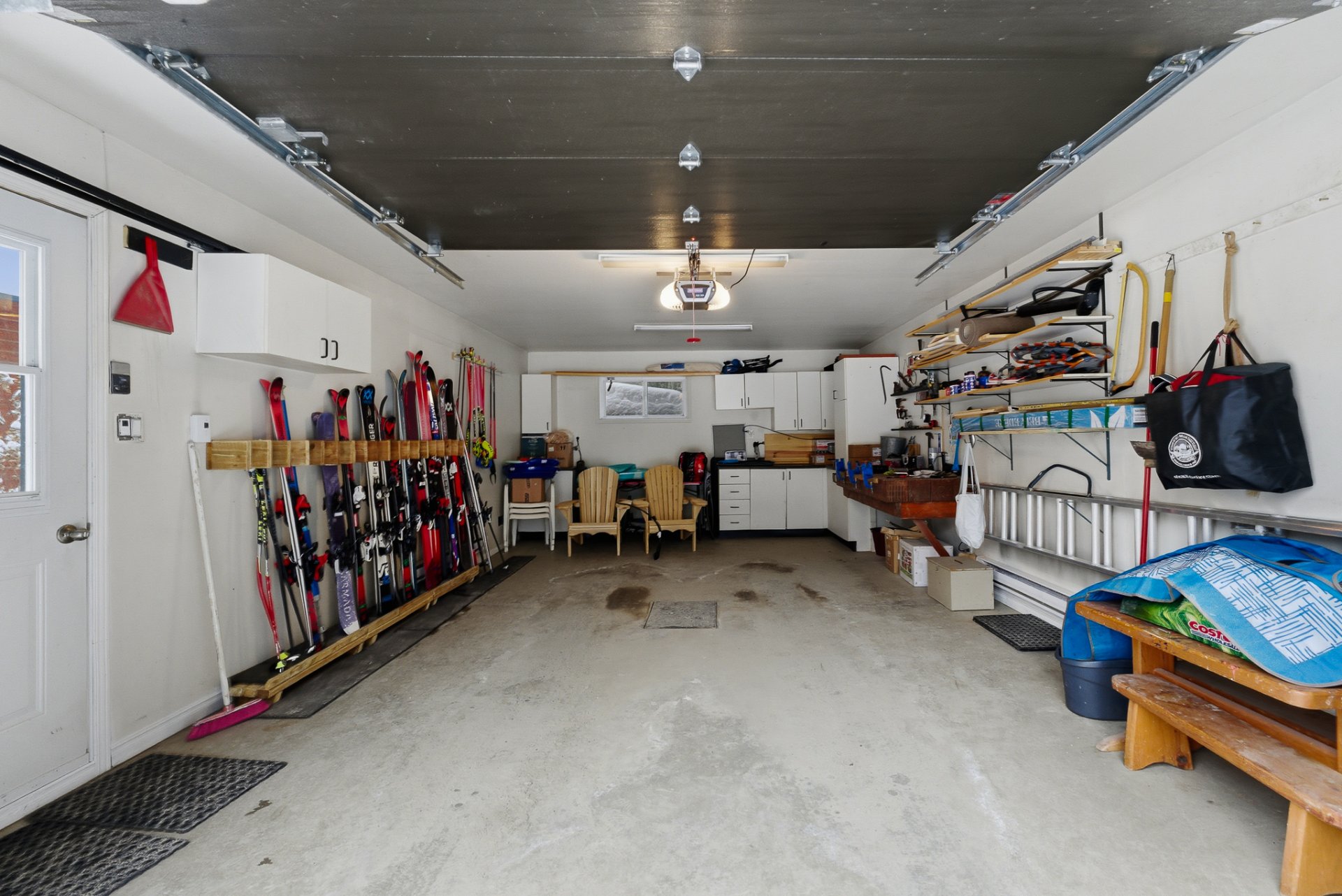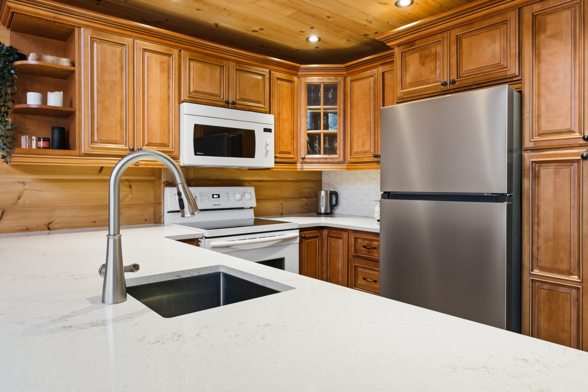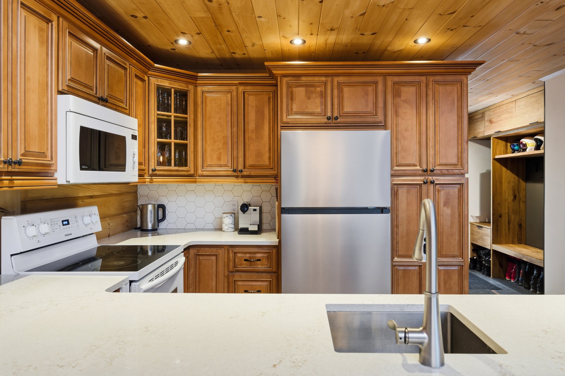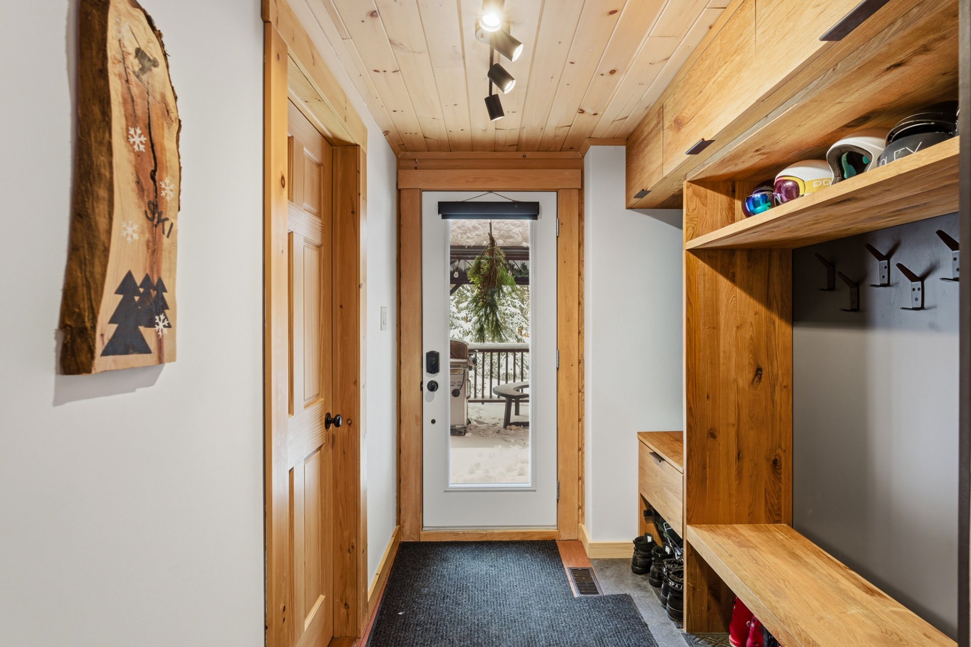 L'intérieur se distingue par une ambiance chaleureuse et apaisante, portée par la lumière naturelle, le plafond cathédrale et une aire de vie conviviale où se rencontrent cuisine, salle à manger et salon. Le poêle au bois ajoute une touche de chaleur et de confort, idéal pour les retours de ski ou les soirées tranquilles après une journée à l'extérieur. L'entrée de type "mudroom" avec plancher chauffant a été pensée pour la vie active, facilitant le quotidien en toute saison. Une chambre et une salle de bain complète complètent le rez-de-chaussée.