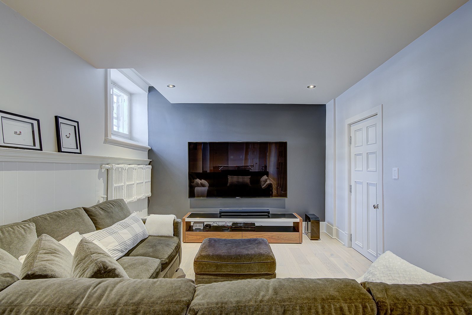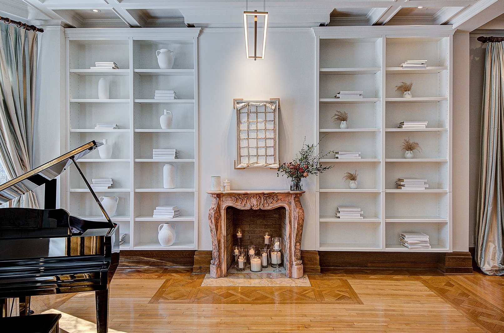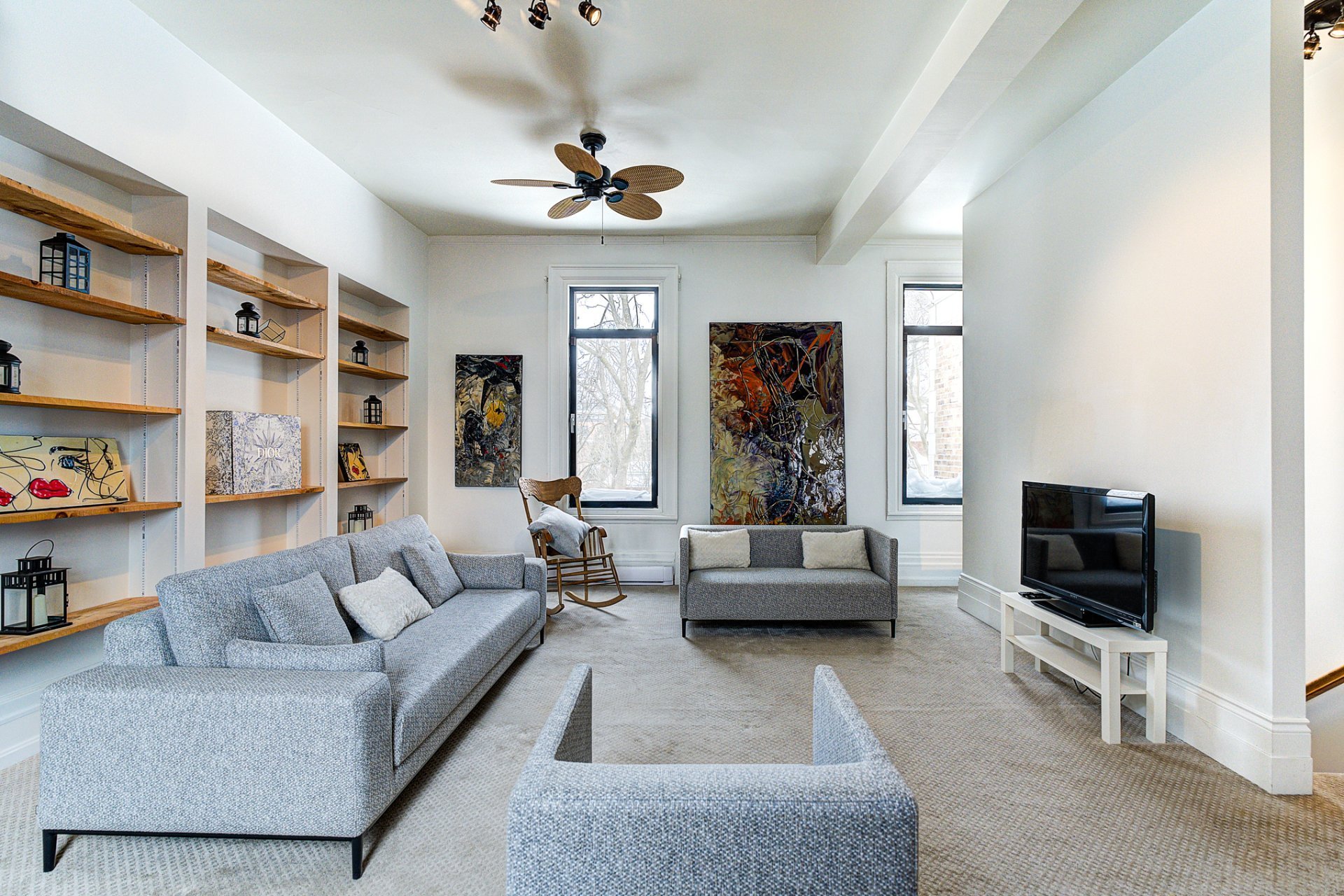 + Salon de plus de 50' avec foyer au gaz, ébénisterie, armoires sur mesure, caissons et vue sur le Parc Outremont