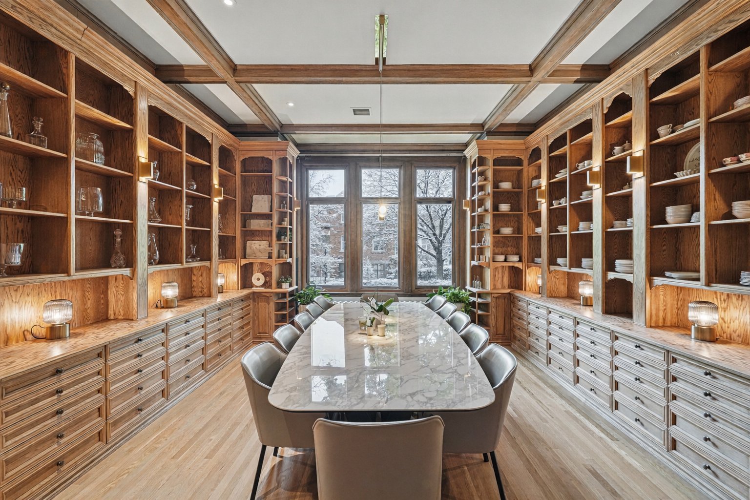 + Immense salle à manger avec ébénisterie sur mesure pleine hauteur et foyer au gaz