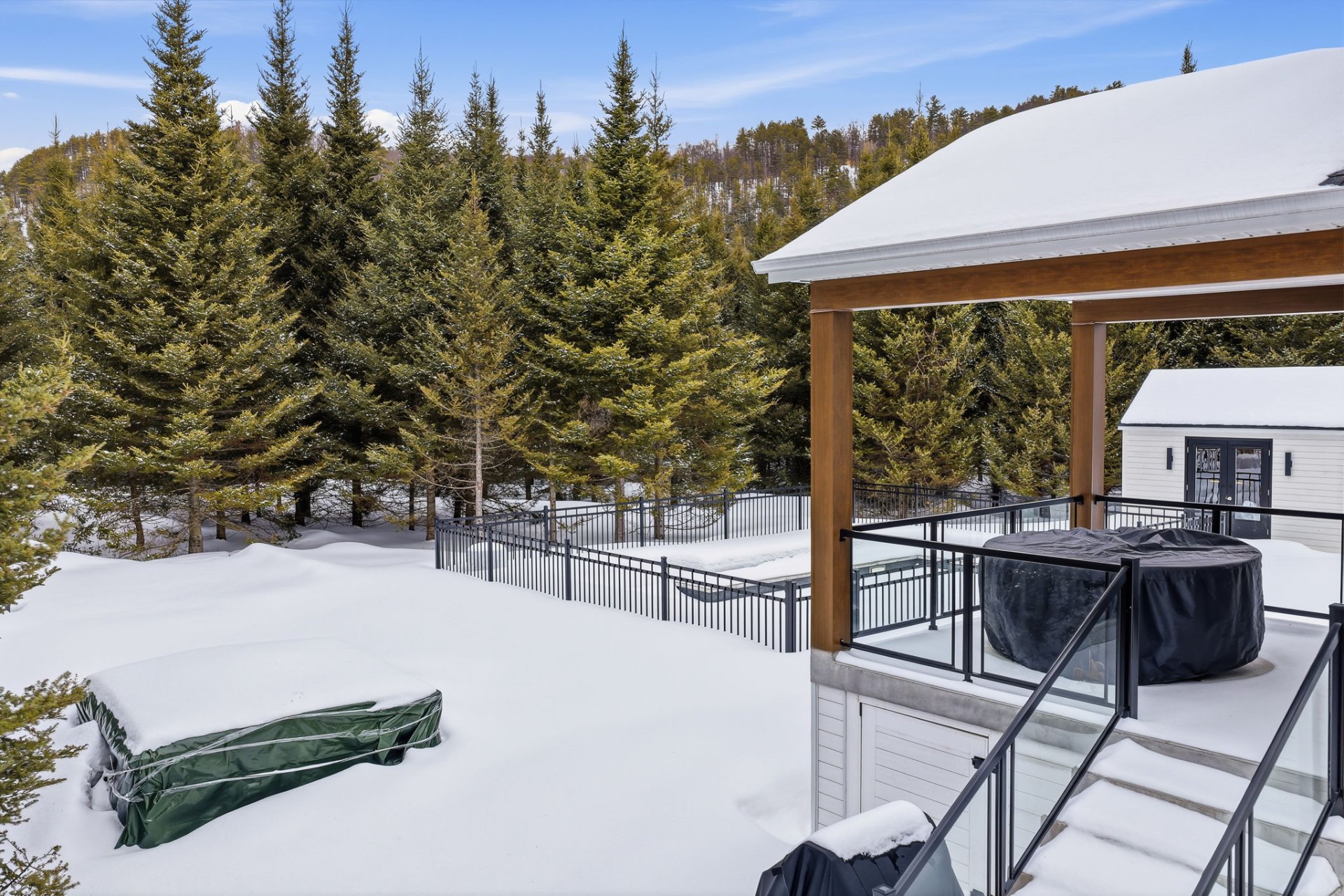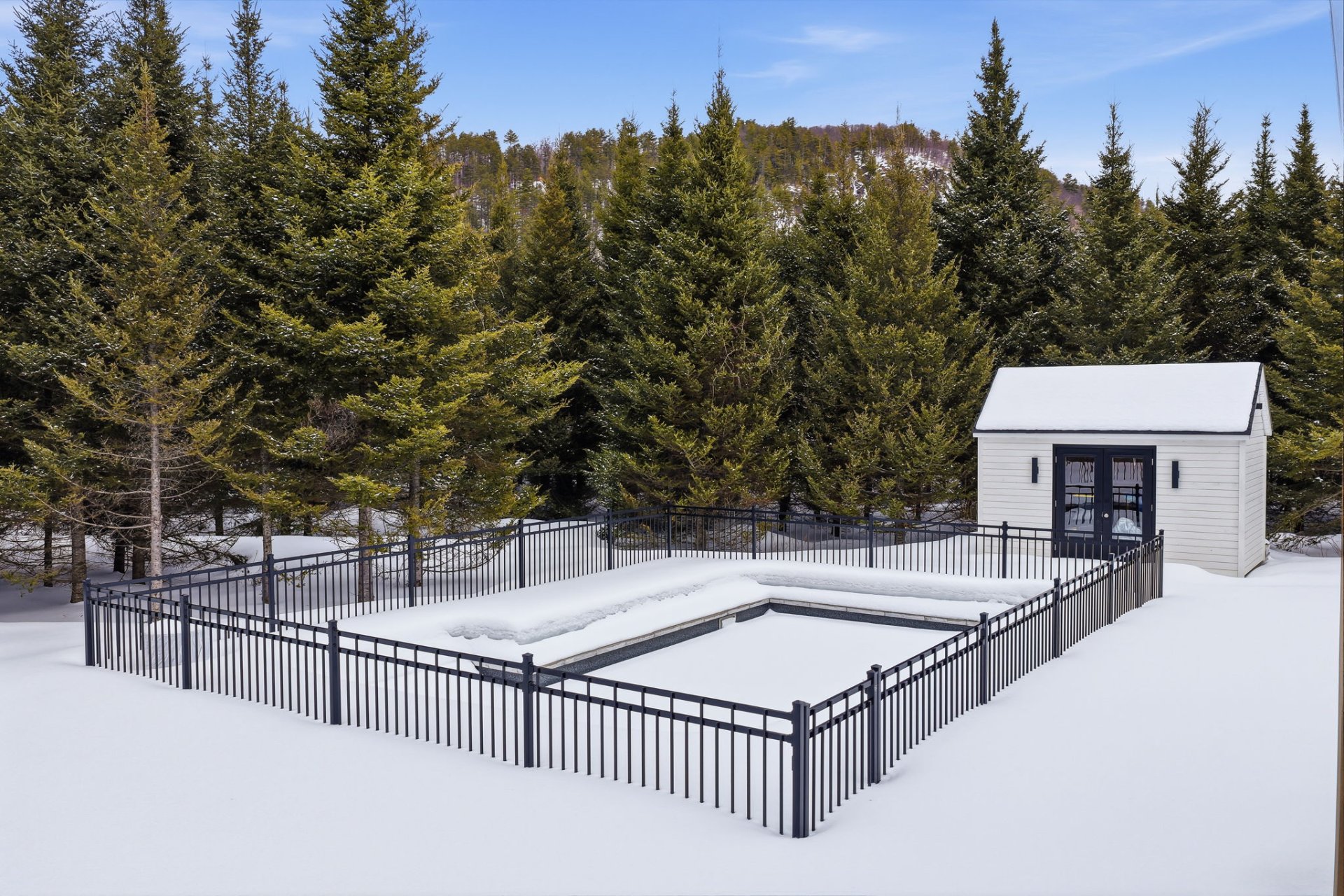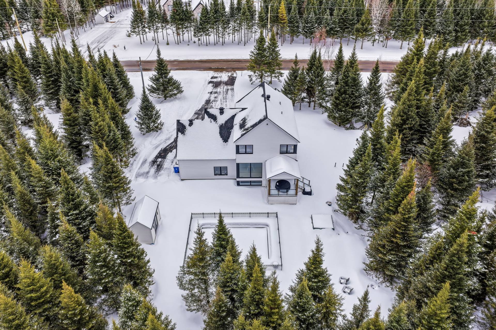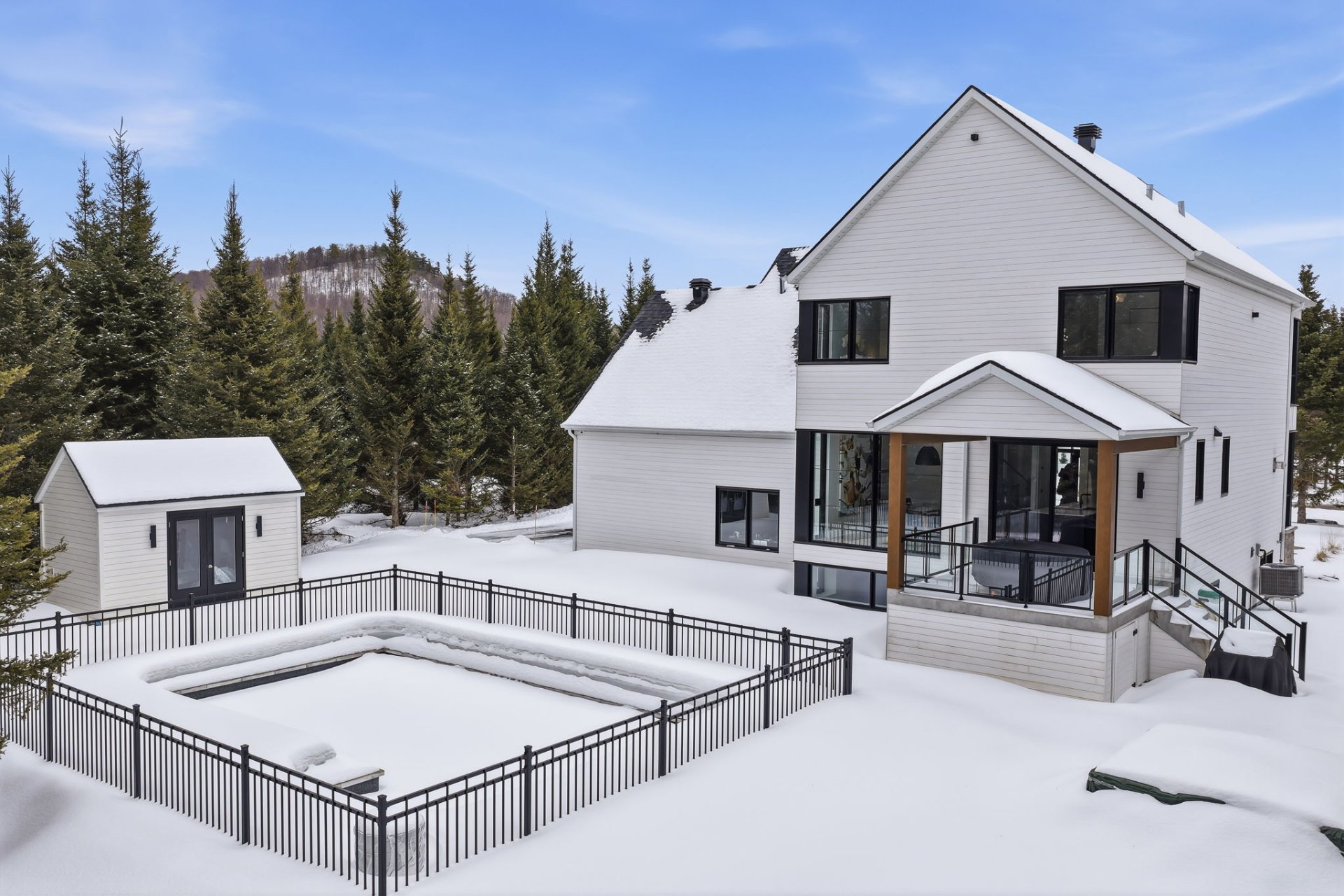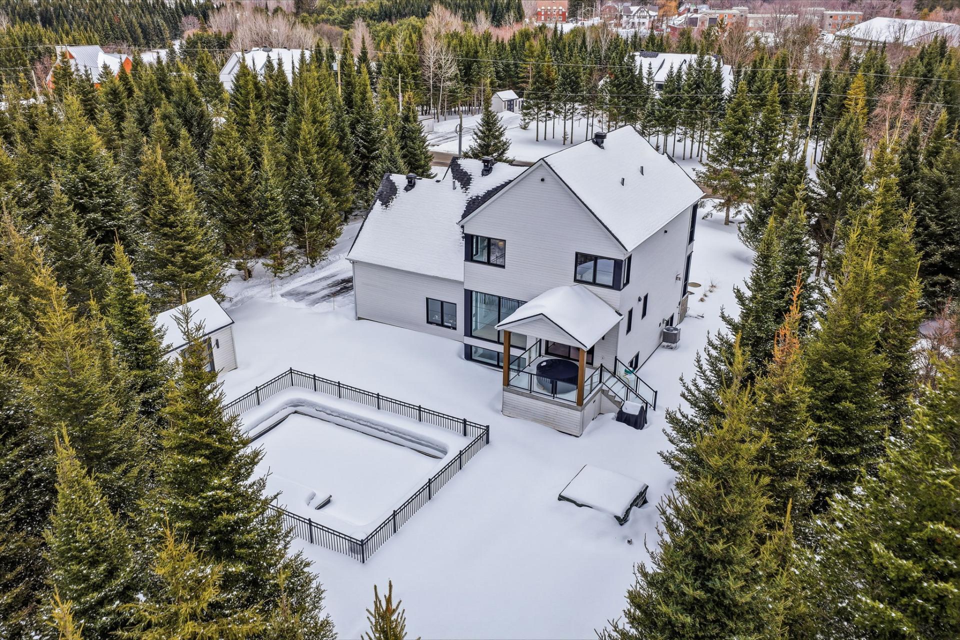 À l'extérieur, l'aménagement a été pensé pour prolonger l'expérience de vie. Une piscine creusée s'intègre harmonieusement à l'environnement et invite à la détente en toute intimité, tandis qu'un cabanon offre un espace de rangement pratique et discret. Un coin feu ainsi qu'une terrasse couverte complètent l'ensemble.