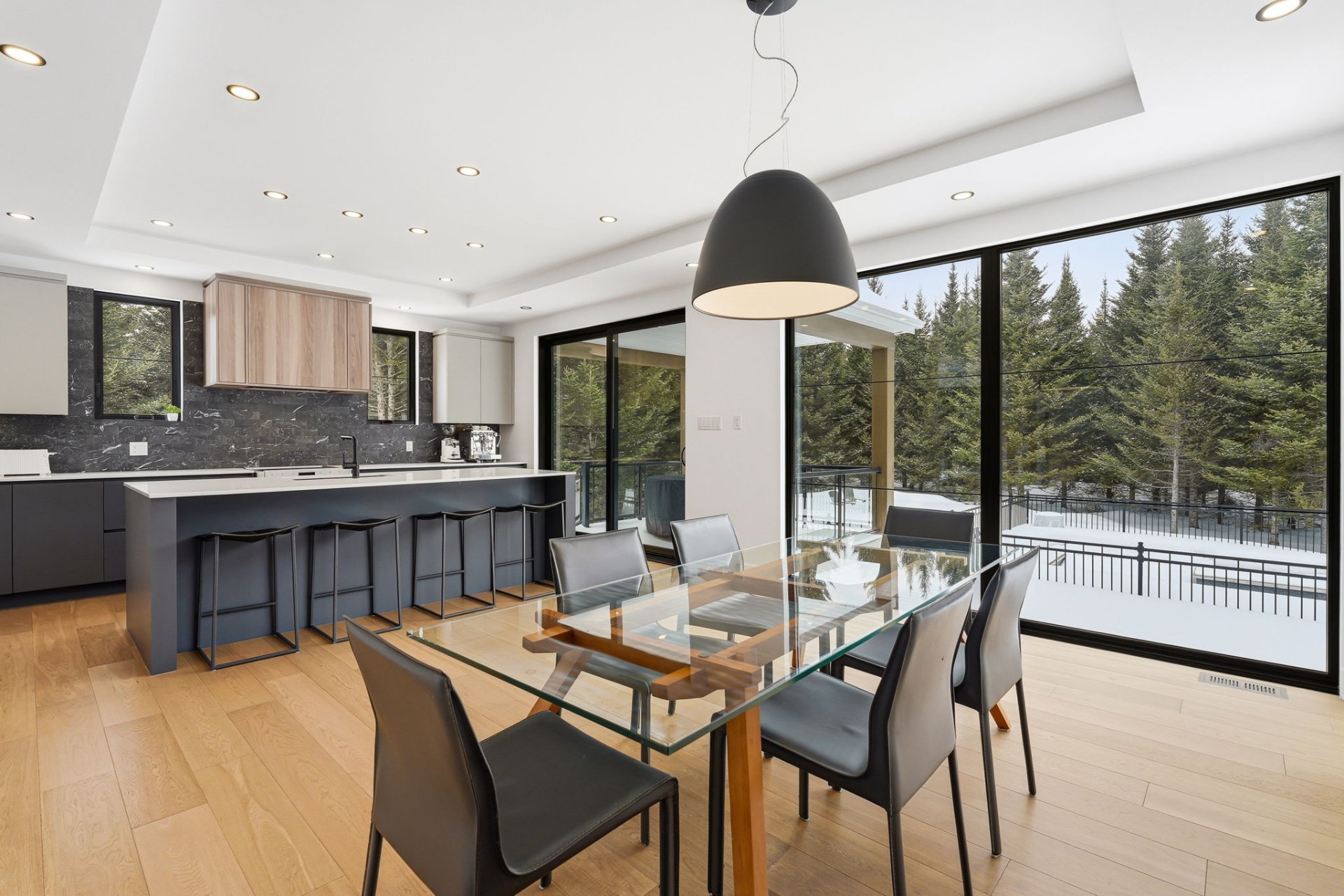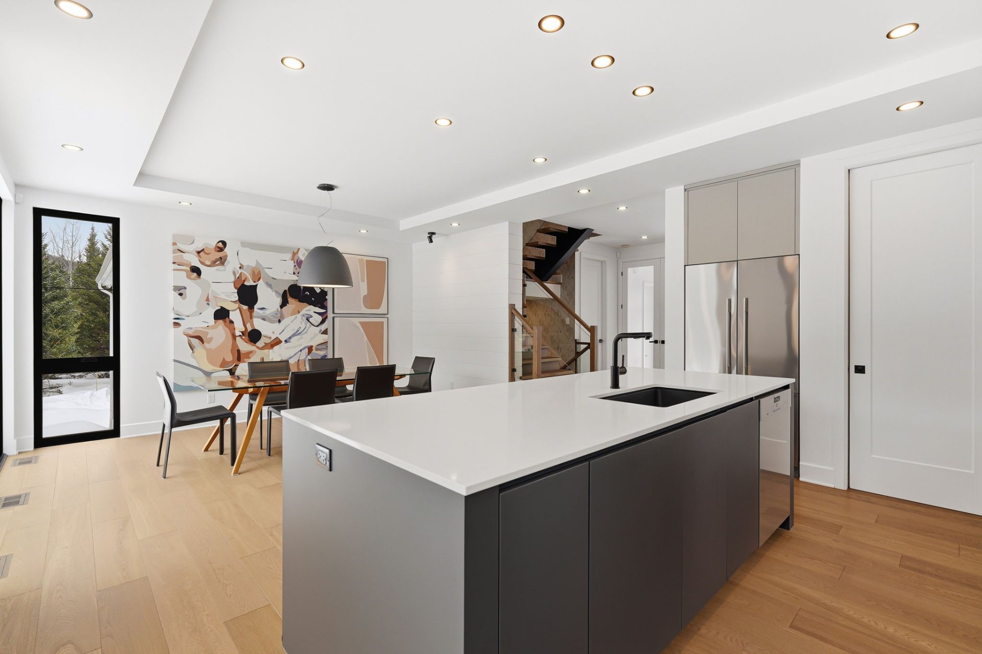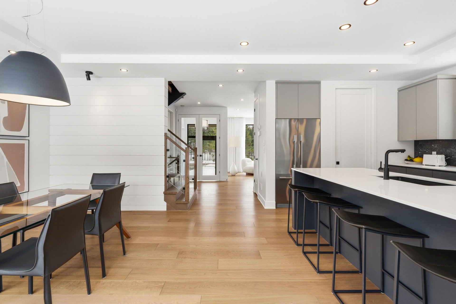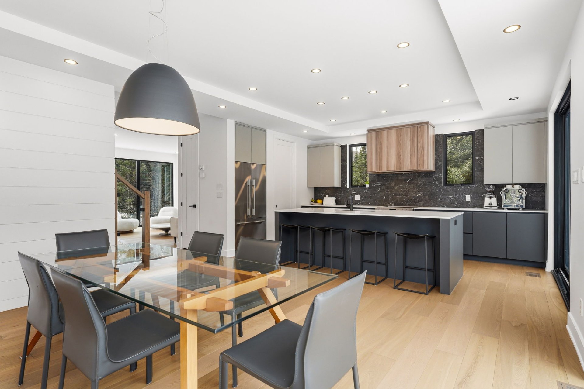 À l'intérieur, les espaces sont baignés de lumière grâce à une fenestration abondante qui laisse entrer une luminosité naturelle généreuse tout au long de la journée, créant une atmosphère à la fois vivante et apaisante. Le rez-de-chaussée propose une aire de vie ouverte où le salon s'articule autour d'un foyer habillé de pierre. La cuisine, au design chic et moderne, marie fonctionnalité et esthétisme avec son îlot central surdimensionné et ses finitions haut de gamme. Elle s'ouvre naturellement sur la salle à manger, créant un espace convivial idéal pour recevoir. Une salle d'eau complète ce niveau.
