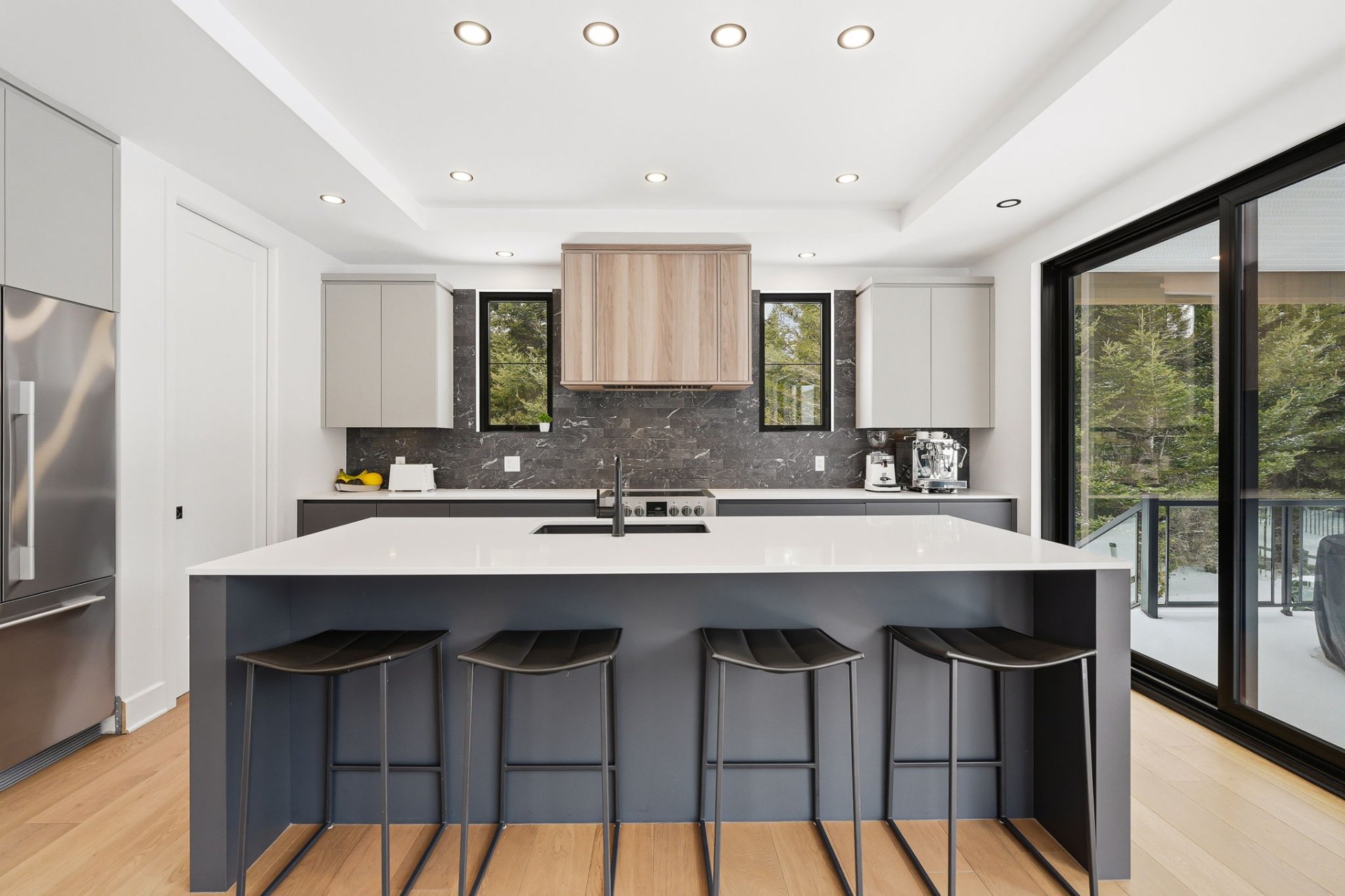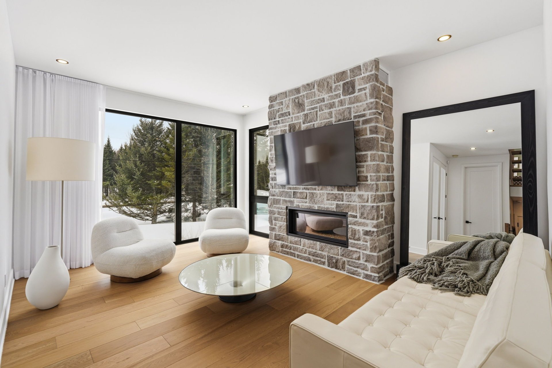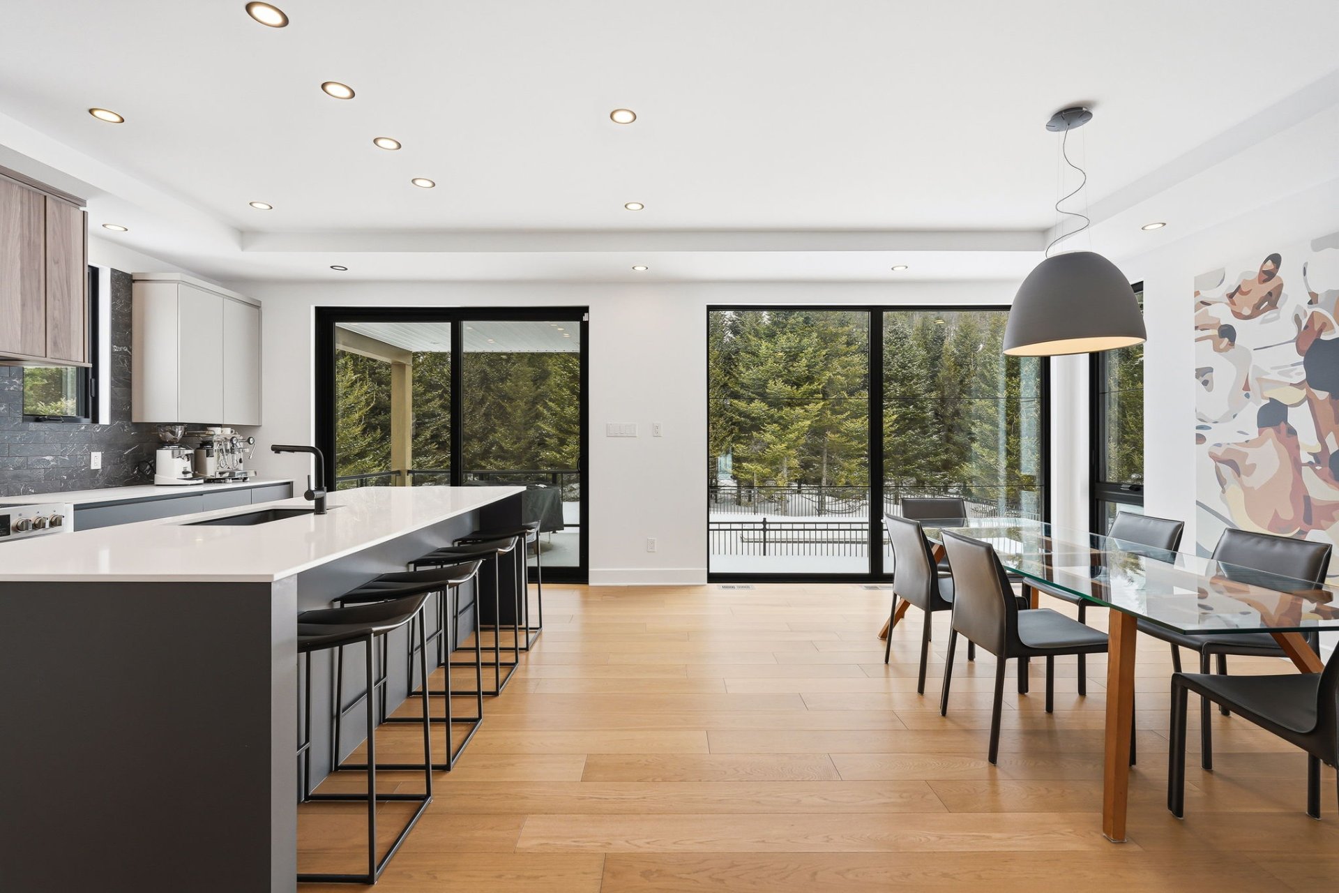À l'intérieur, les espaces sont baignés de lumière grâce à une fenestration abondante qui laisse entrer une luminosité naturelle généreuse tout au long de la journée, créant une atmosphère à la fois vivante et apaisante. Le rez-de-chaussée propose une aire de vie ouverte où le salon s'articule autour d'un foyer habillé de pierre. La cuisine, au design chic et moderne, marie fonctionnalité et esthétisme avec son îlot central surdimensionné et ses finitions haut de gamme. Elle s'ouvre naturellement sur la salle à manger, créant un espace convivial idéal pour recevoir. Une salle d'eau complète ce niveau.